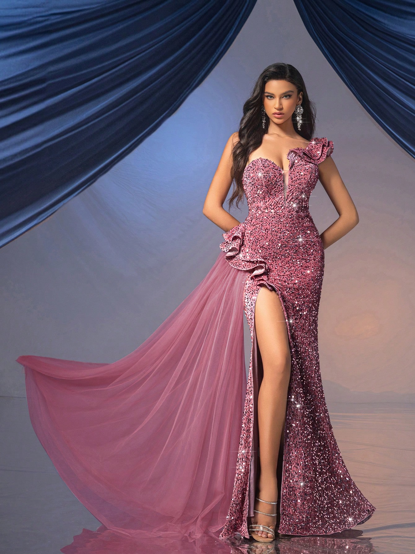 Dreamy Women One-Shoulder Pleated Split Split Gown Dresses For Graduation Party, Prom, Evening Party
