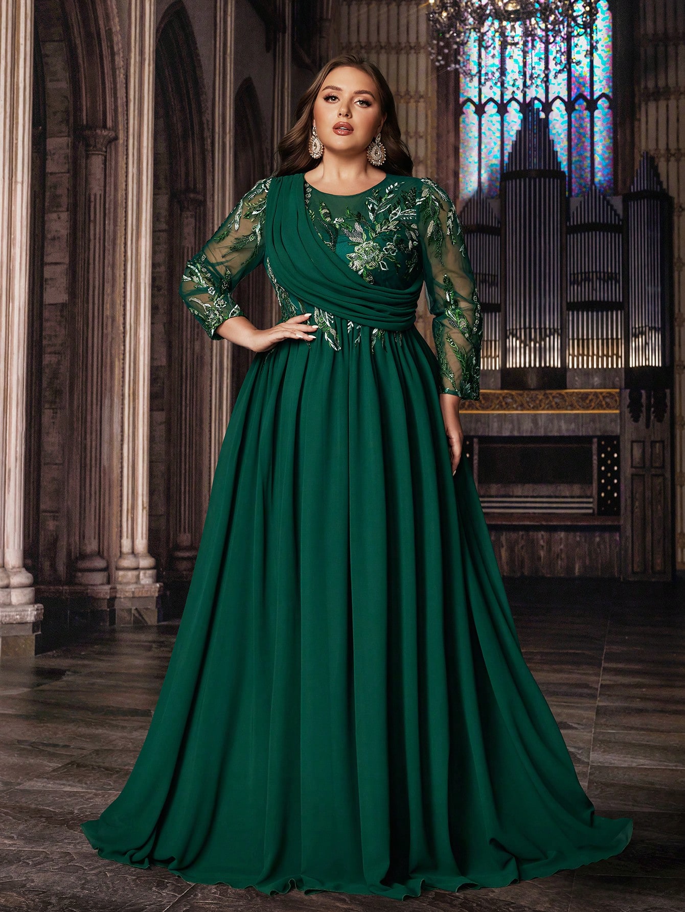 Fashion Temperament Plus Size Ladies Solid Color Applique Scoop Neck Long Sleeve Chiffon Gown Dresses