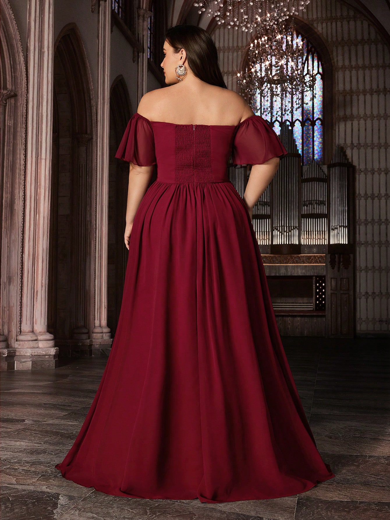Romantic Solid Color Plus Size Women Formal Dress Bridesmaid Evening Dresses Suitable Wedding,Birthday Party, Formal Events V-Neck Flounce Sleeve Gown
