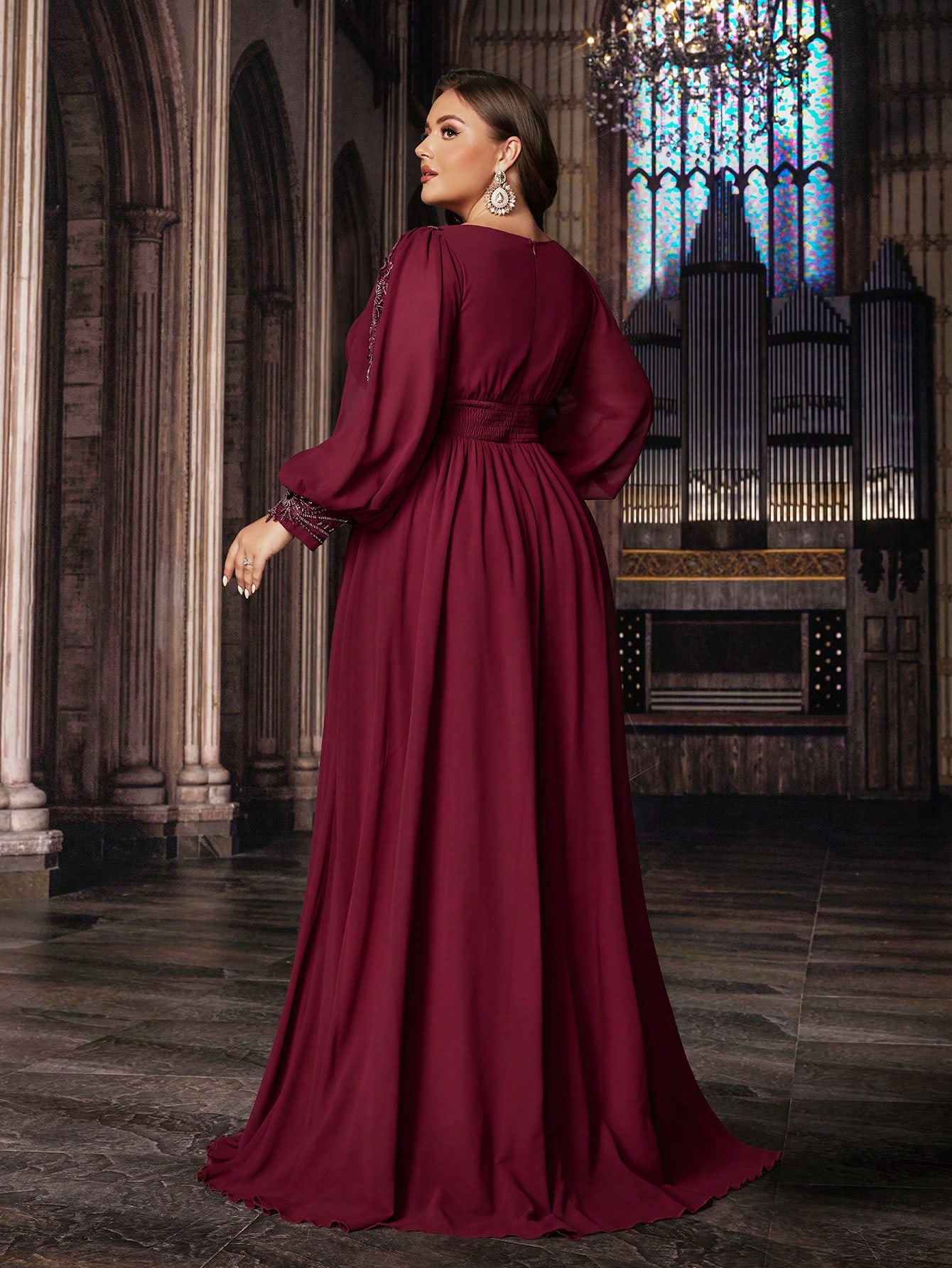 Women's Plus-size High-end Burgundy Evening Gown with Bright Stitching,V-neck Lantern Sleeves Prom Party Dress,Elegant Ruffle Wedding Guest Dress,Bridesmaid Dress,Perfect Birthday Dress,Cocktail Maxi dress,Christmas Celebration Dress,A-line Formal Dress