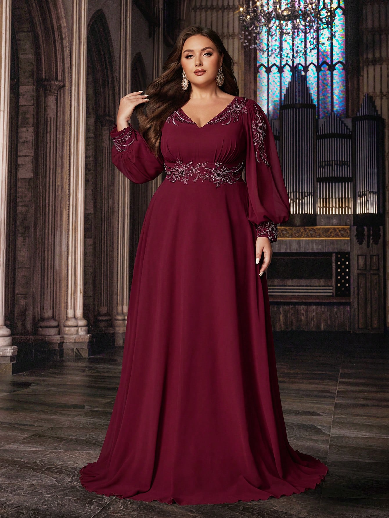 Dignified Elegant Plus Size Applique Party Evening Gown Upscale Women Chiffon Formal Dress For Evening Party, Cocktail, Birthday Party, Galas, Charity Prom, Concert Wine Red Color Long Sleeve V-Neck Floor Length Dresses