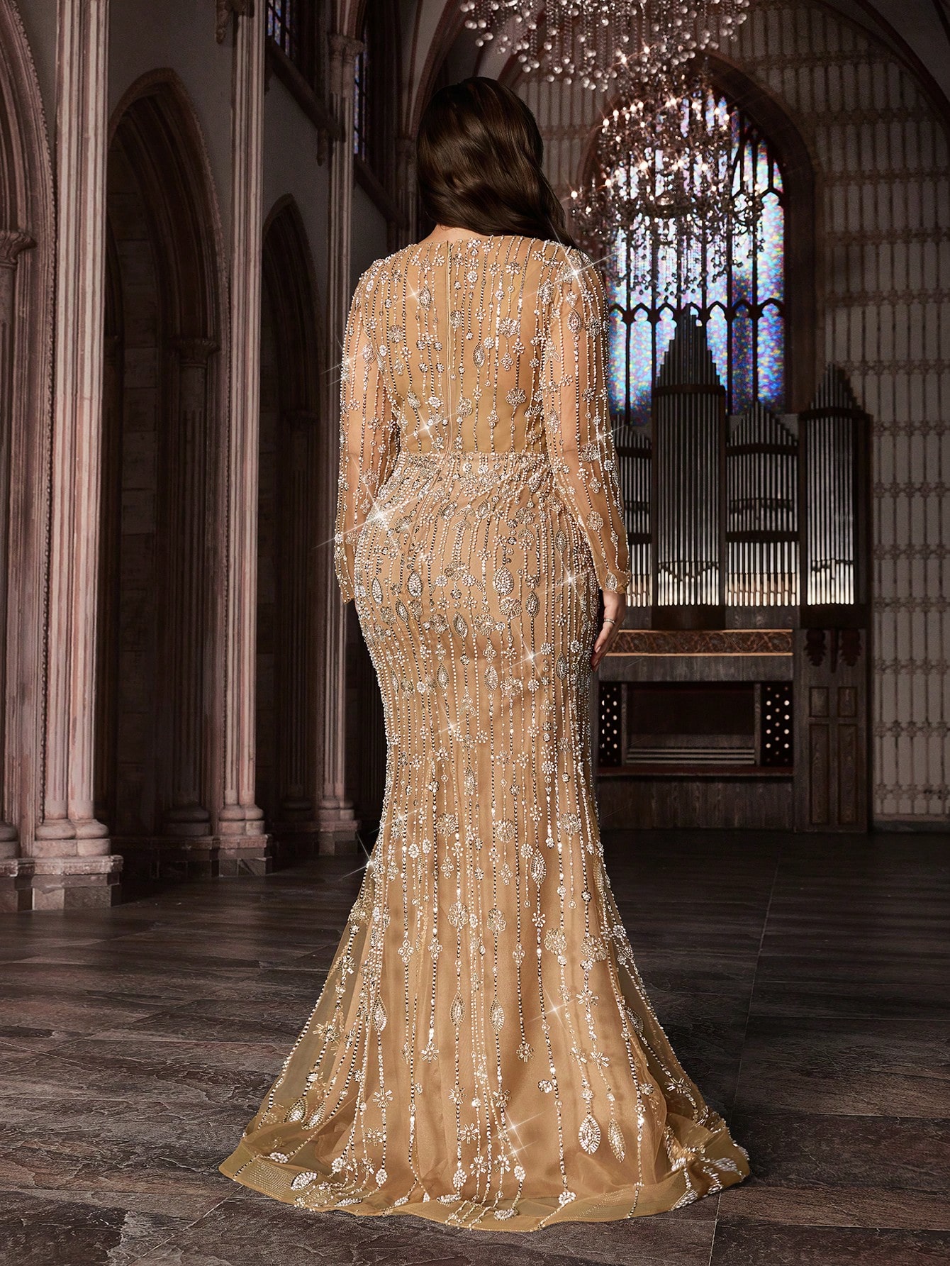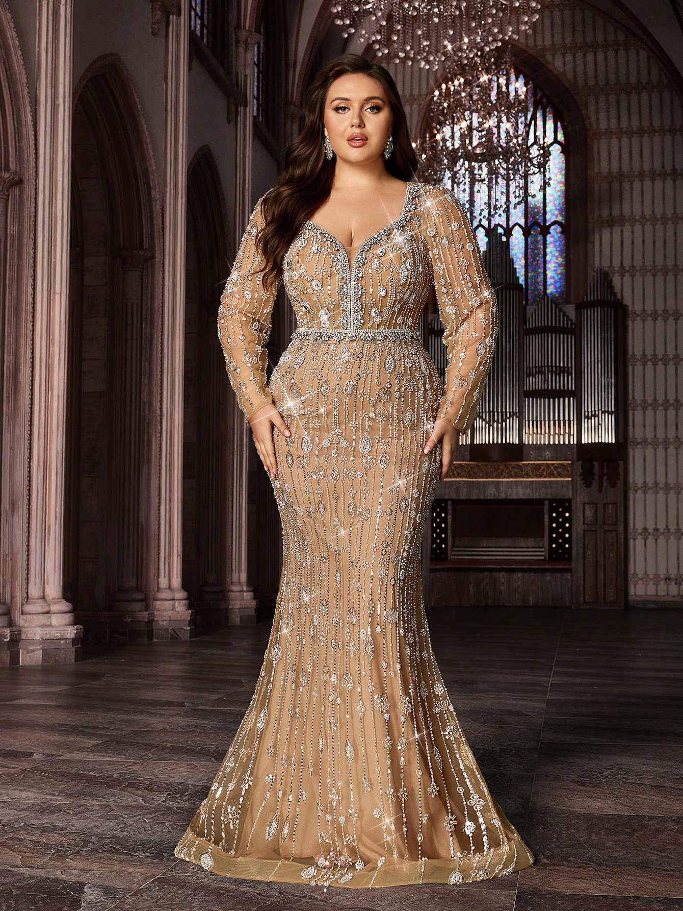Sparkling Glamorous Champagne Color Plus Size Sequin Long Sleeve Mermaid Hem Gown Dress (Heavily Embellished)