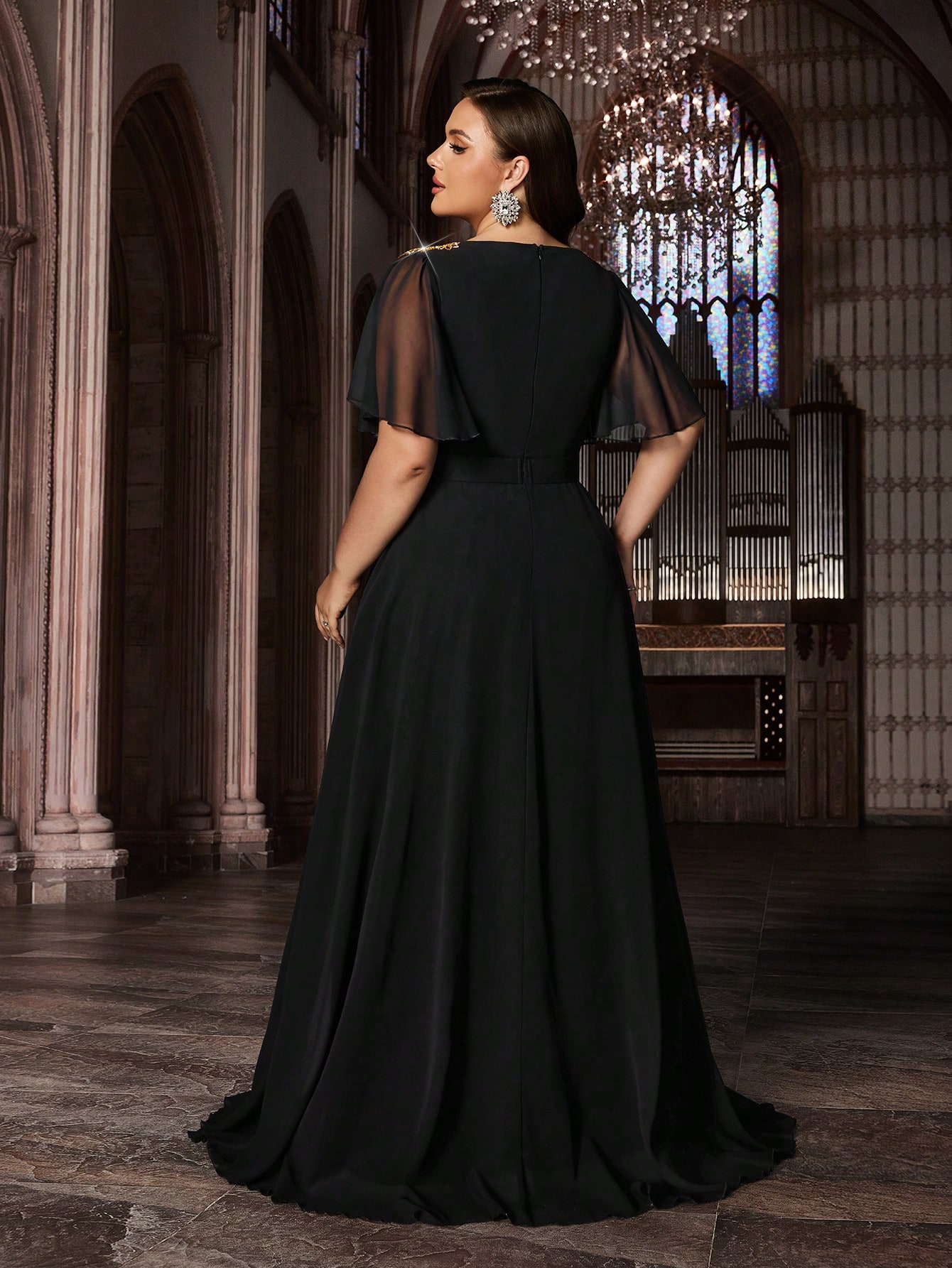 Trendy Curve Women Chiffon Banquet Formal Dress Appliques Party Evening Gown Plus Size Black Deep V-Neck Flounce Sleeves Maxi Dresses