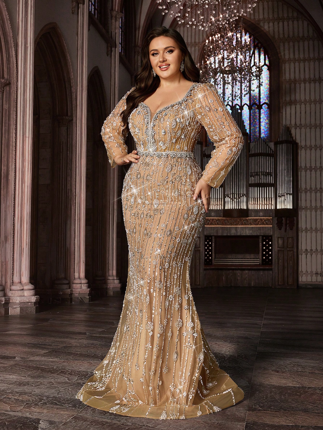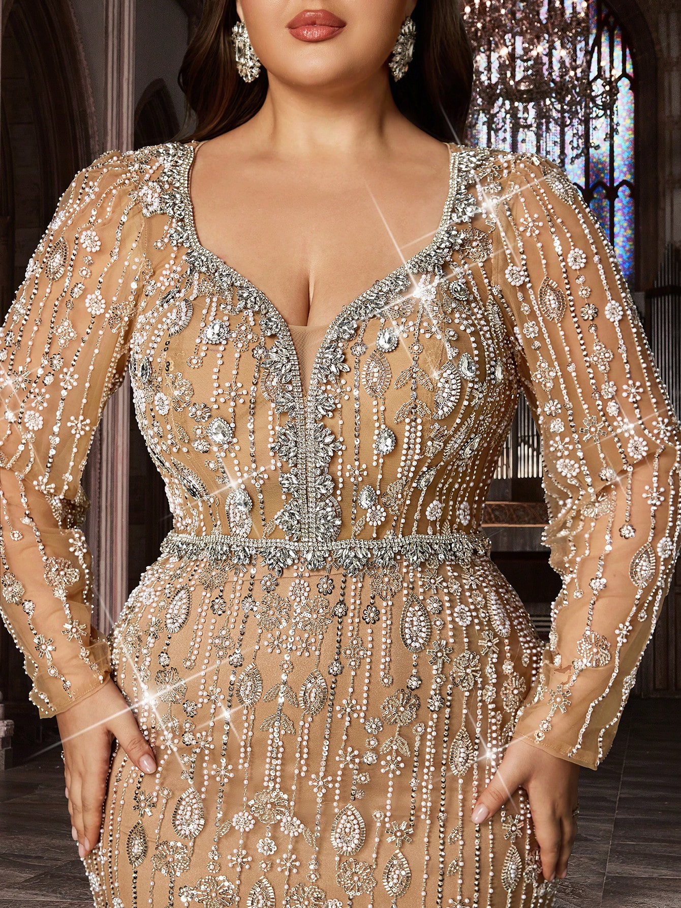 Elaborate Plus Size Sweetheart Neckline Long Regular Sleeves Zipper Maxi Formal Dress Featuring Rhinestone Sequin Contrast Mesh Details Evening Gown