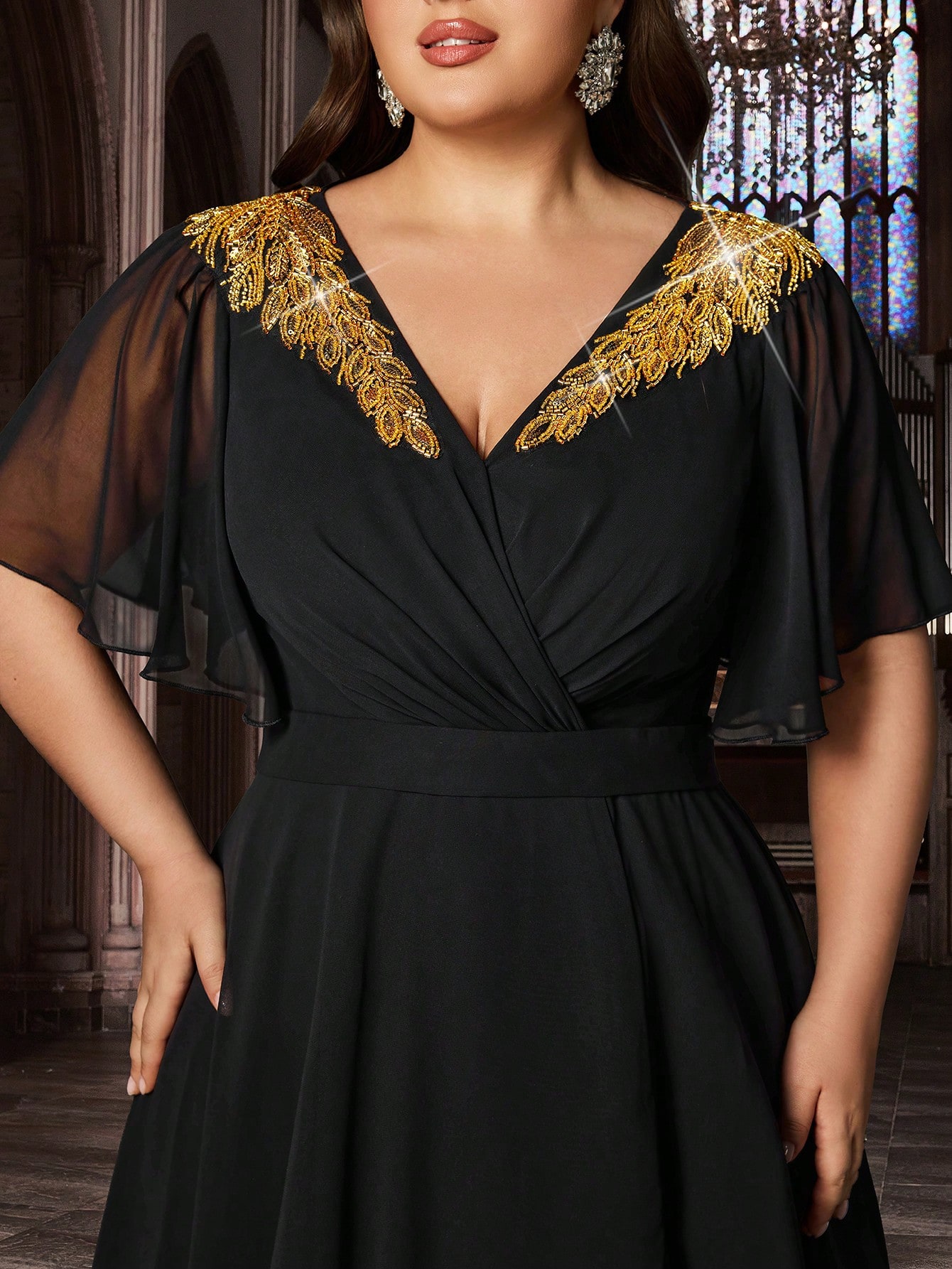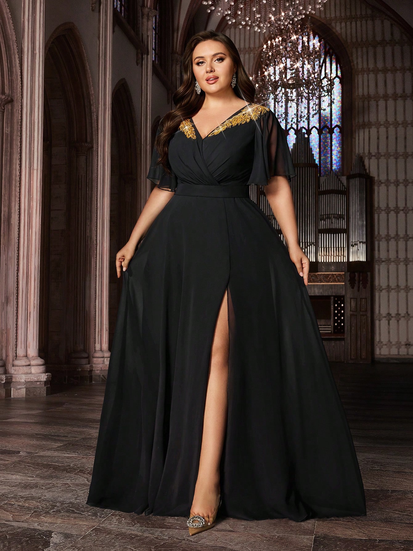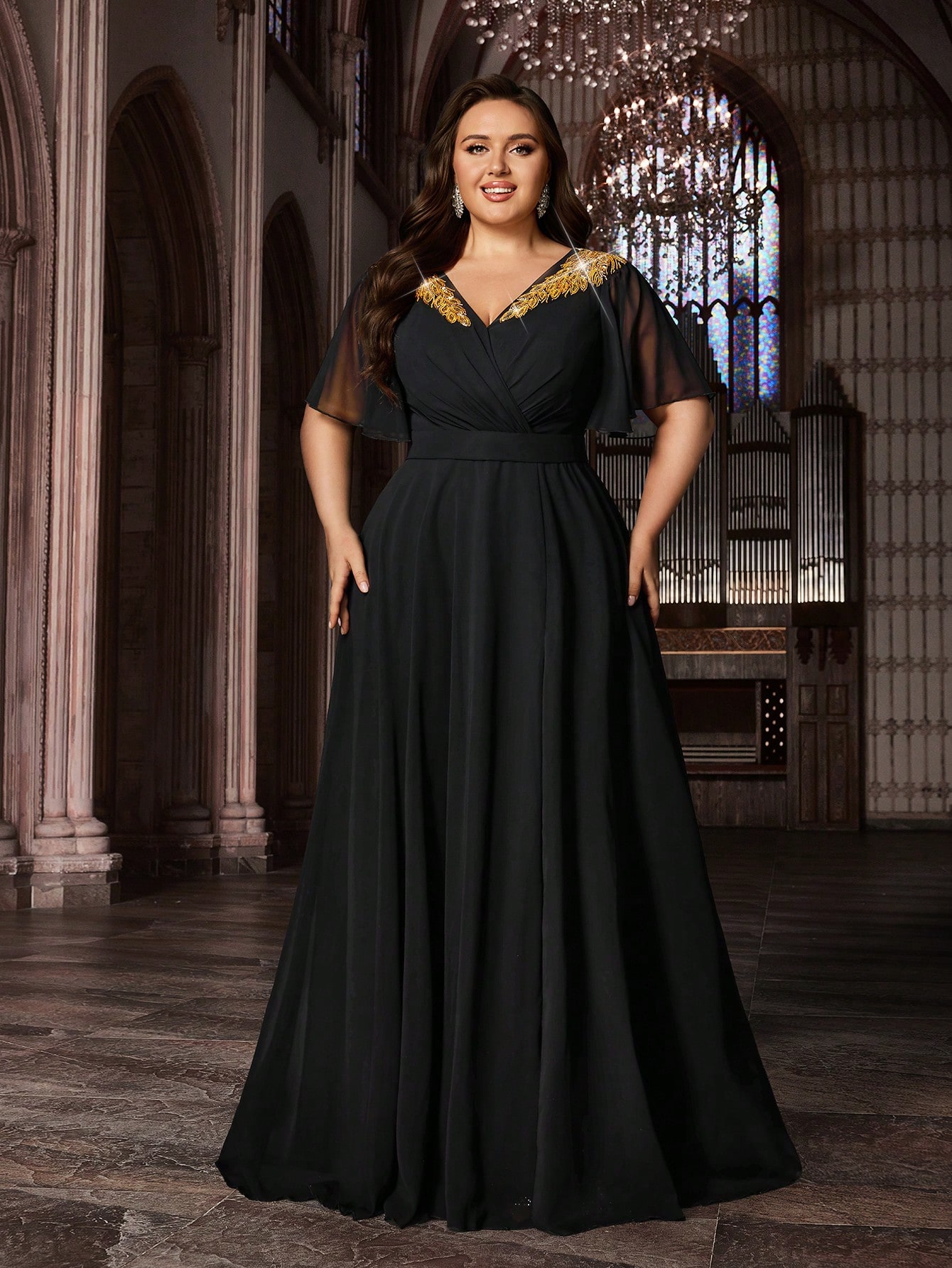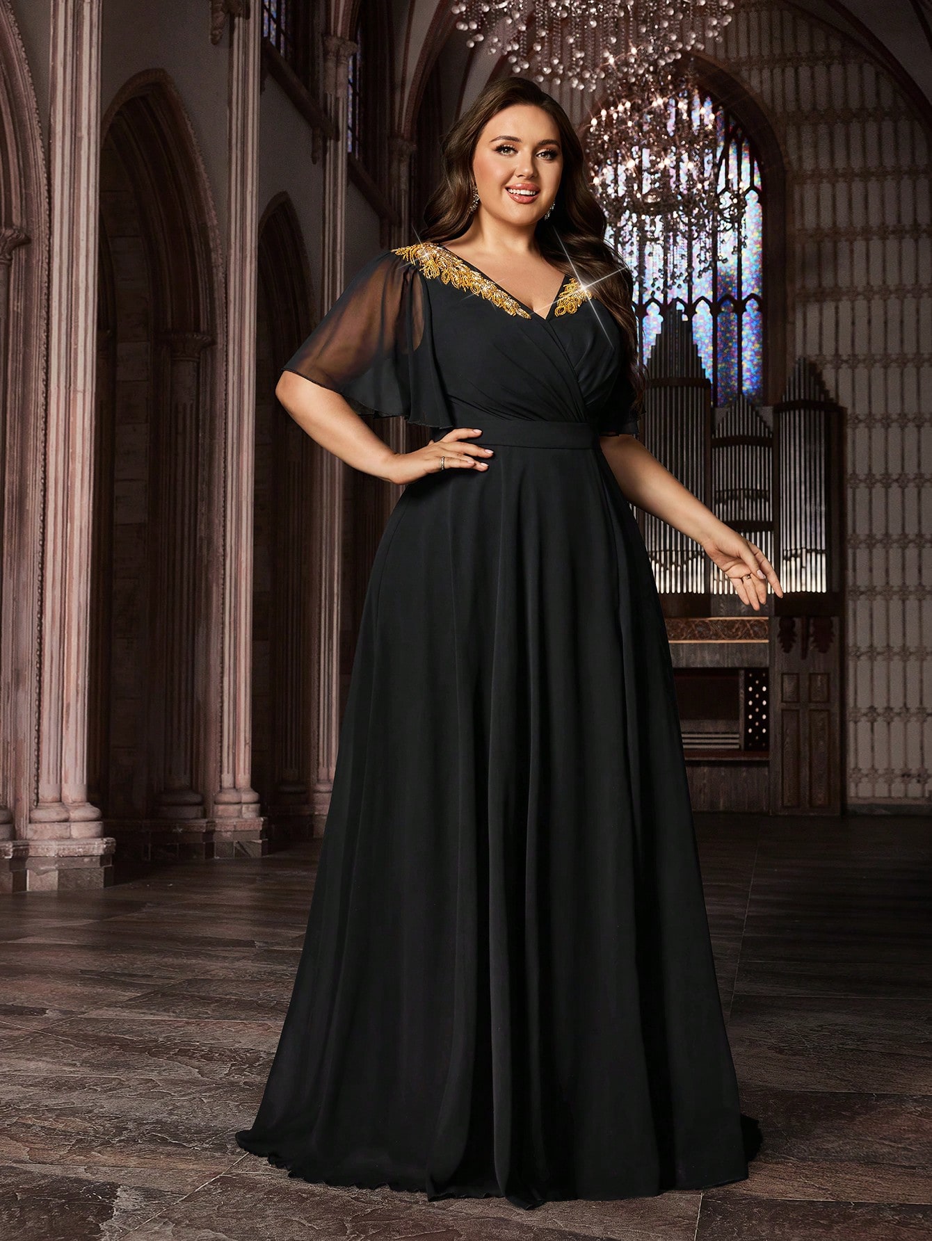Trendy Curve Women Chiffon Banquet Formal Dress Appliques Party Evening Gown Plus Size Black Deep V-Neck Flounce Sleeves Maxi Dresses