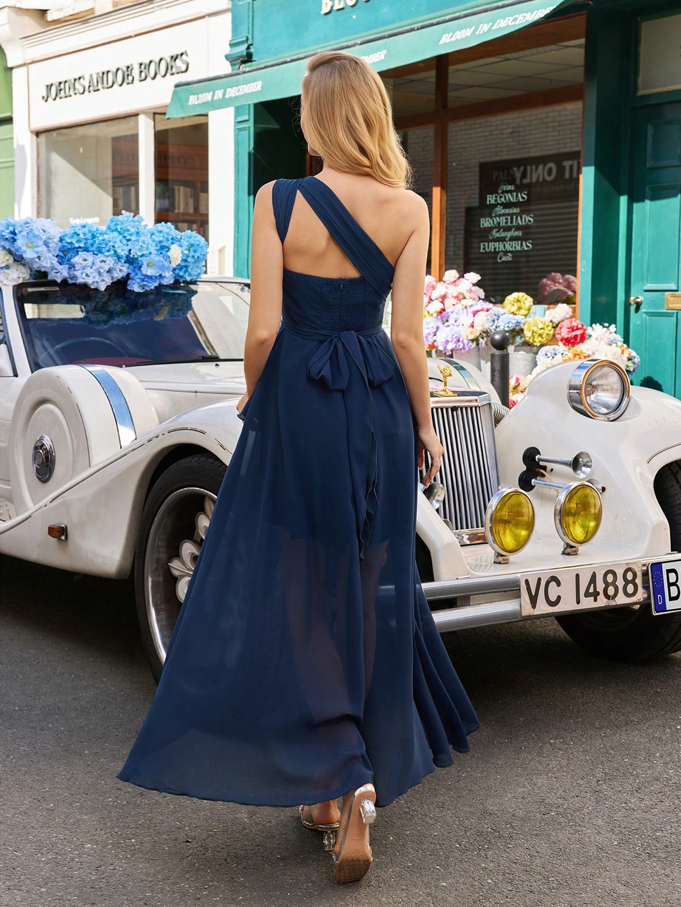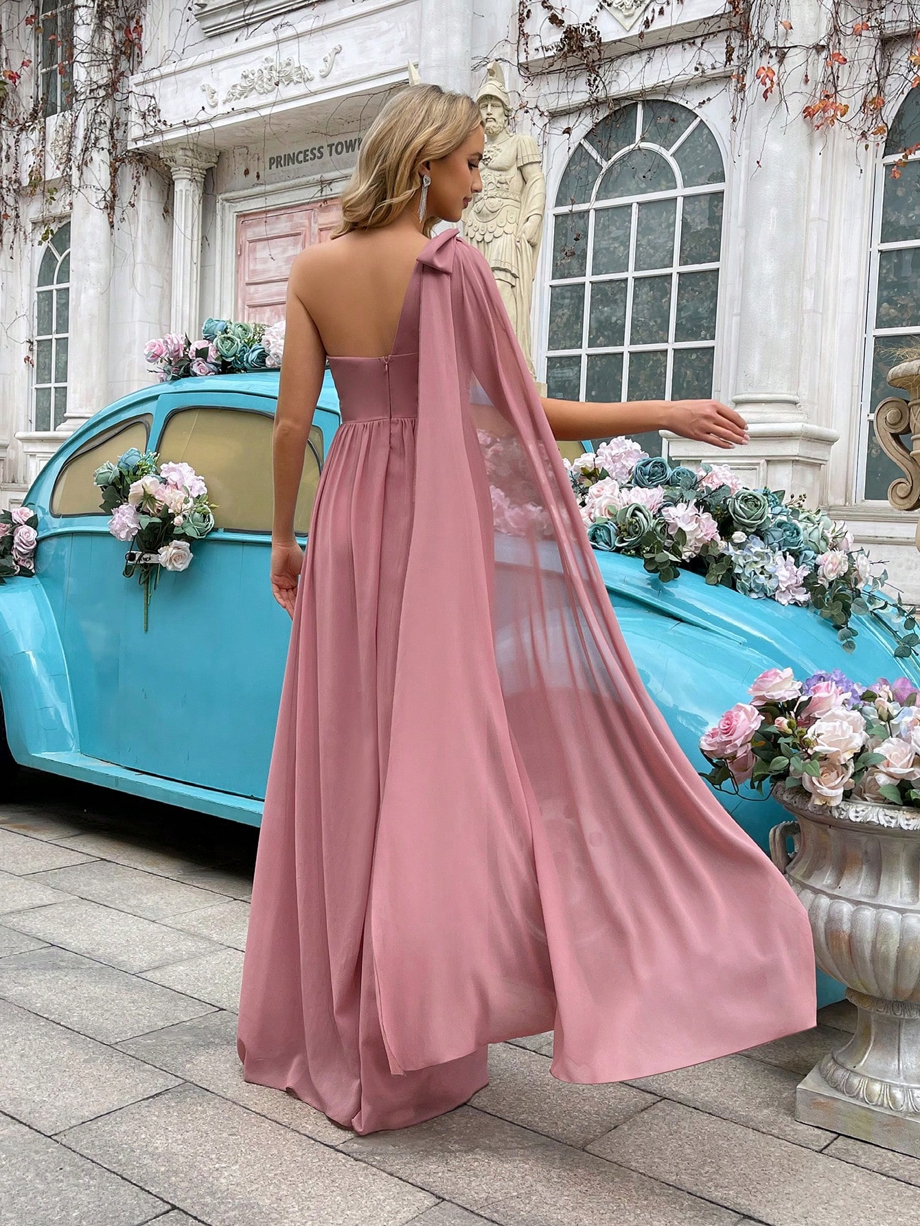 Sweet Romantic Bow Embellished Women Formal Dress Summer Elegant Bridesmaid Gown For Romantic Weddings, Chic Bridesmaid, Dinners, Engagement Party Pink One Shoulder High Slit Bridesmaid Long Dresses