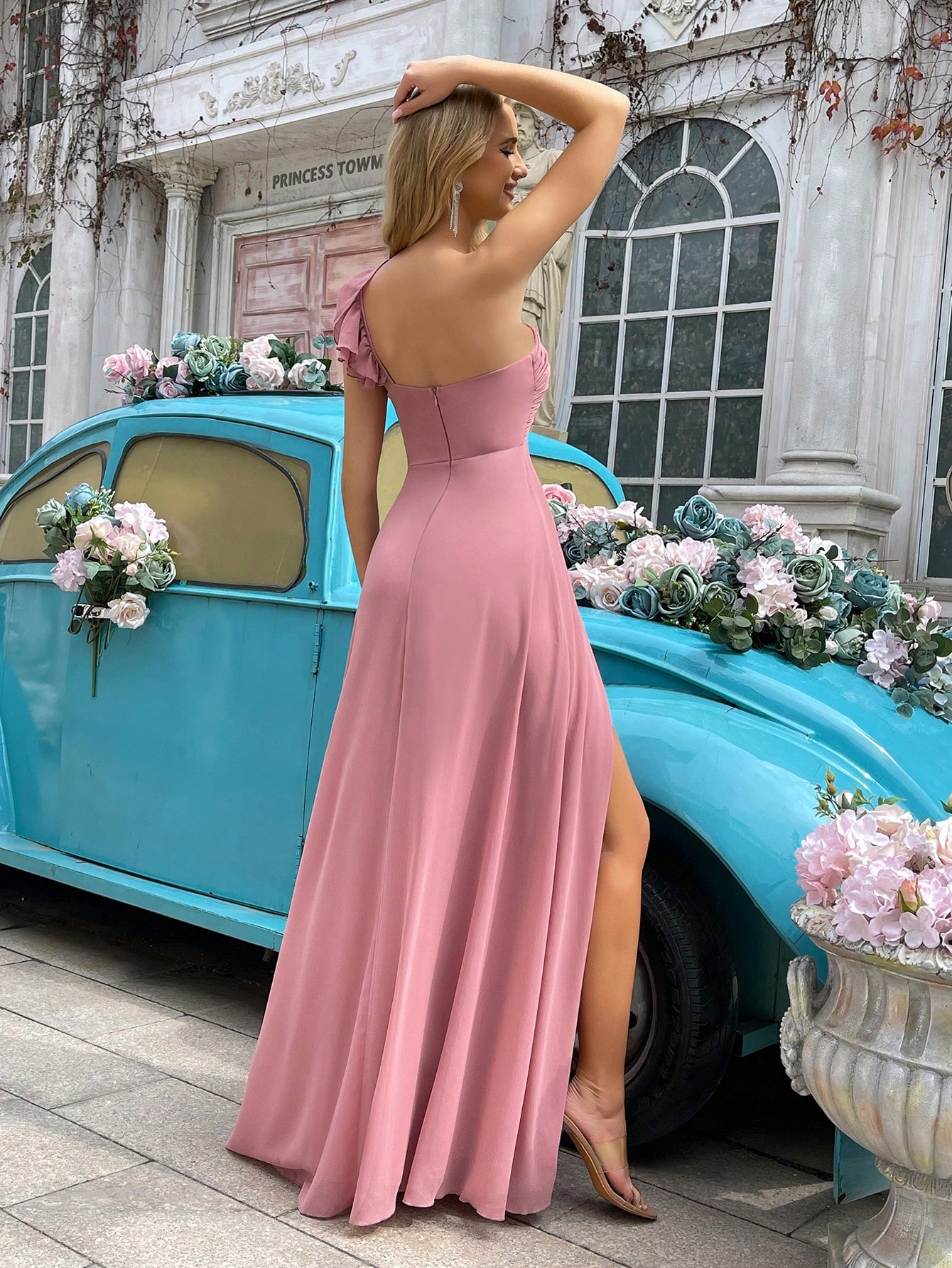 Sweet Elegant Pink One Shoulder Ruffle Slit Bridesmaid Gown Dresses Dresses