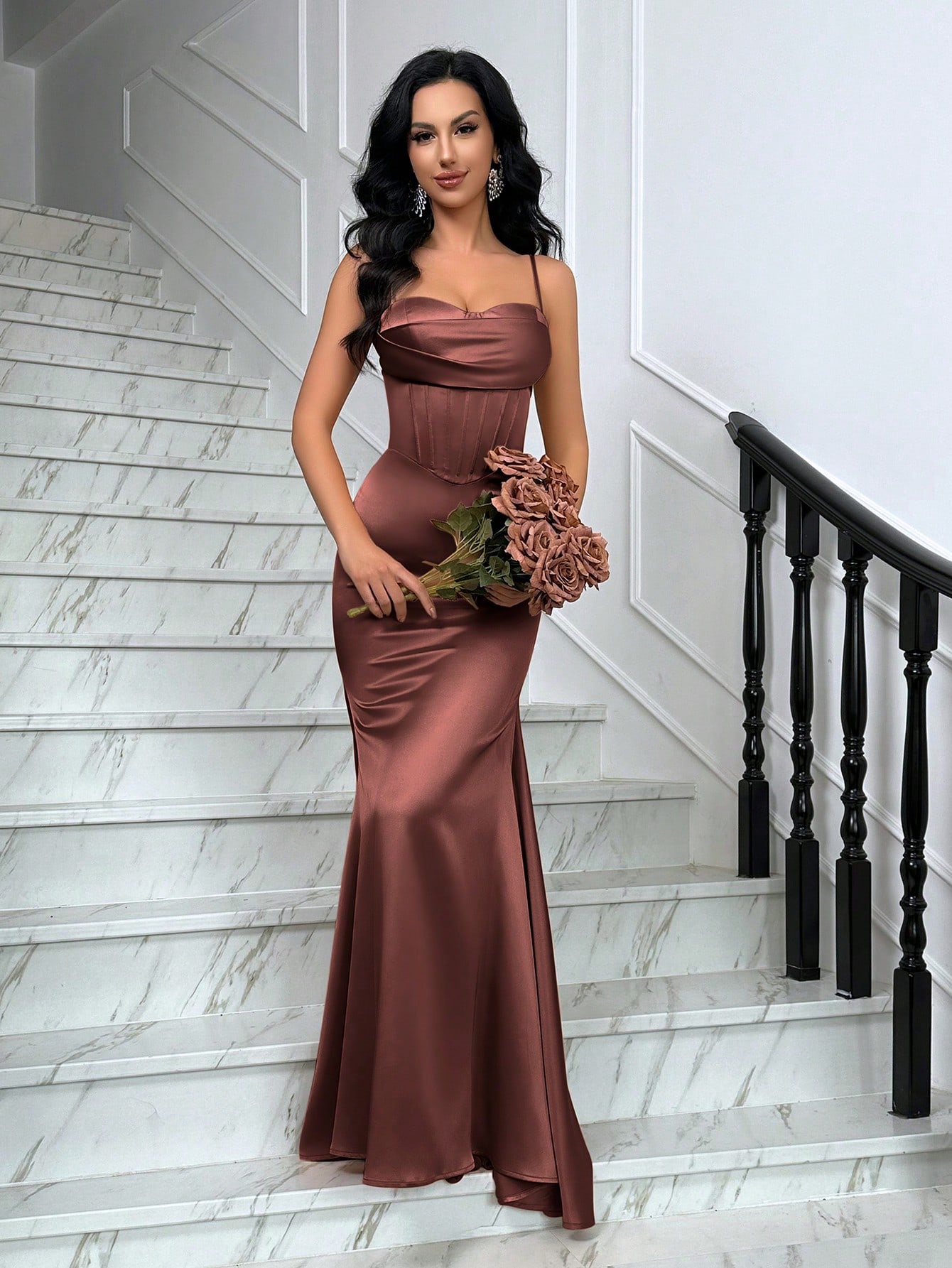 Fancy Fishtail Extra Long Spaghetti Strap Halter Solid Color Satin Gown Dress For Dinner Party