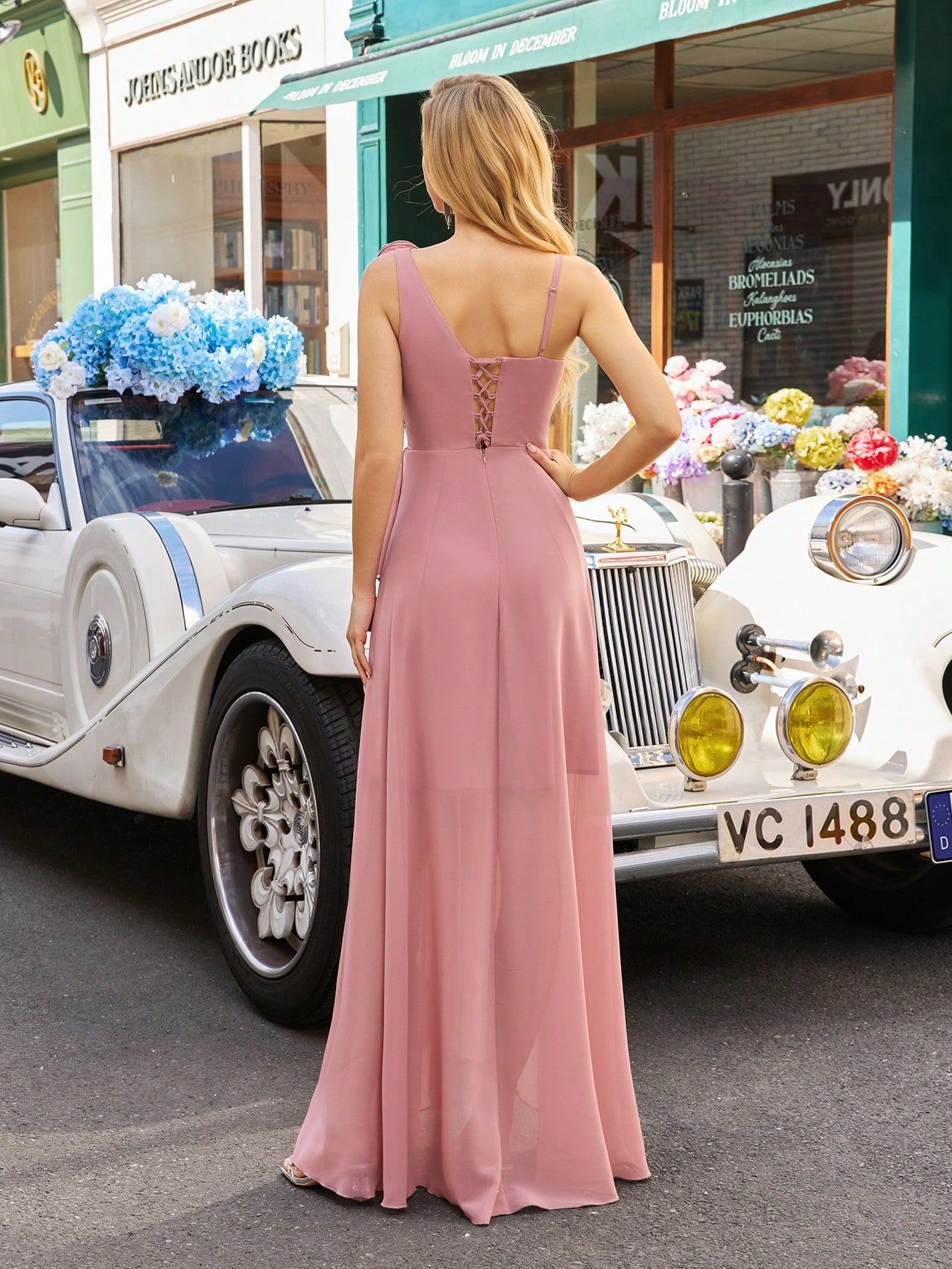 Elegant Women Summer Solid Color Formal Dress Evening Gown Bridesmaid Dresses Suitable Bridesmaid Wedding Guests For Wedding, Formal Events, Parties Chiffon Flutter High Slit Long Dress