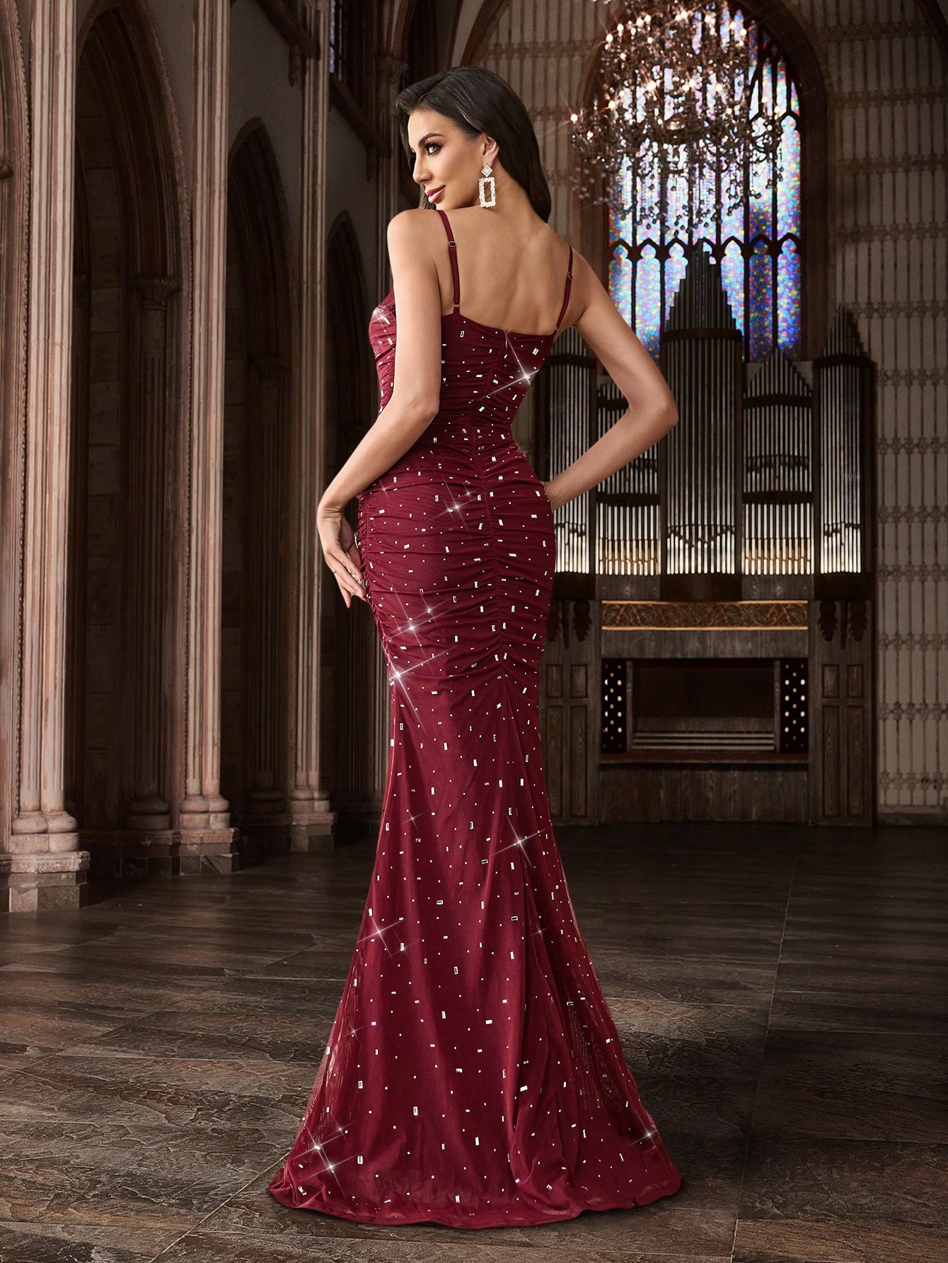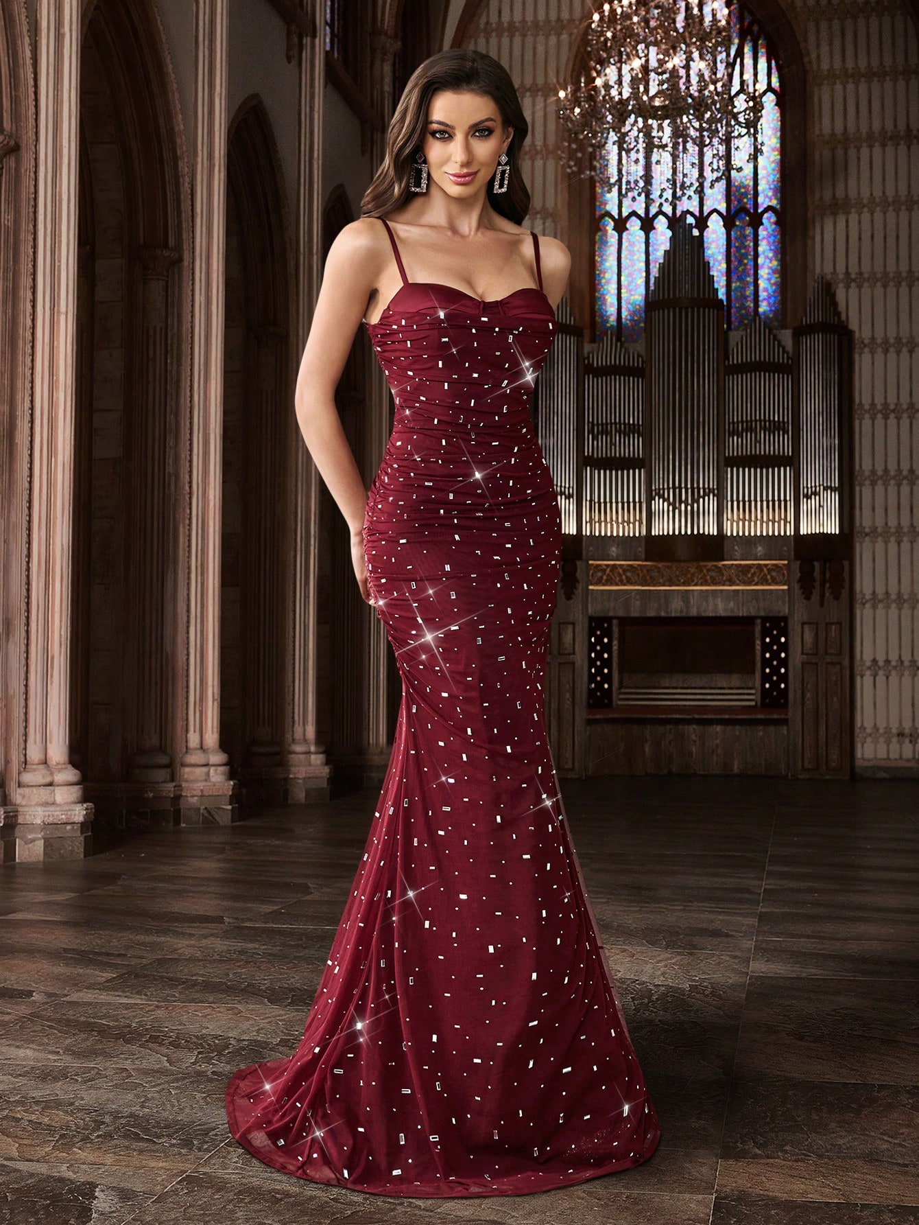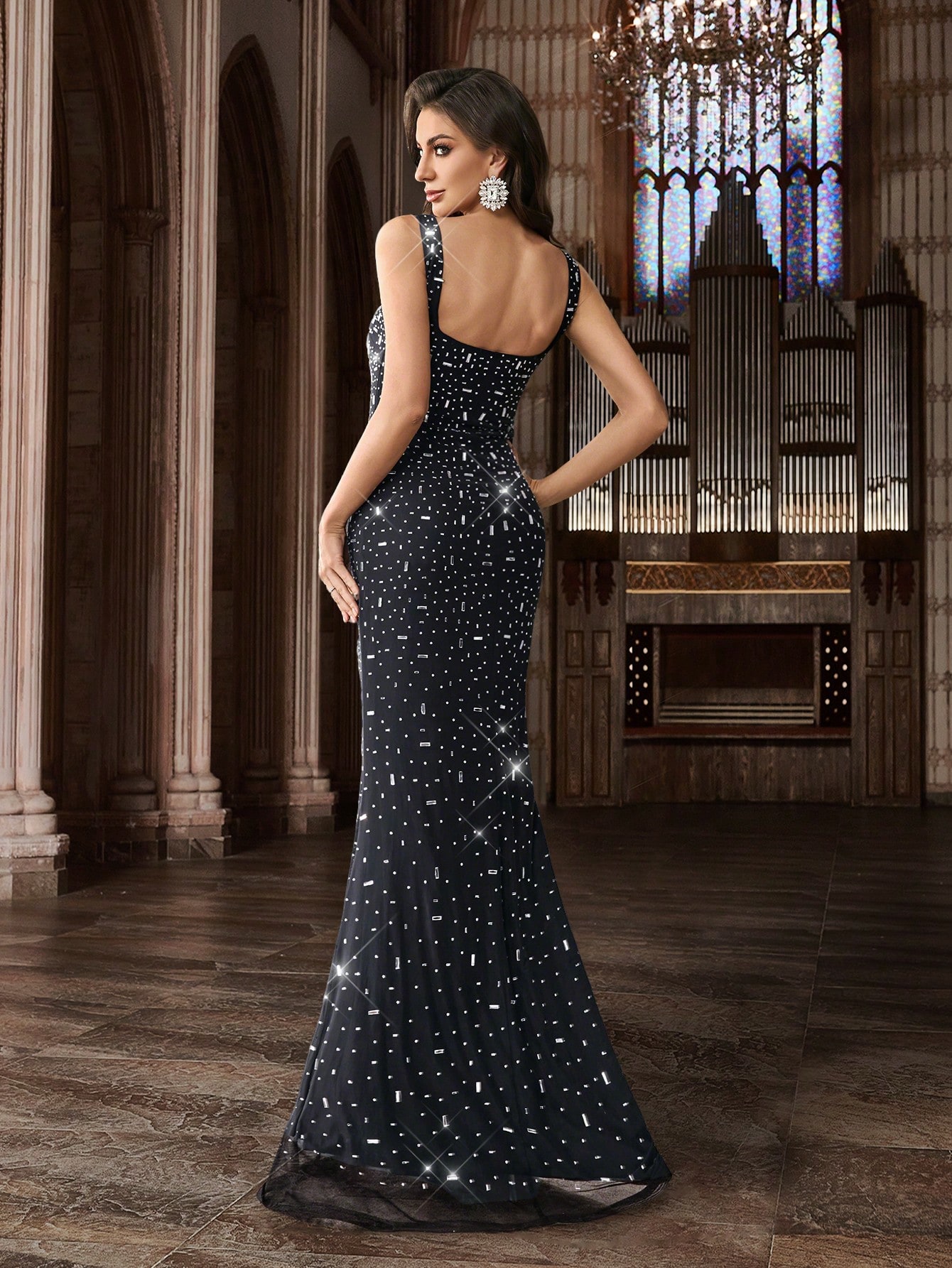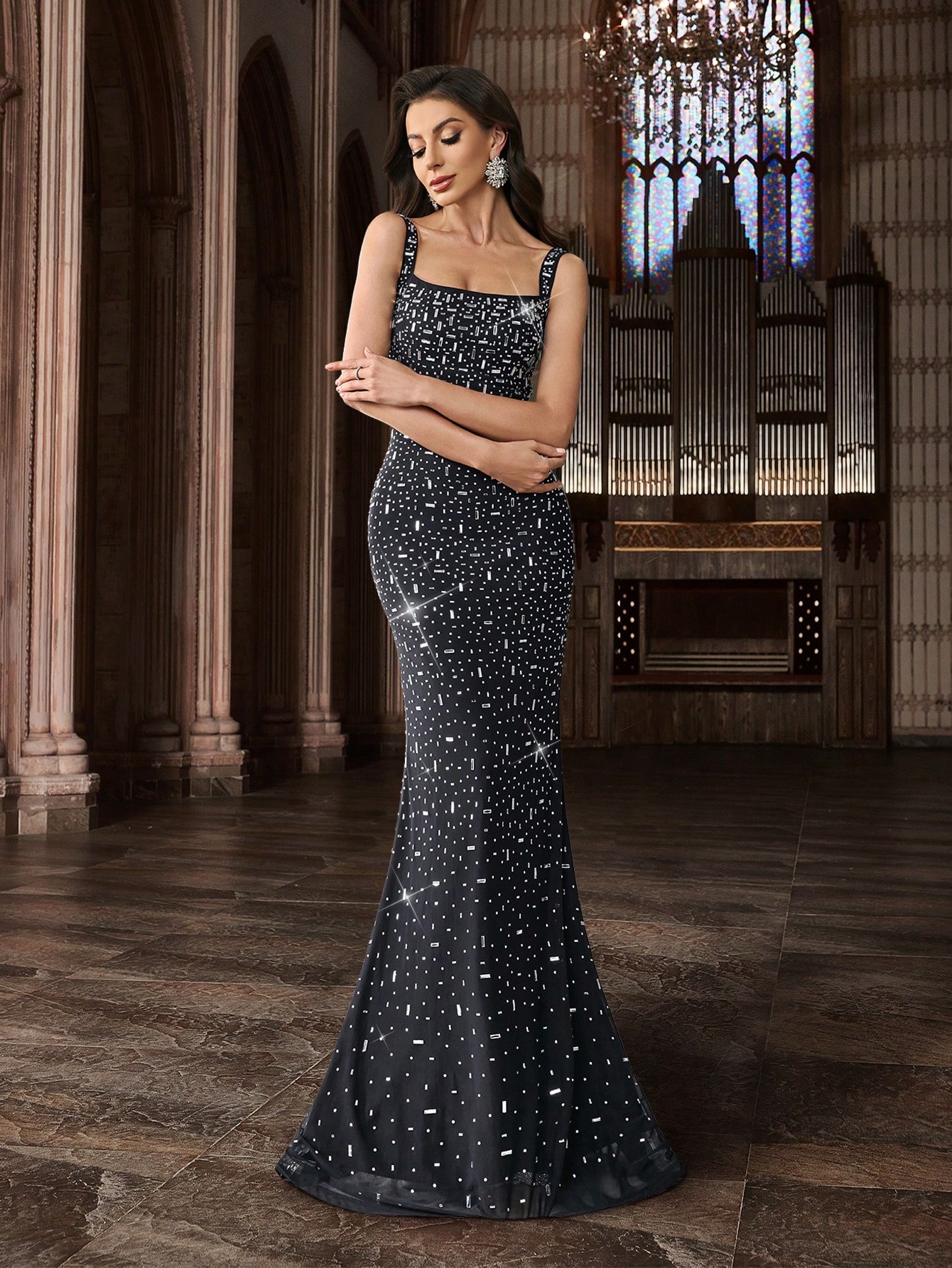Women's Square Neck Sequin Beaded Mermaid Formal Evening Dress Spaghetti Strap Bodycon Prom Party Cocktail Maxi Gown