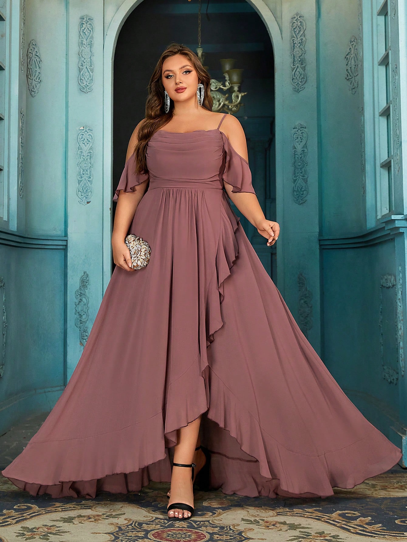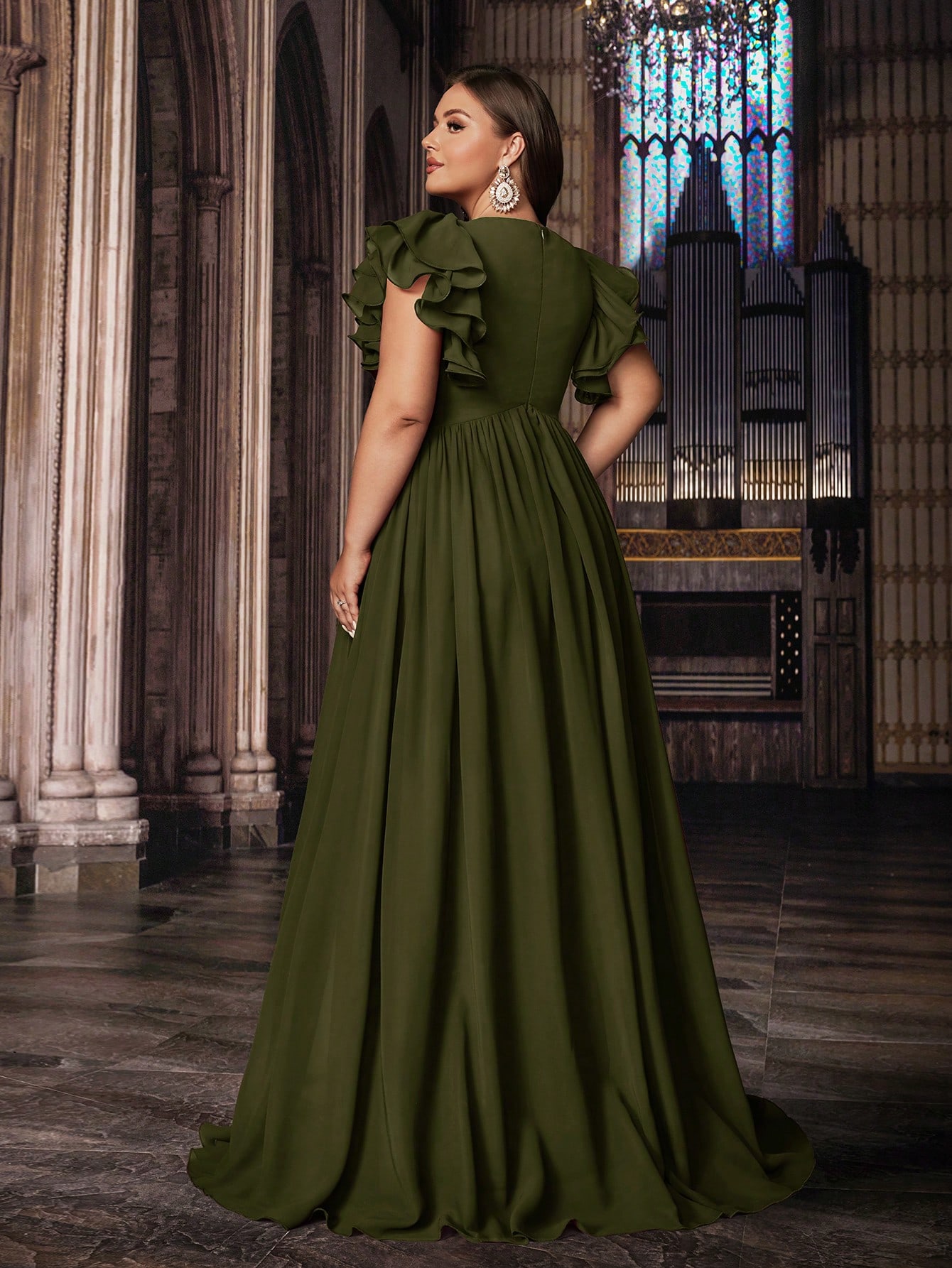 Romantic Solid Color Plus Size Women Formal Dress Bridesmaid Evening Dresses Suitable Wedding,Birthday Party, Formal Events V-Neck Flounce Sleeve Gown