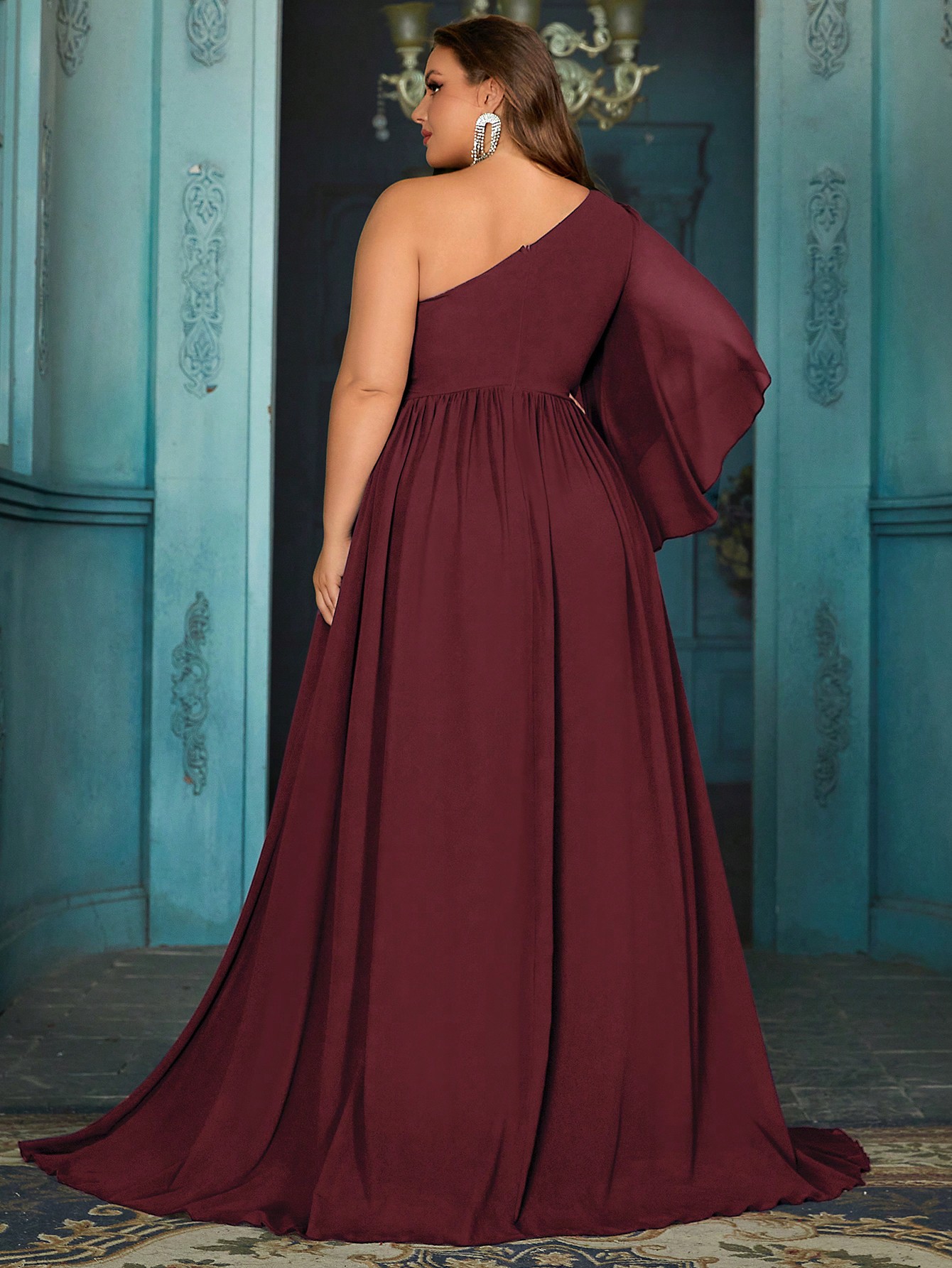Dignified Elegant Plus Size Solid Color Pressed Pleated Flared Sleeve High Waisted Extra Long Gown Bridesmaid Dresses For Wedding, Banquet, Party