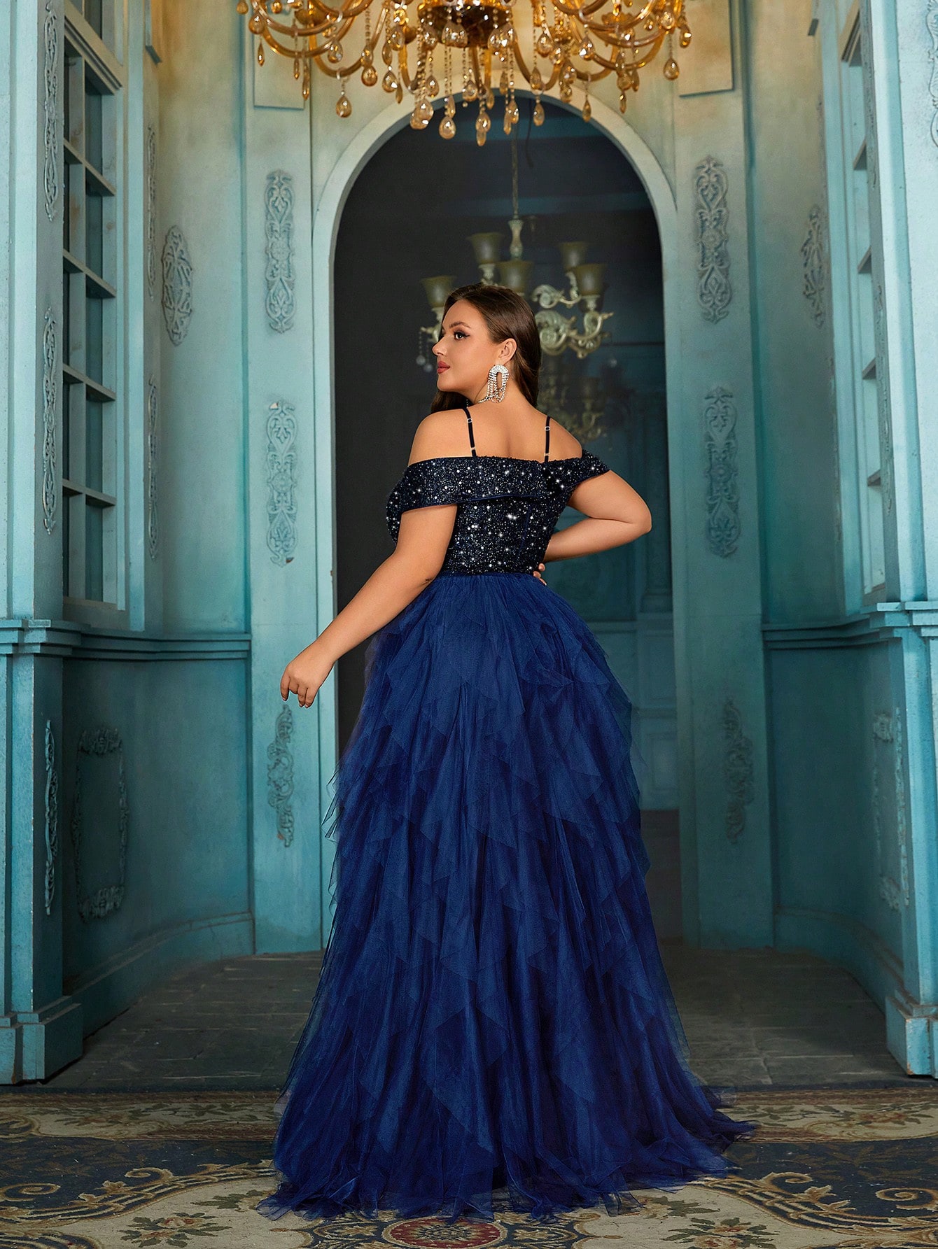 Gentle Fairy Navy Blue Plus Size Hot Drill Rhinestone Zipper Cold Shoulder Gown Dress (Heavily Embellished)