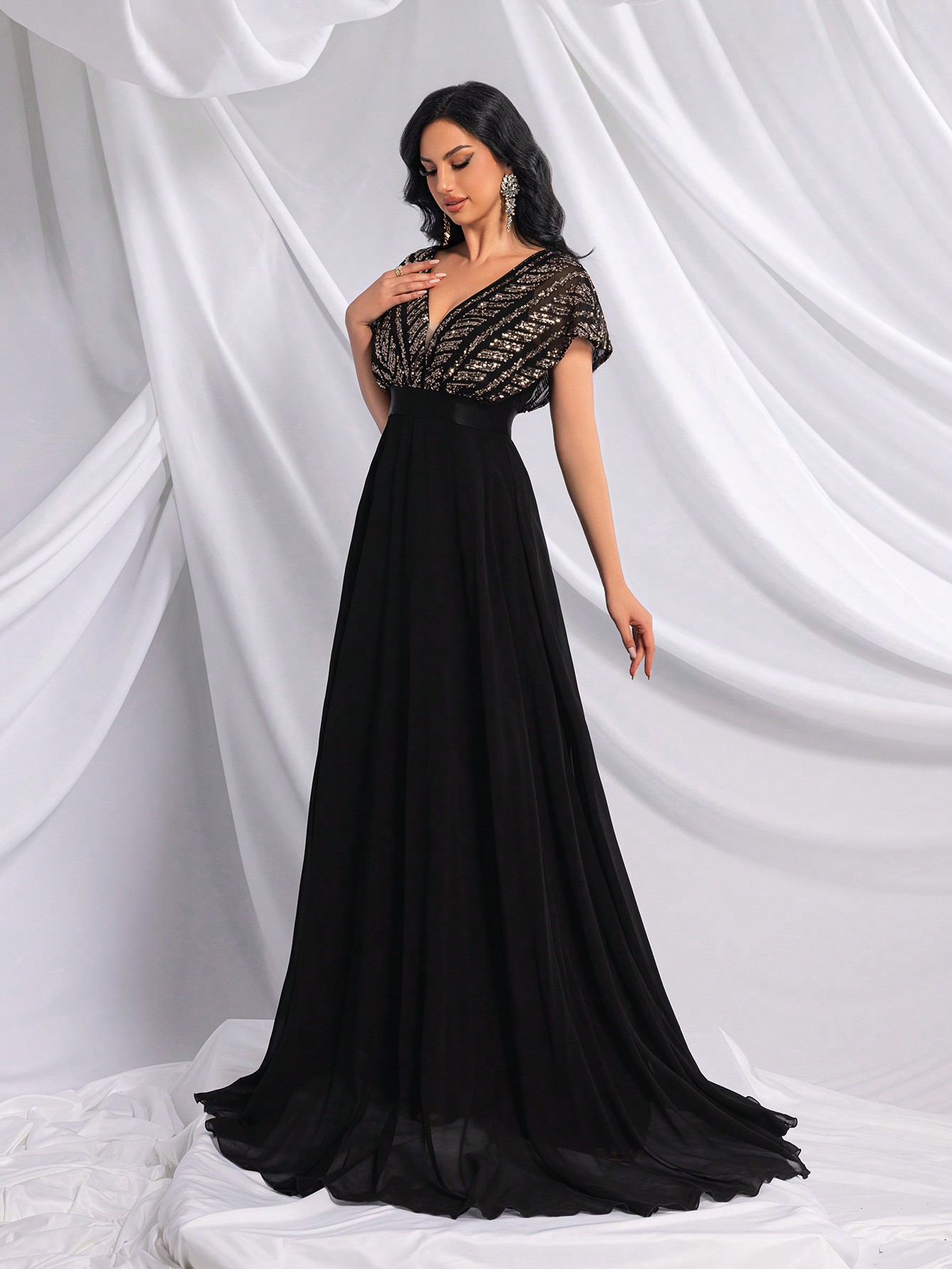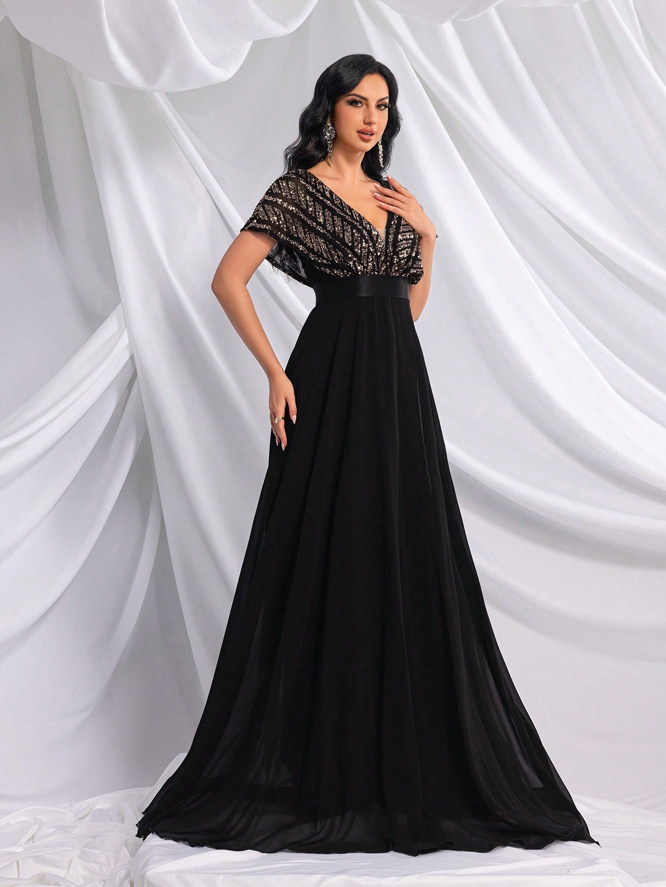Elegant Noble Black Sequins Splicing V-Neck Chiffon Gown Dress For Banquet, Evening Party