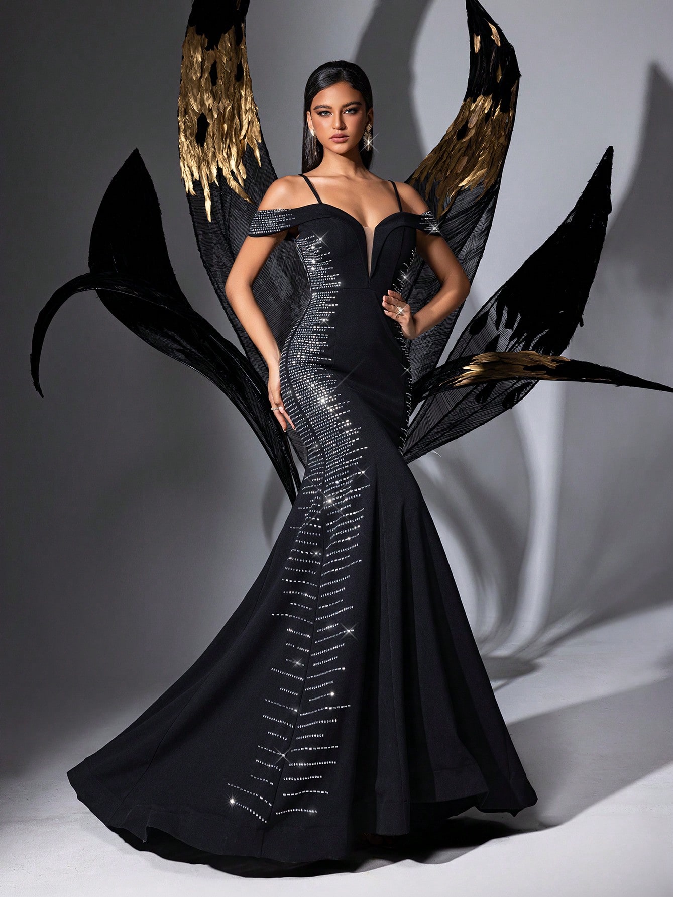 Women's Plus-size Vintage Elegant Rhinestone Evening Gown,Deep V-neck Off-shoulder Black Formal Maxi Dress,Spaghetti Strap Pom Party Dress,Bodycon Mermaid Birthday Dress,Wedding Guest Dress,Bridesmaid Dress,Red Carpet Floor-length Gown,Backless Date Dress