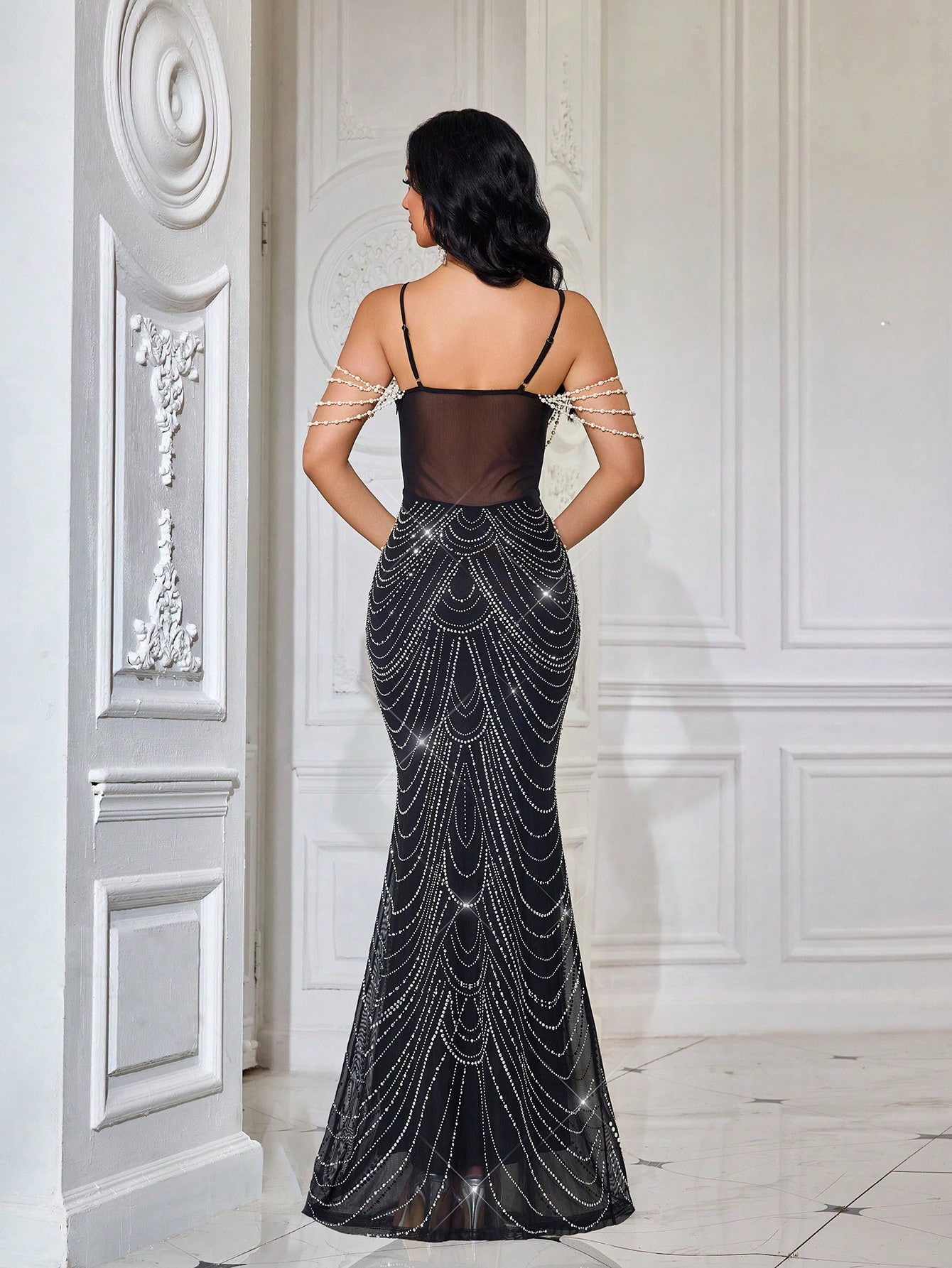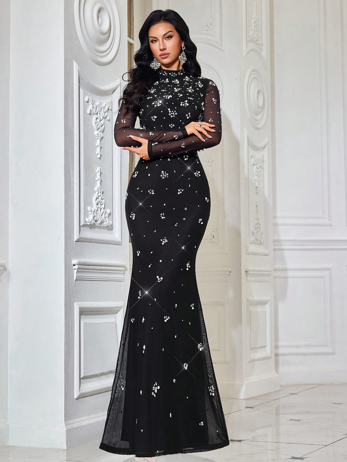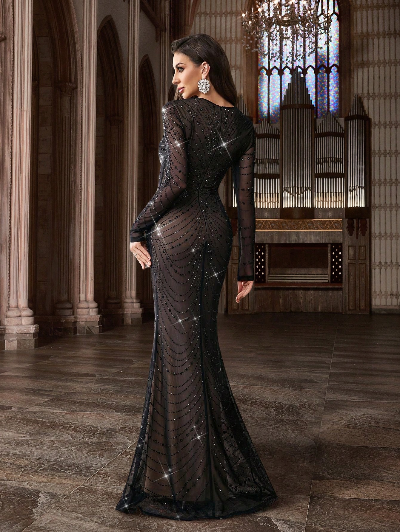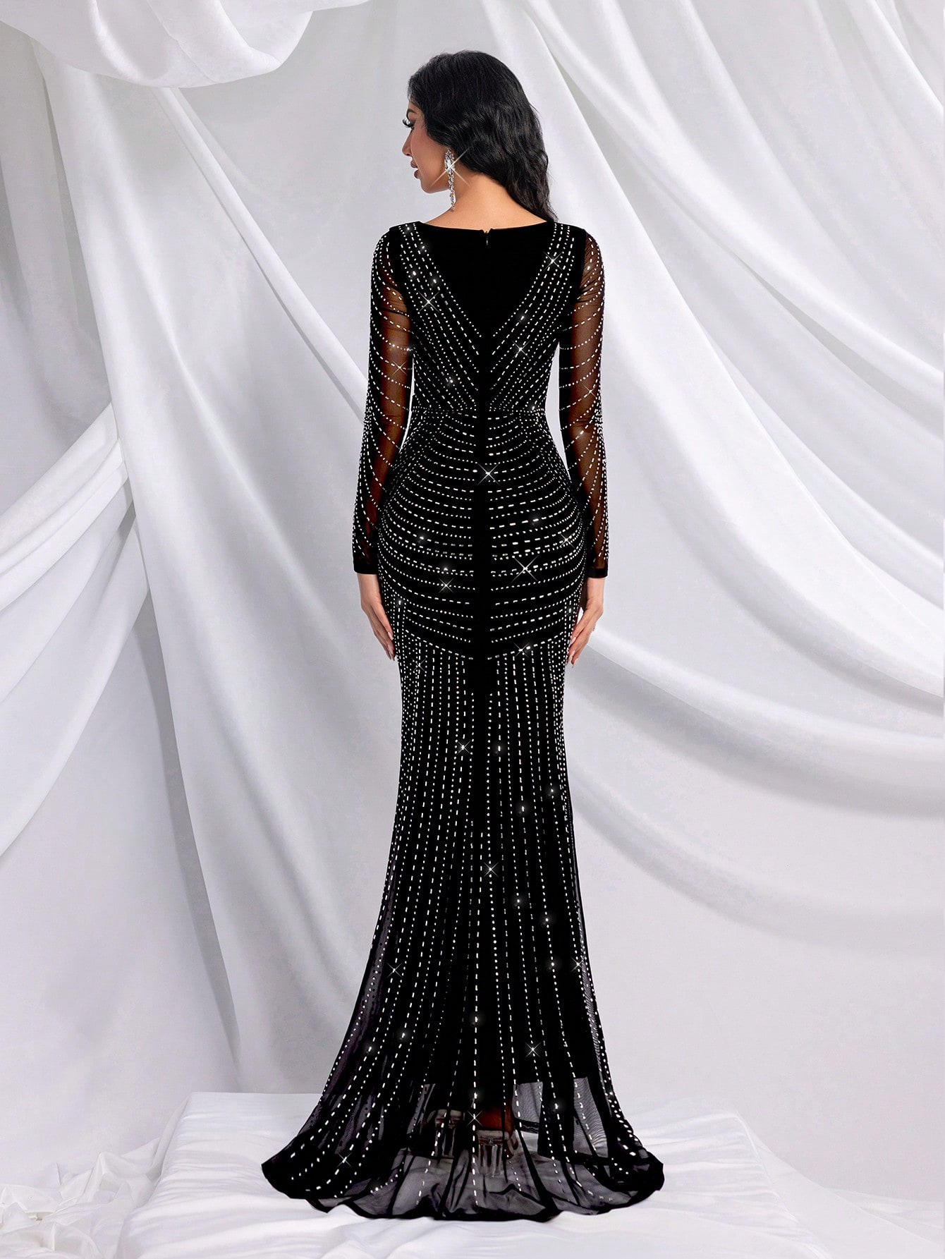 Sparkling Mesh Splicing Hot Drill Rhinestone V-Neck Long Sleeve Slim Gown Dresses