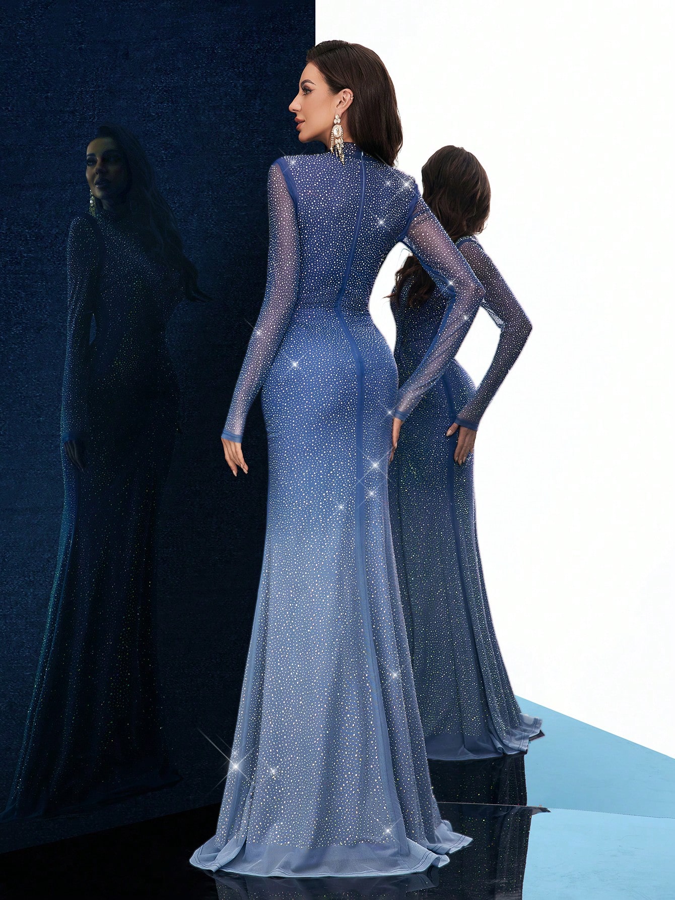 Bling Chic Dot Mesh Hot Drill Rhinestone Slit Long Sleeve Gown Dress For Formal Evening, Party Night