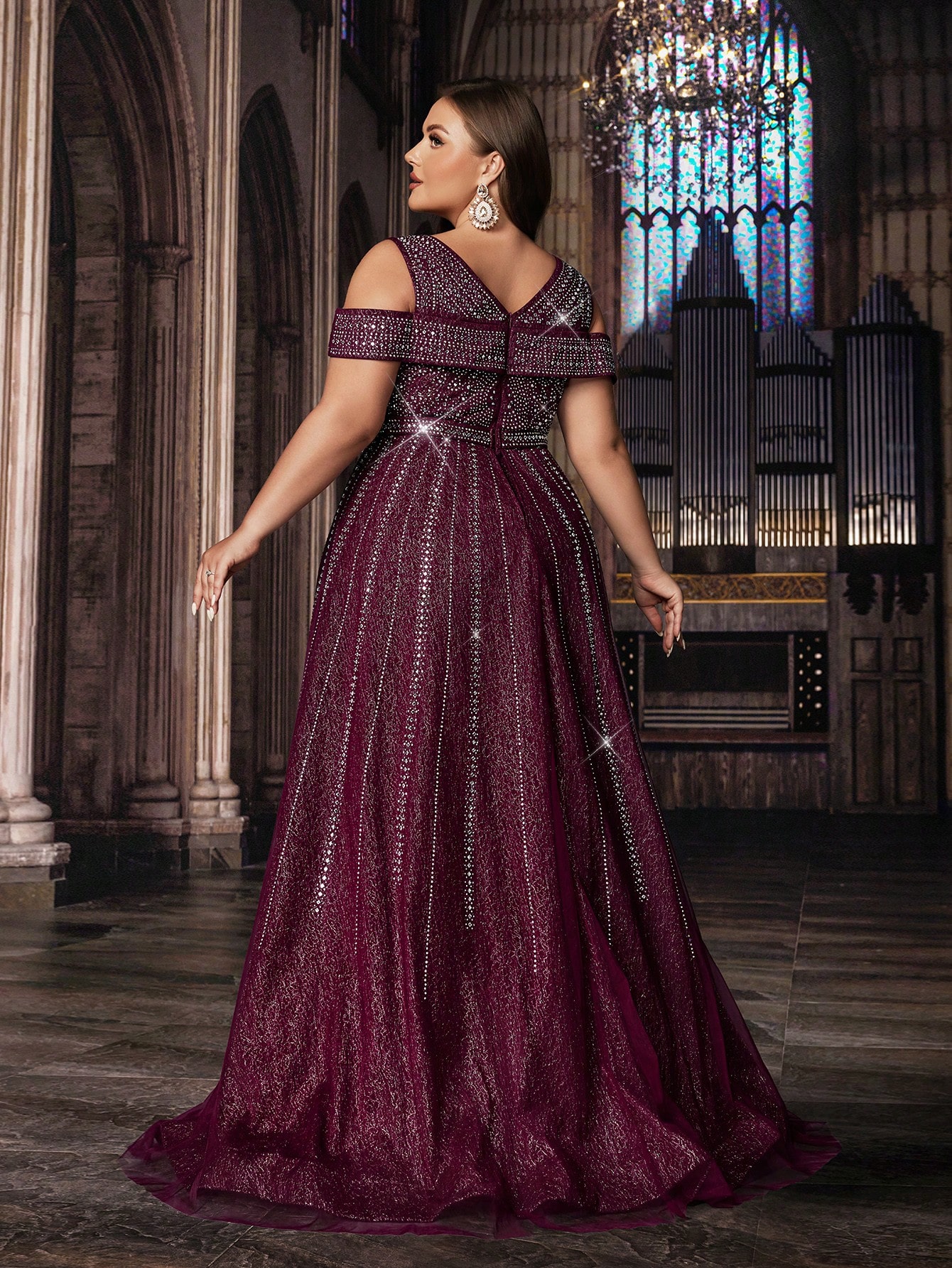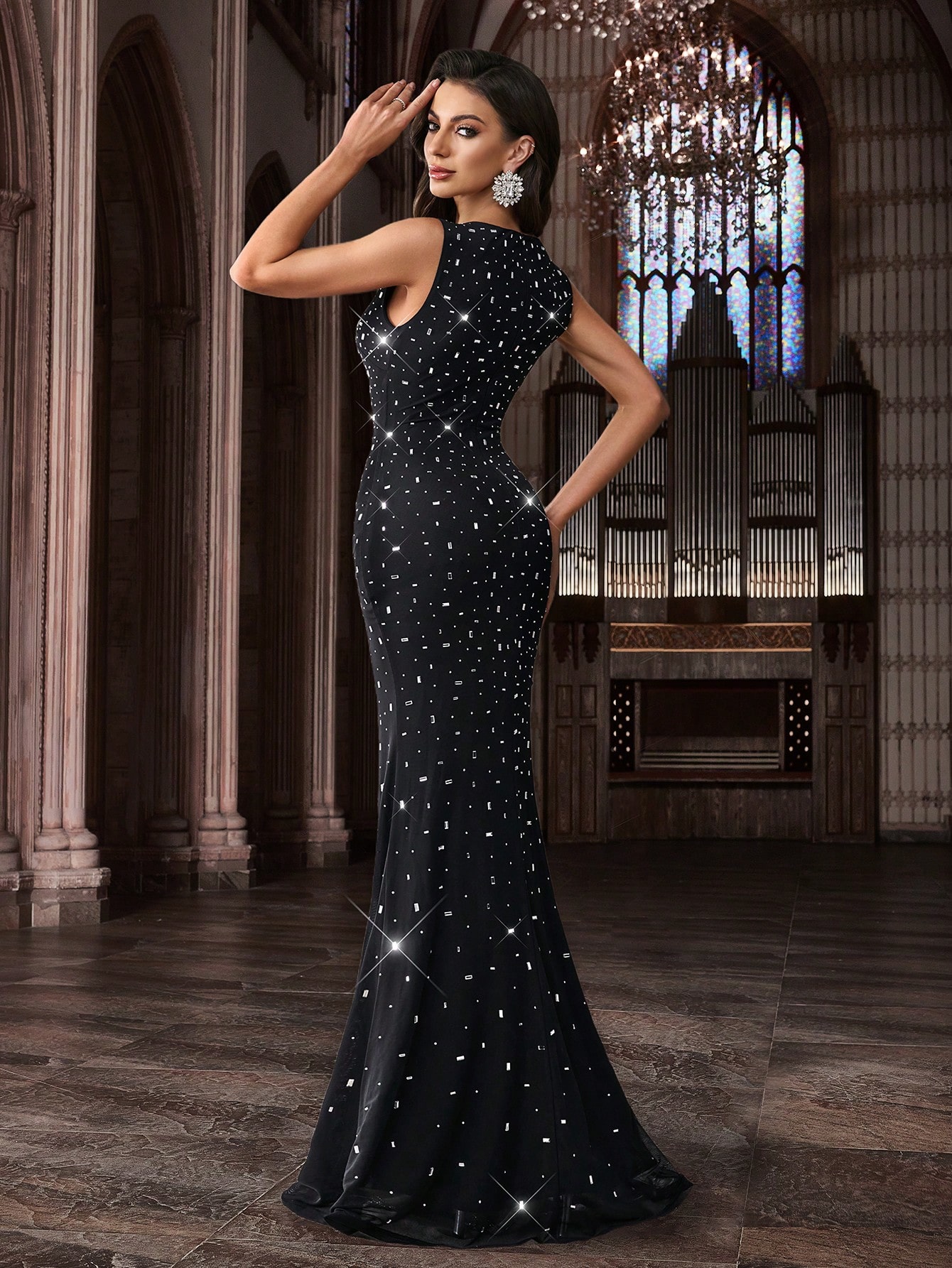 Dignified Elegant Solid Color Plus Size Rhinestone Hot Drill V-Neck Sleeveless Gown Dress (Heavily Embellished)