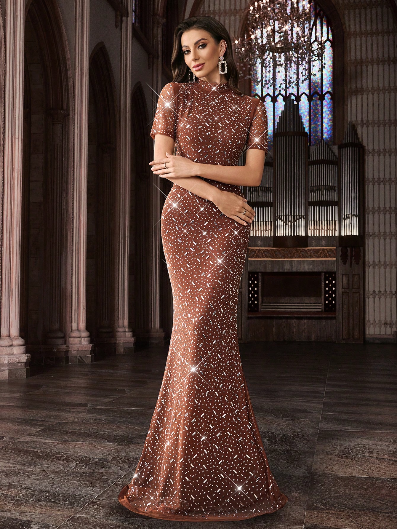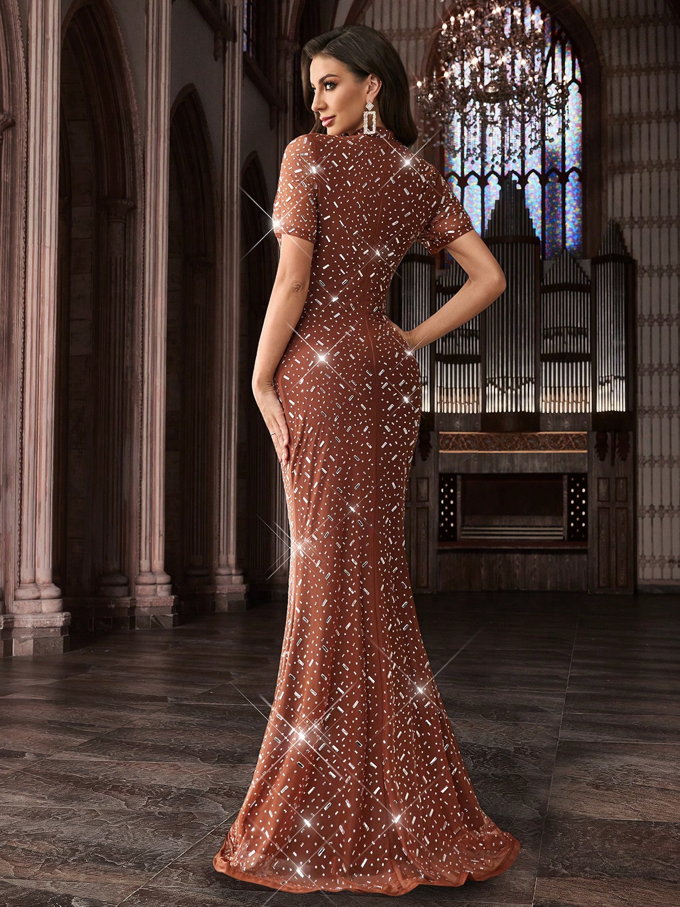 Dignified Temperament Hot Drill Women Evening Gown Luxury Rhinestone Diamond Upscale Formal Dress For Charity Prom, Dinner, Concert, Galas, Cocktail Pure Color Stand Collar Short Sleeve Slim Maxi Long Dresses