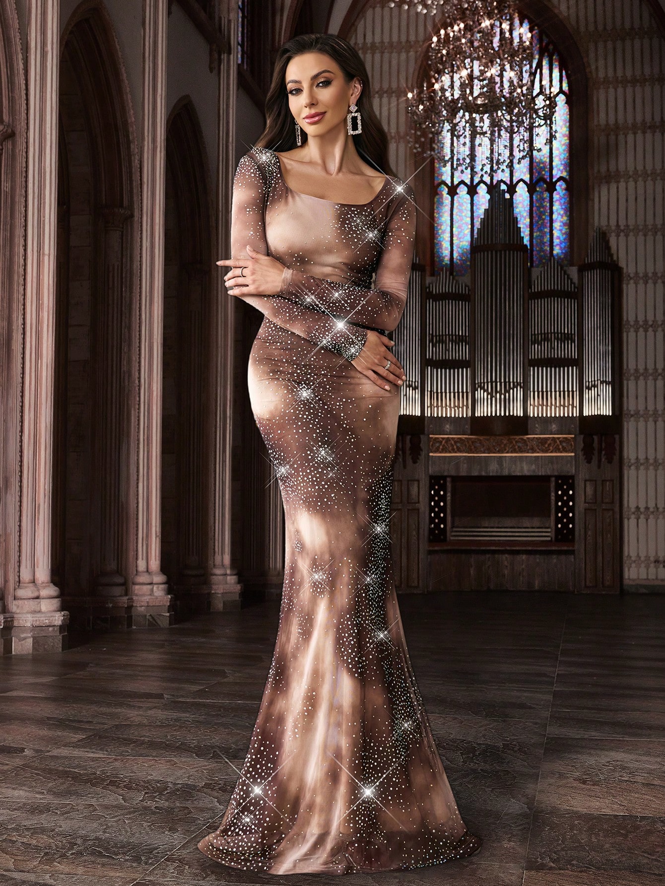Fashionable Temperament Solid Color Fantasy Hot Drill Rhinestone Ladies Long Sleeve Gown Dresss For Evening Party, Banquet, Ceremony