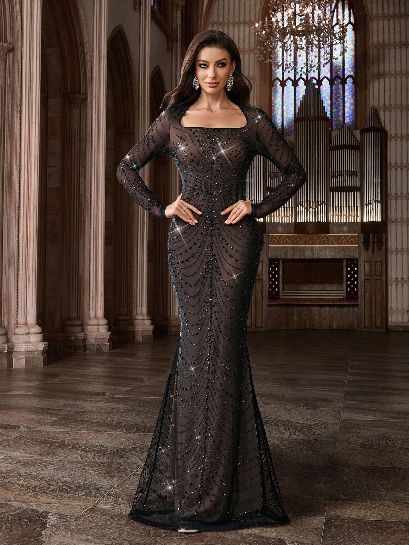 Classic Style Black Rhinestone Hot Drill Beading Square Neck Slim Long Sleeve Gown Dresses