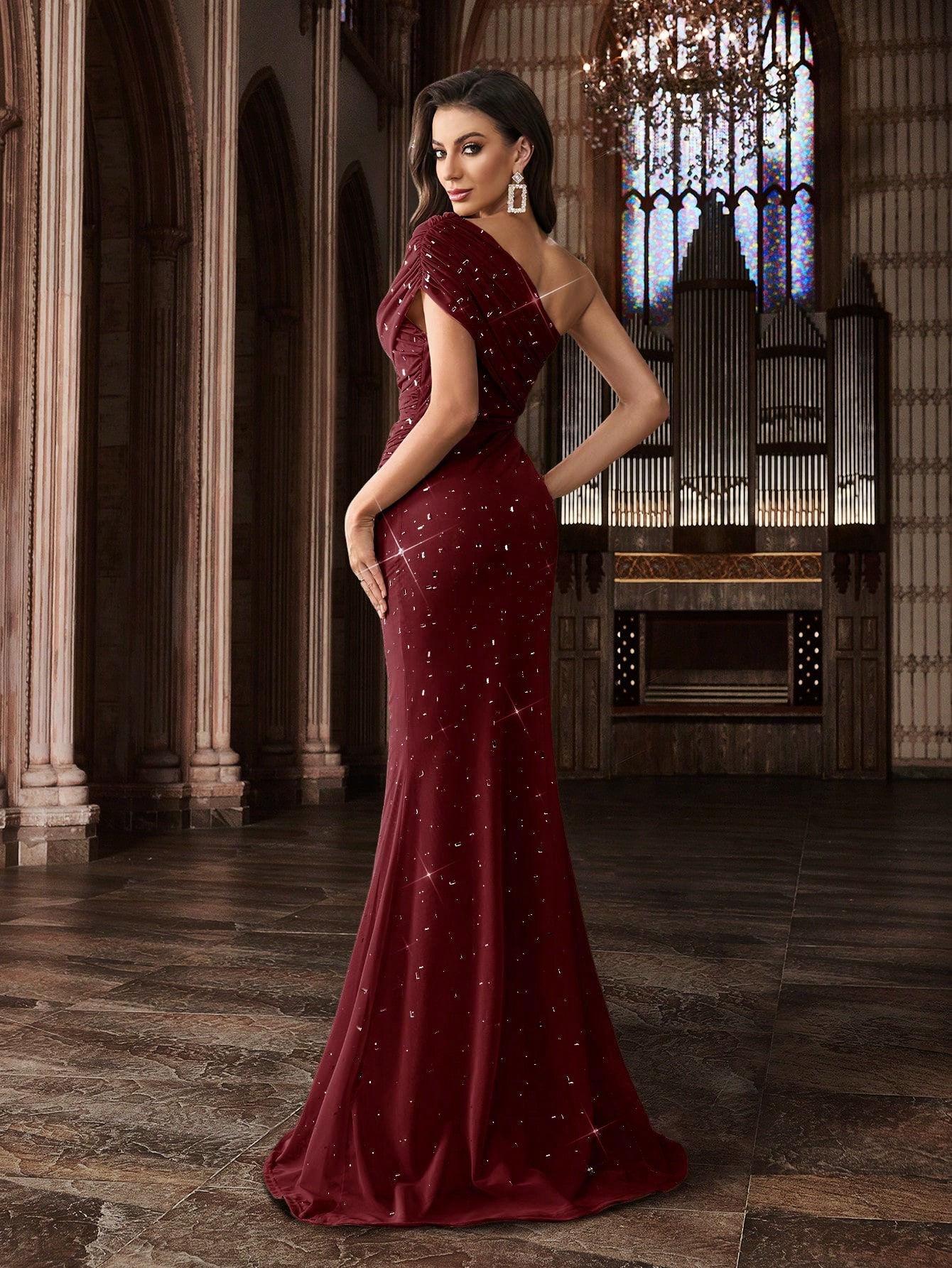 Charm Women Solid Color Formal Dresses Evening Girls Gown Suitable Graduation Party, Galas, Red Carpet Events ,Asymmetrical Neck Hot Drill Rhinestone Dresses