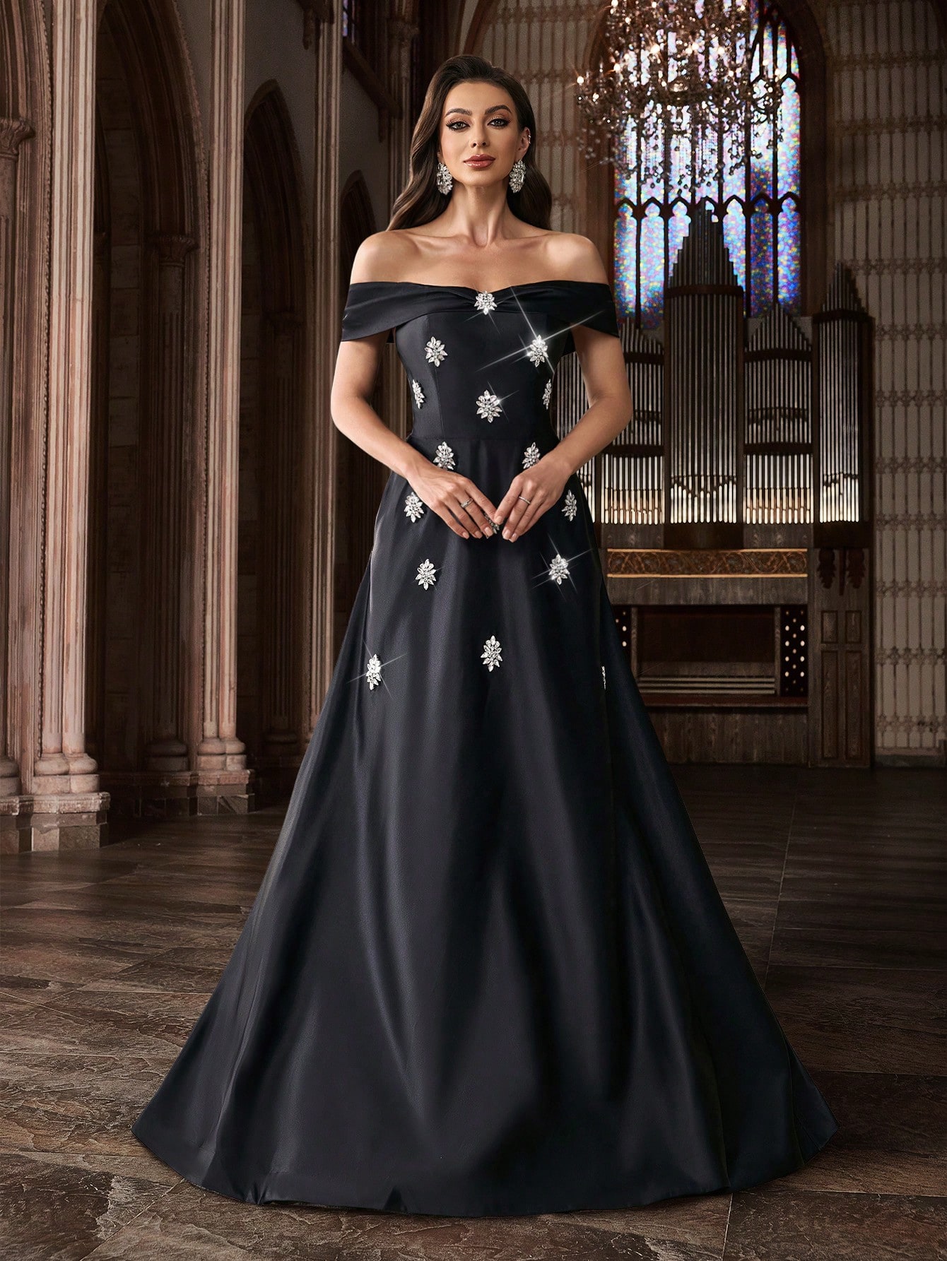 Elegant Charming Spring Summer Hot Drill Formal Dress Women Rhinestone Chic Evening Gown For Evening Party, Cocktail, Dinner Party, Concert, Charity Prom, Birthday Party Black Cold Shoulder Slim Long Sleeve Floor Length Dresses