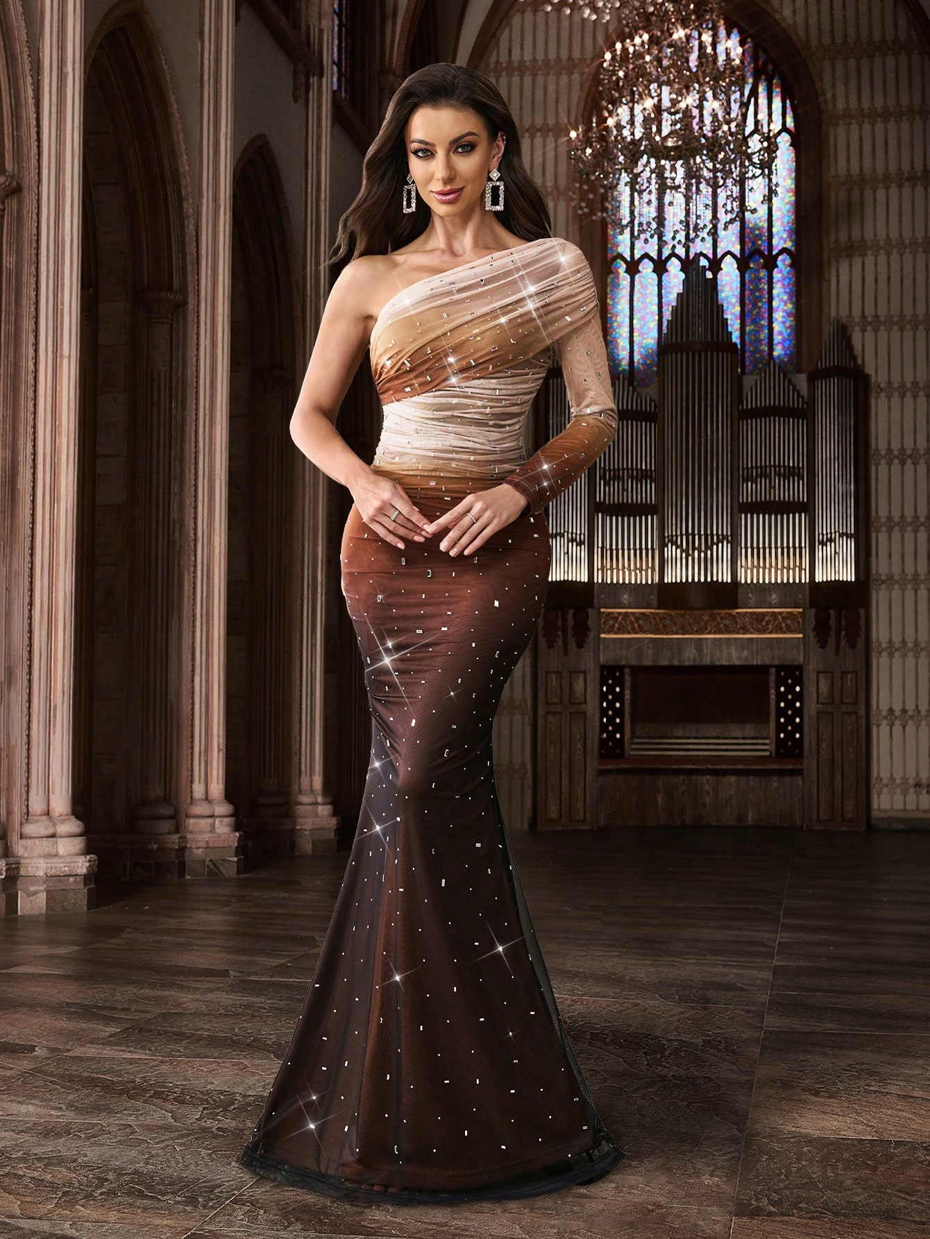 Temperament Charm Ladies Gradient Color Asymmetric Neckline Hot Drill Rhinestone Gown Dresses