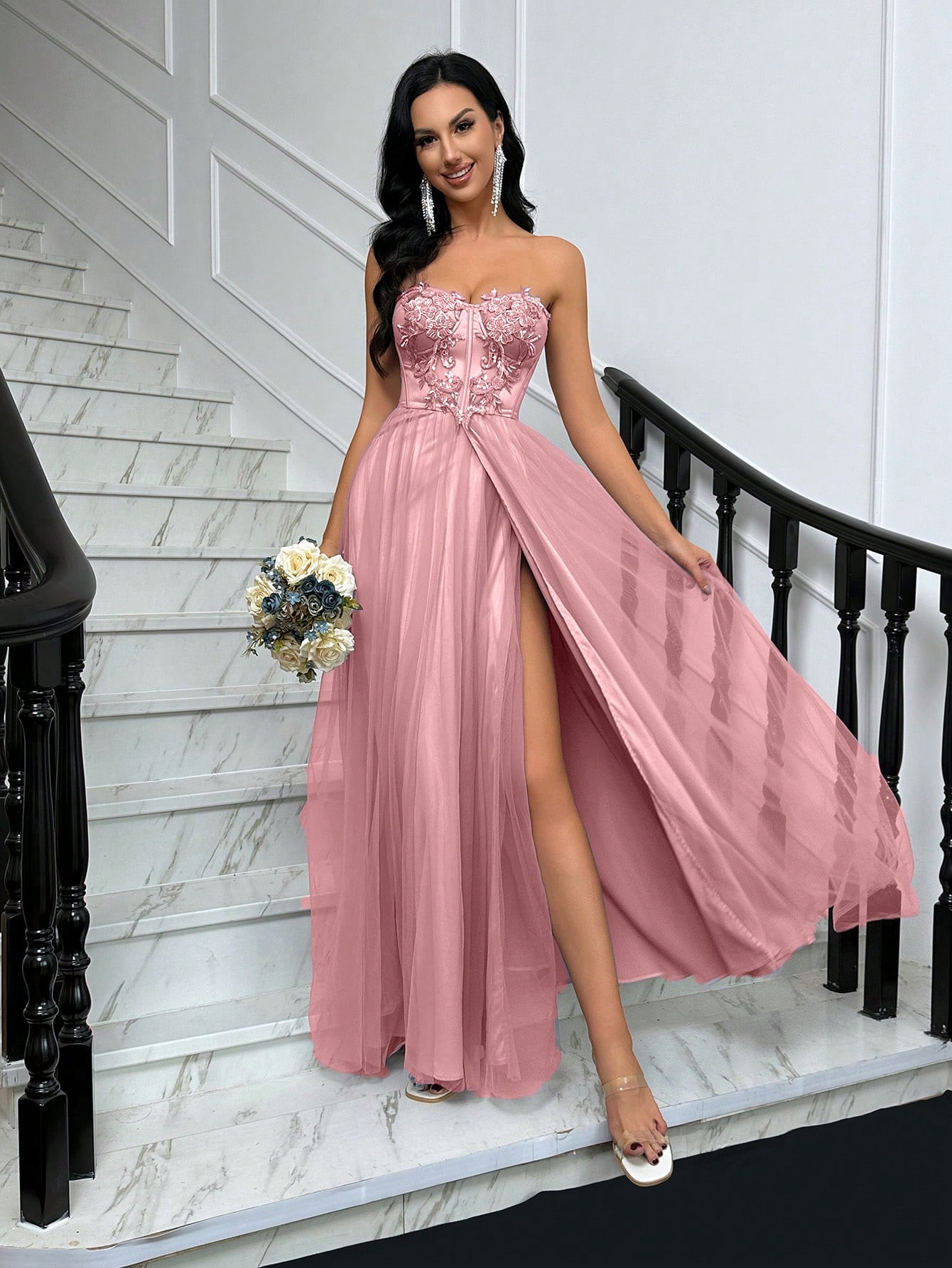 Fairy Sweet Solid Color Floral Decoration Strapless Mesh High Slit Trailing Gown For Evening Party, Wedding Guests