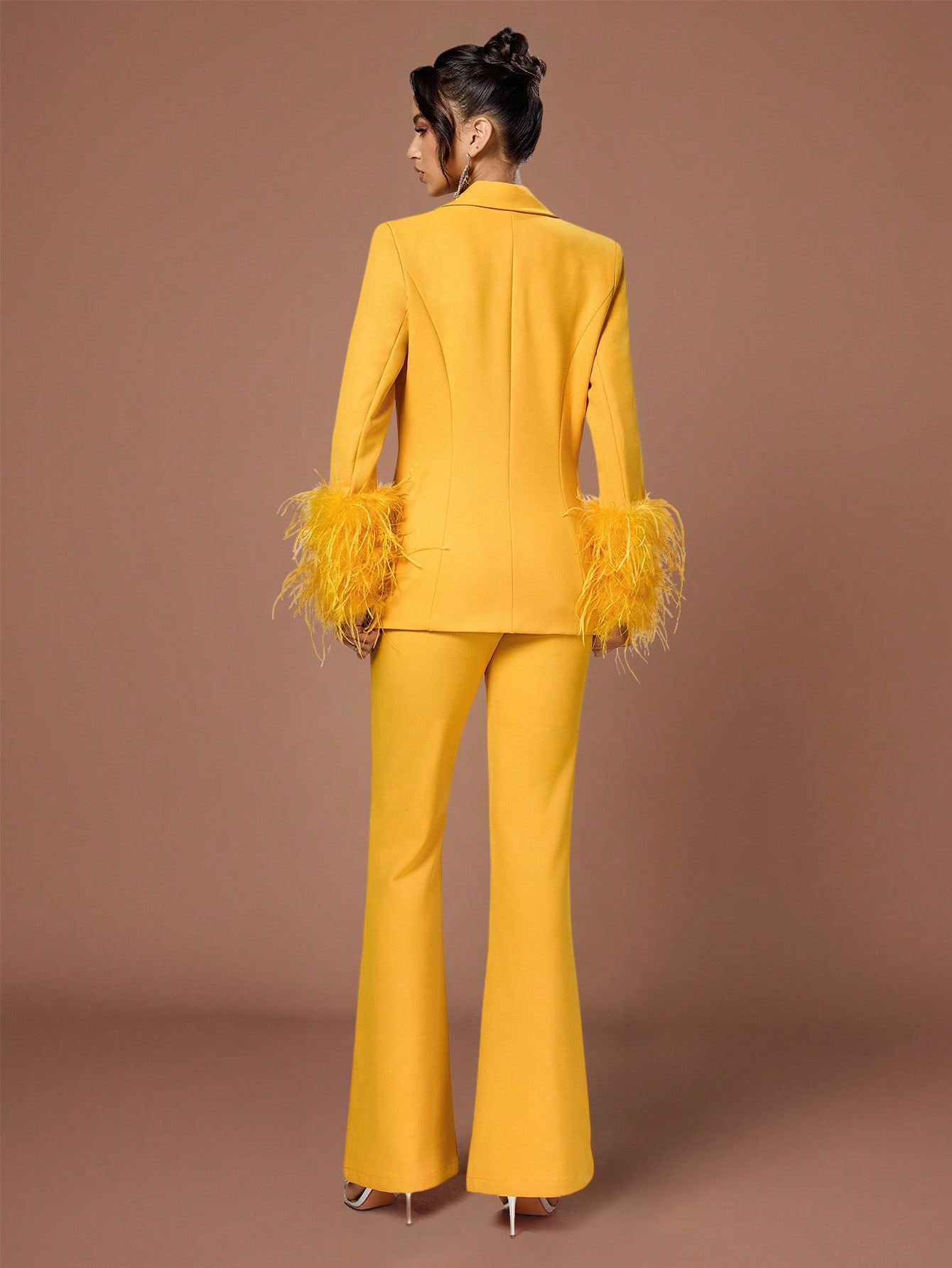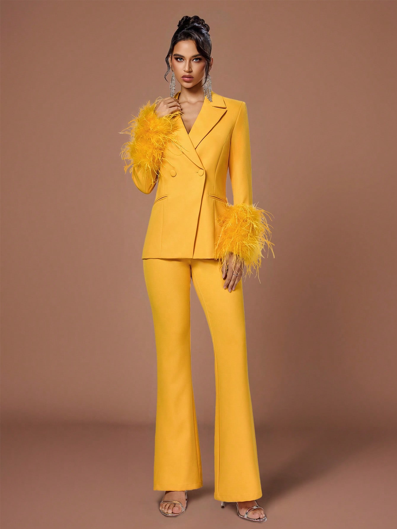 Women's Chic Yellow Double-Breasted Suit Set with Feather Cuffs Collar Regular Sleeve Non-Stretch Fabric for Elegant Occasions