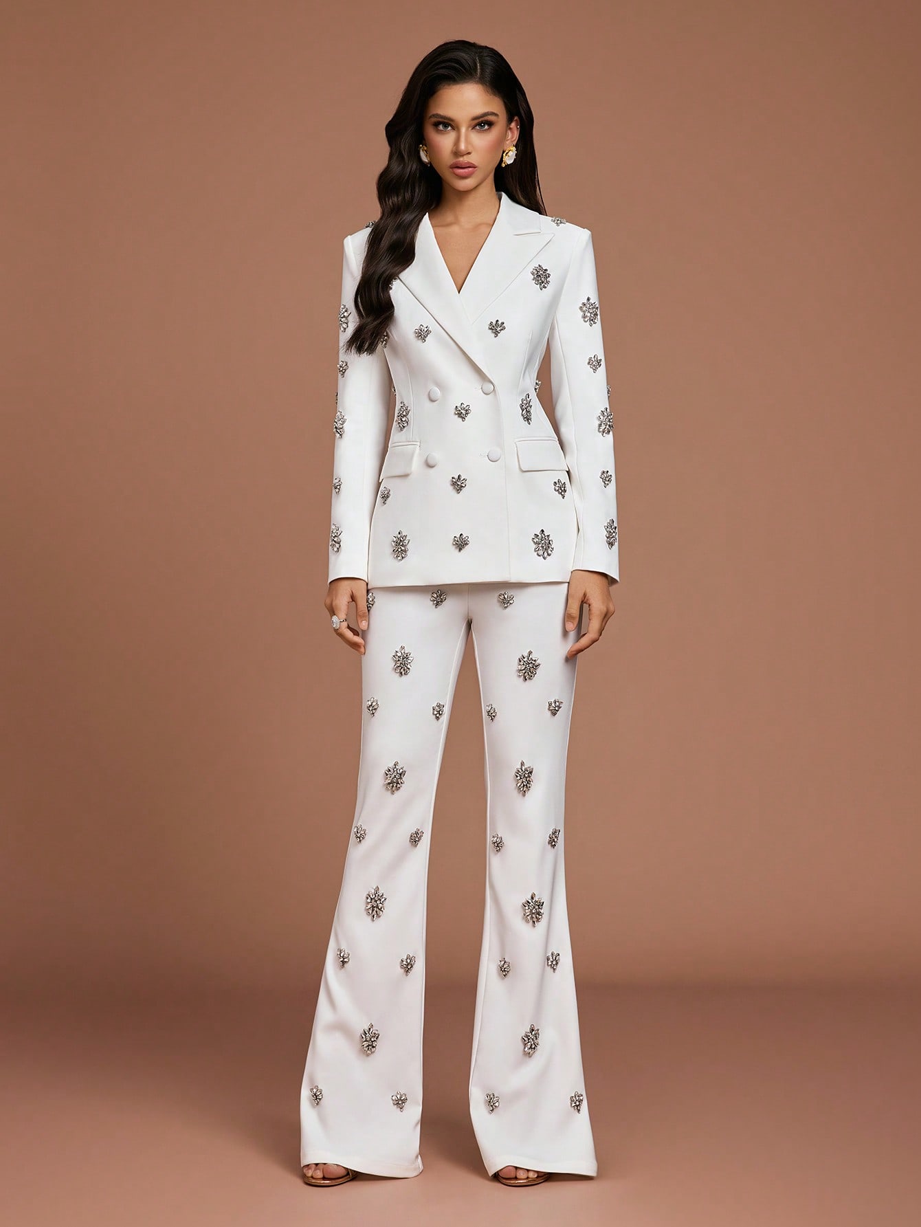 Women's Elegant White Two Piece Suit Set with Crystal Embellishments Collar Regular Sleeve Button Details Non Stretch Fabric