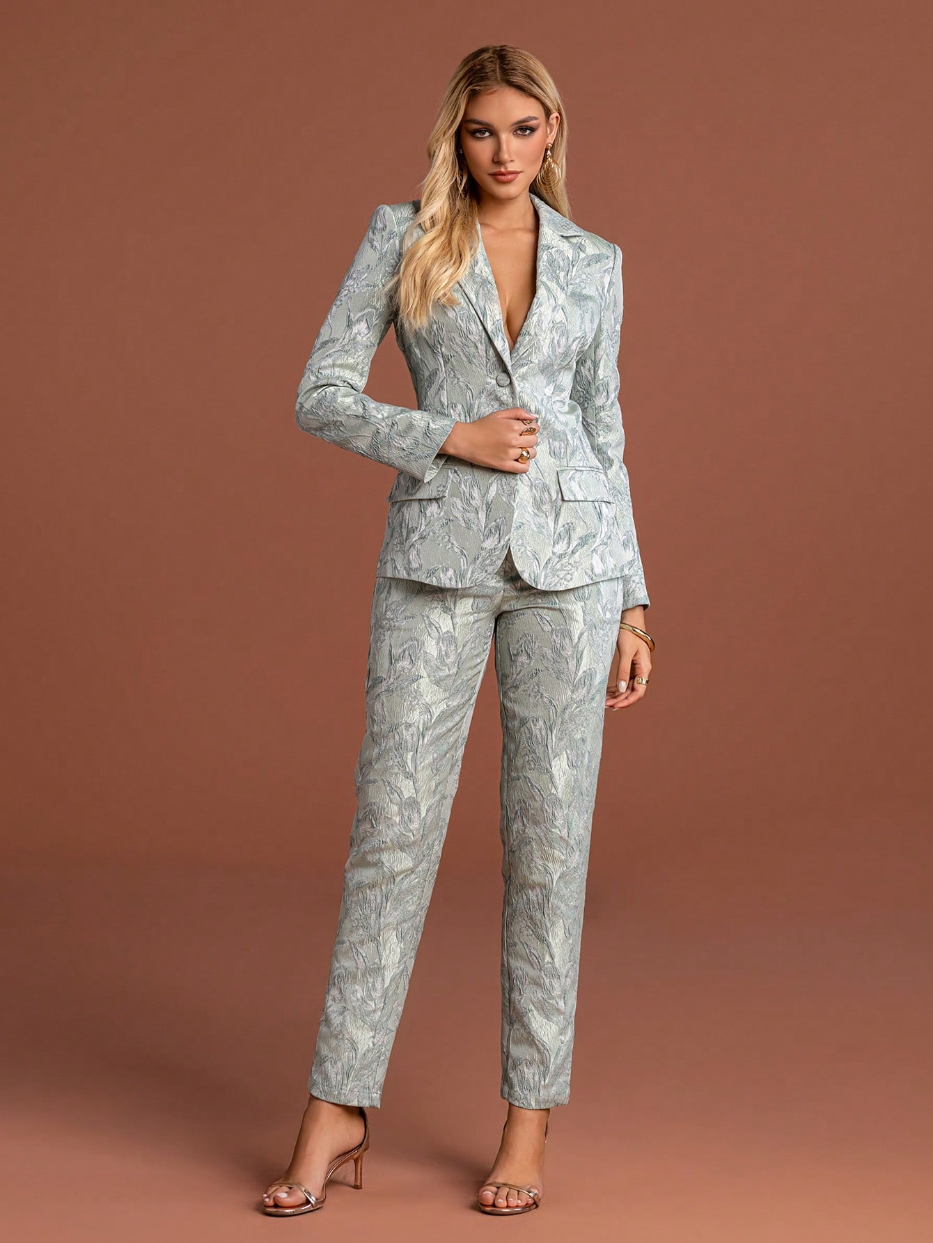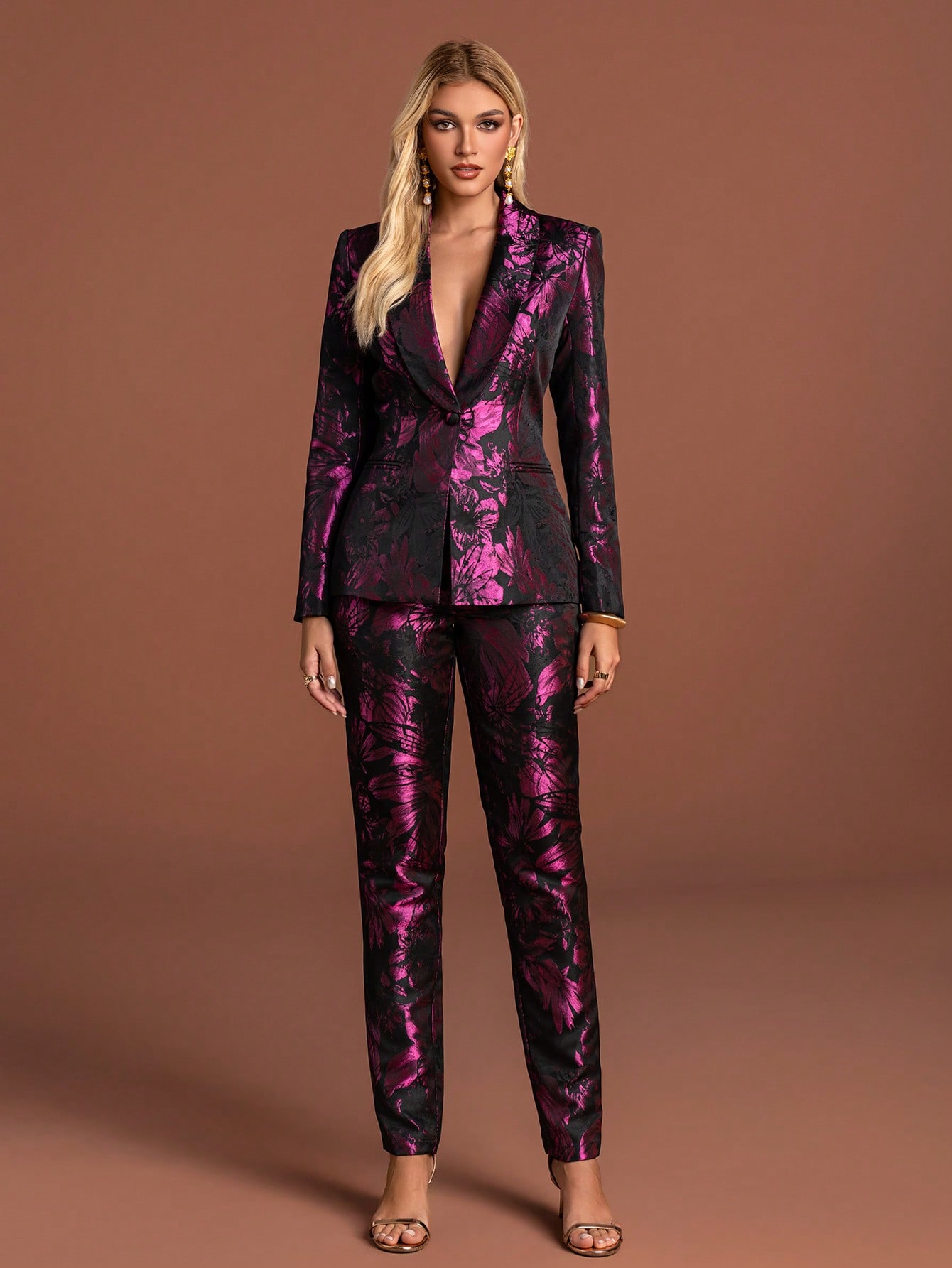 Chic Women's Two-Piece Suit with Lapel Collar Blazer and Matching Trousers, Featuring Exquisite Floral Pattern and Regular Sleeves