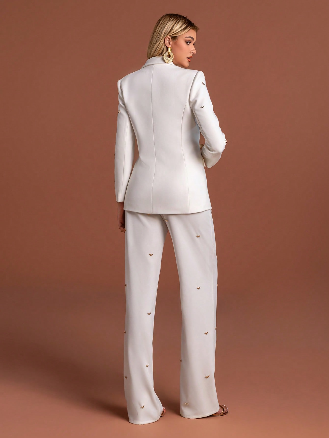 Classy Womens White Suit Set featuring Collar Neck Regular Sleeve Blazer with Gold Accents and Matching Non-Stretch Wide Leg Pants