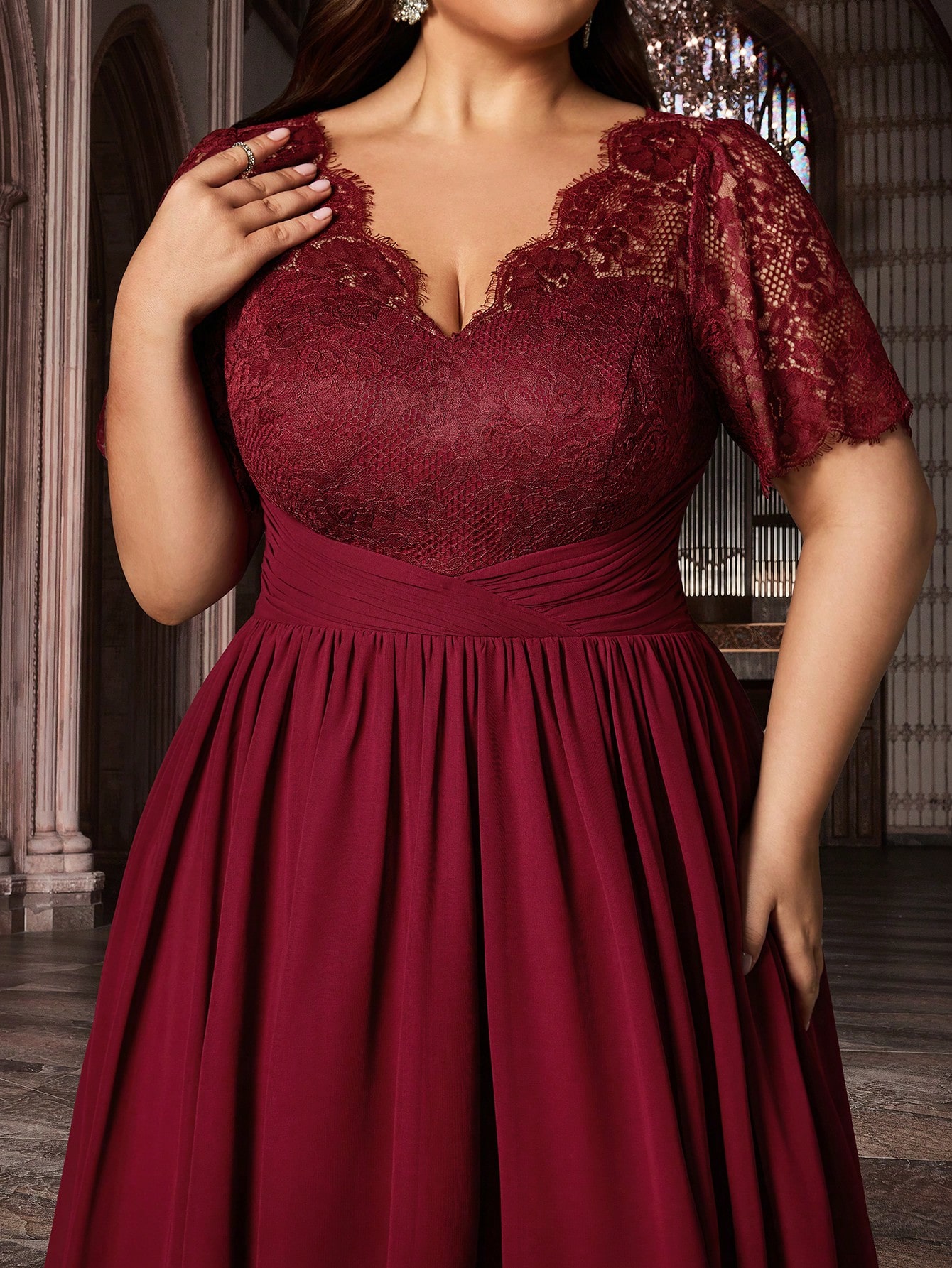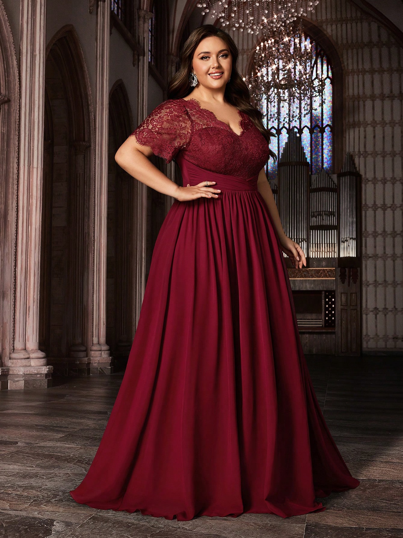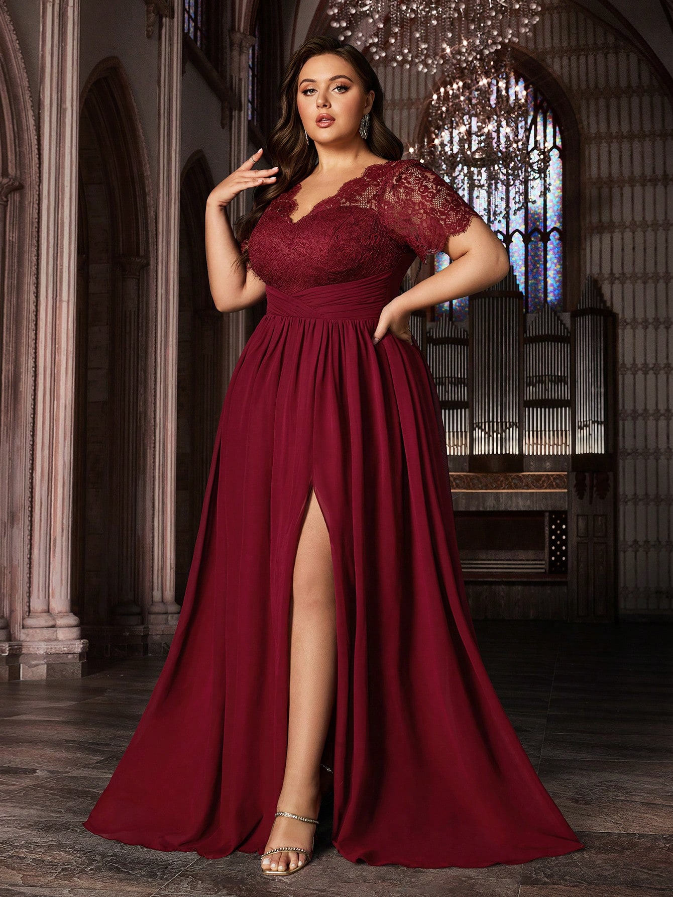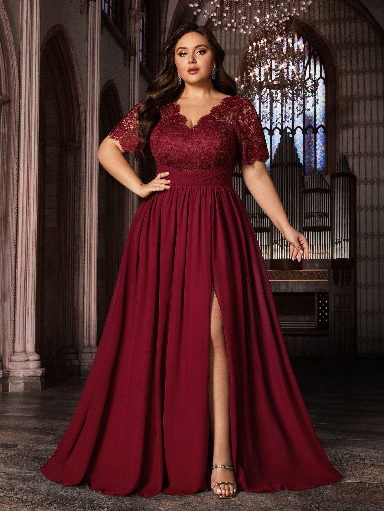 Classic Elegant Plus Size Lace Patchwork Formal Dress Chiffon Evening Gown Curve Women Deep V-Neck Short Lace Sleeves High Slit Maxi Dresses