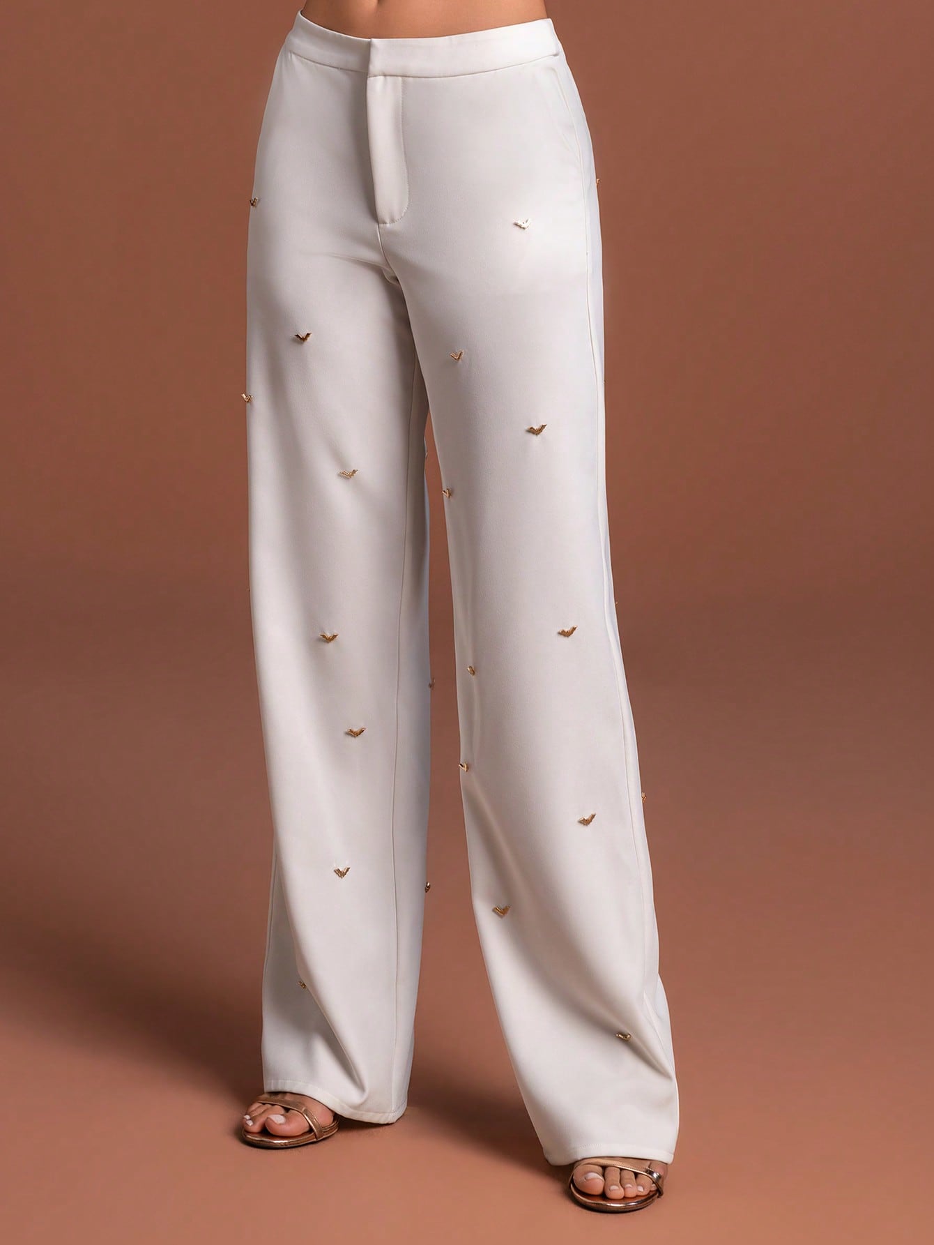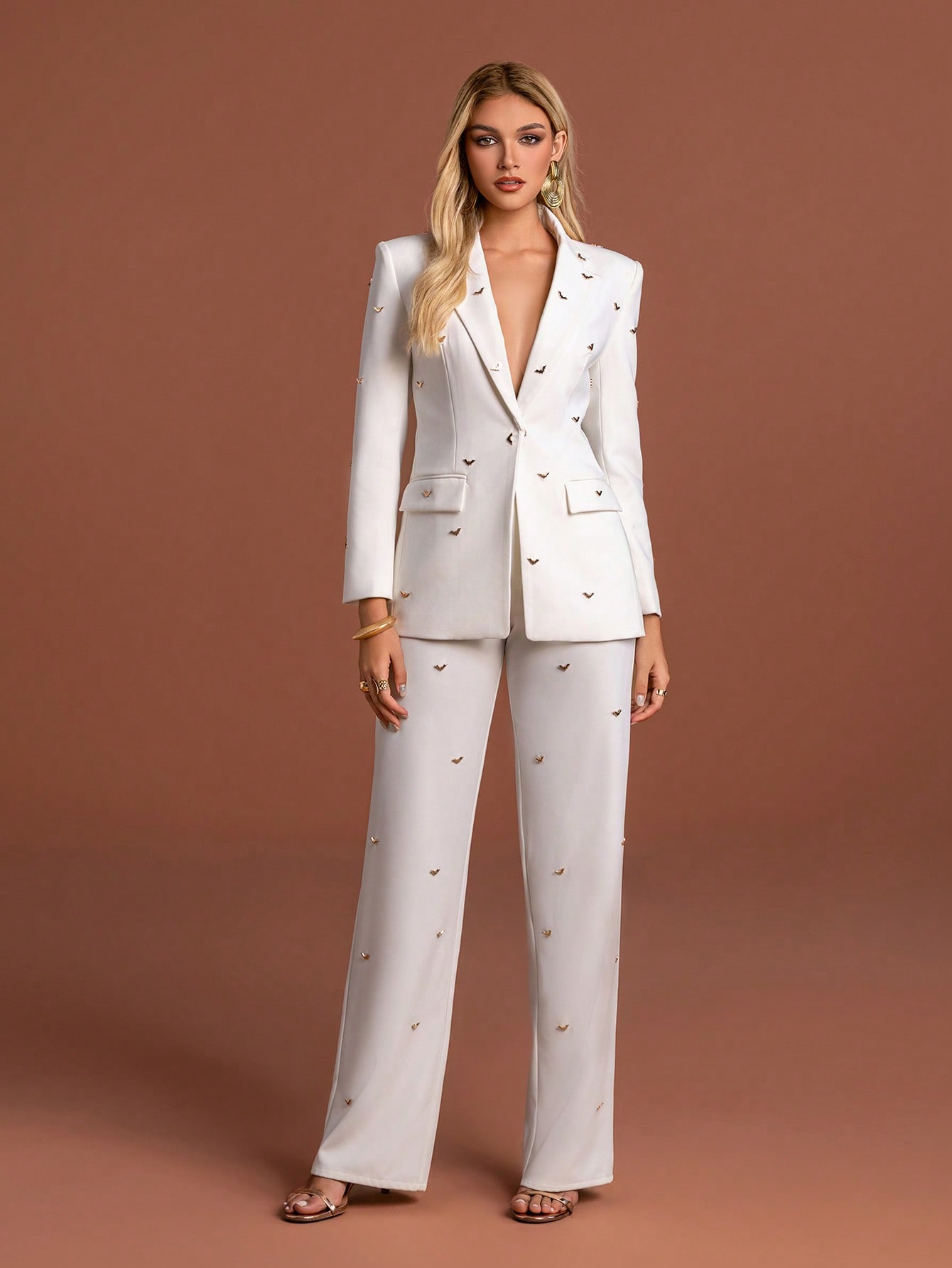Classy Womens White Suit Set featuring Collar Neck Regular Sleeve Blazer with Gold Accents and Matching Non-Stretch Wide Leg Pants