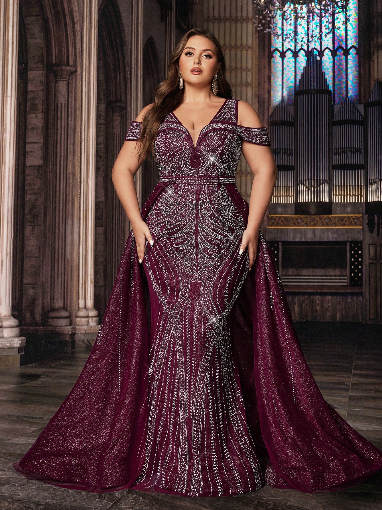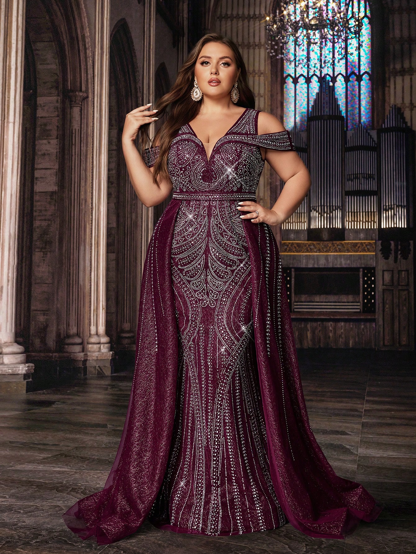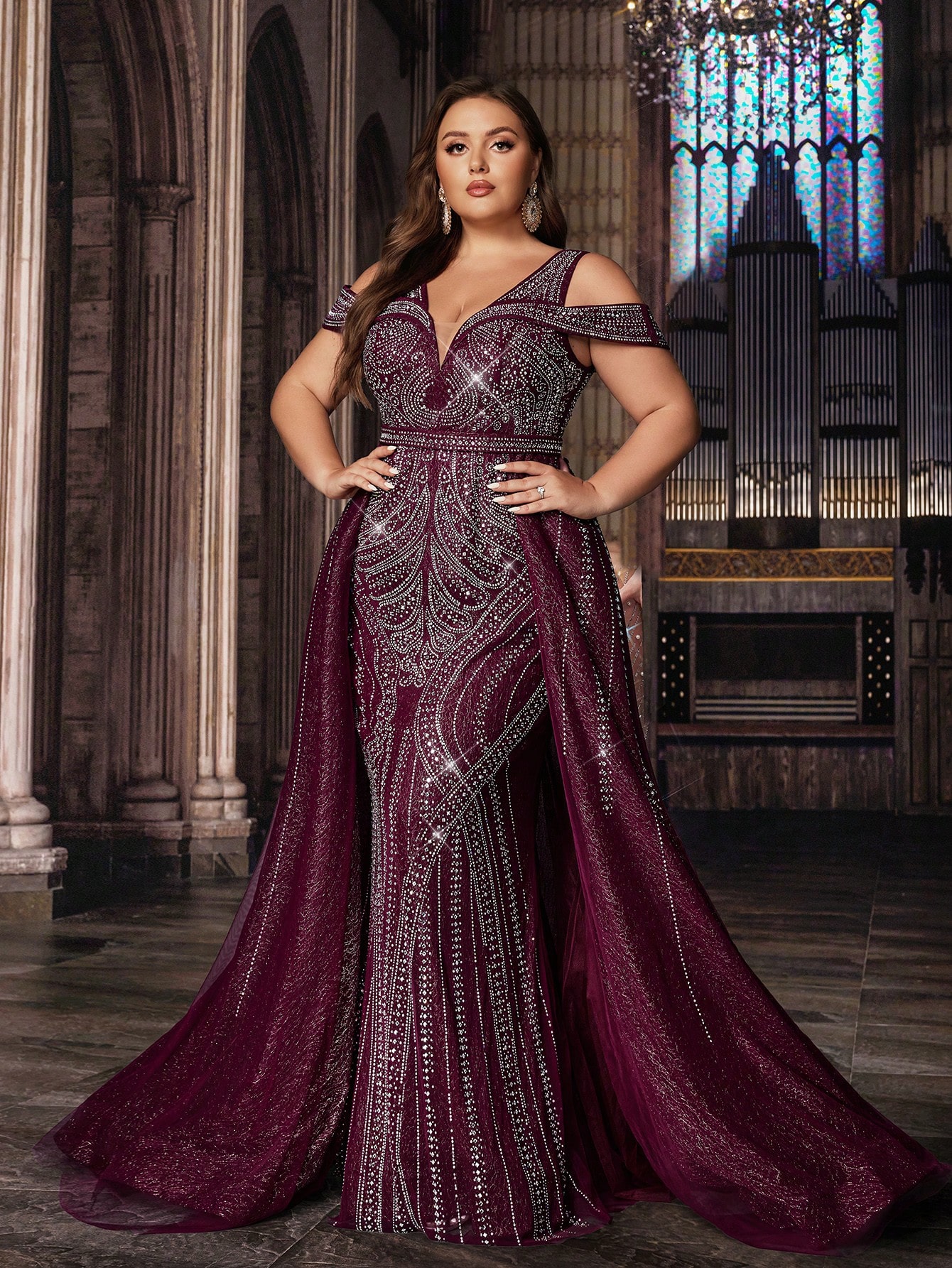 Dignified Elegant Solid Color Plus Size Rhinestone Hot Drill V-Neck Sleeveless Gown Dress (Heavily Embellished)