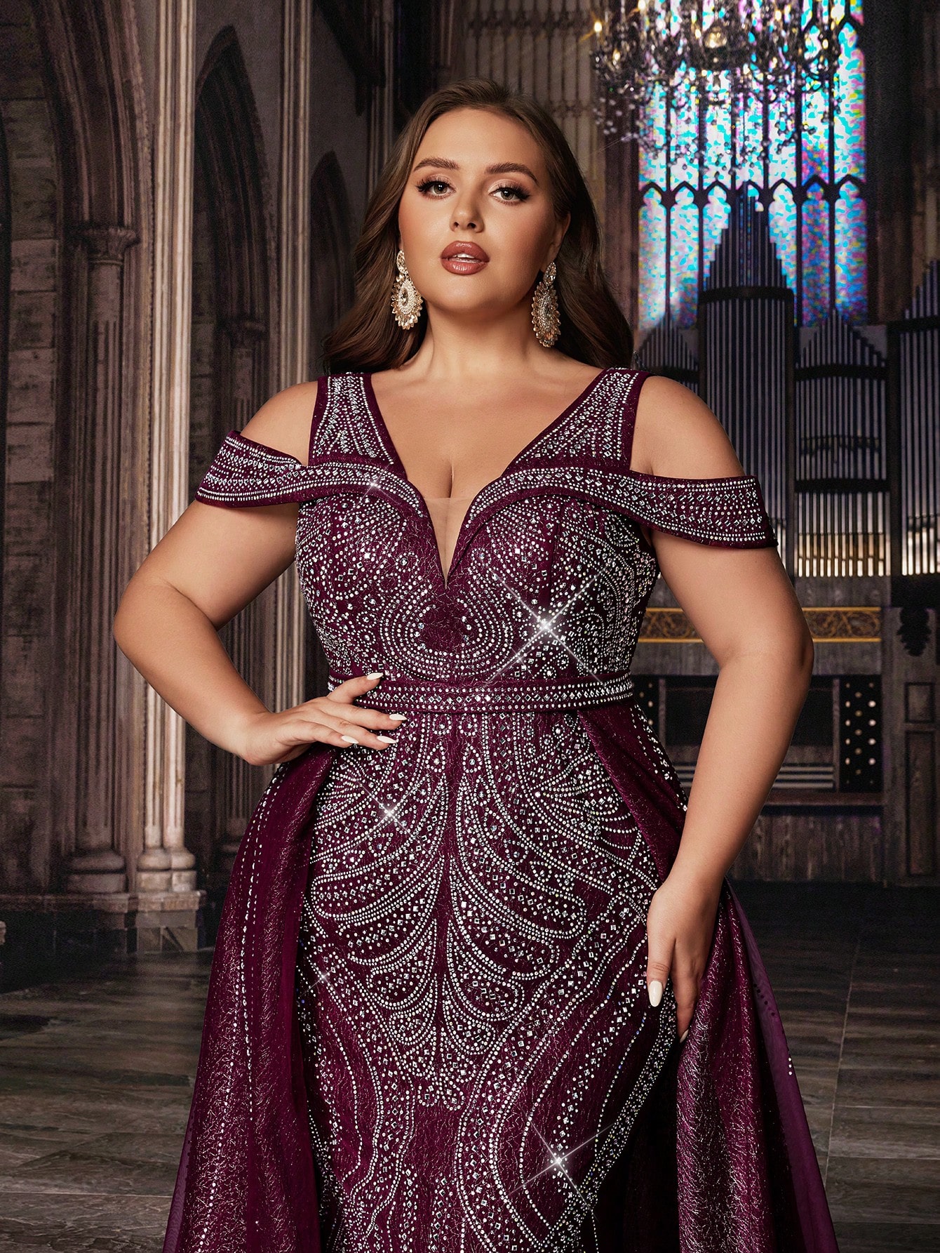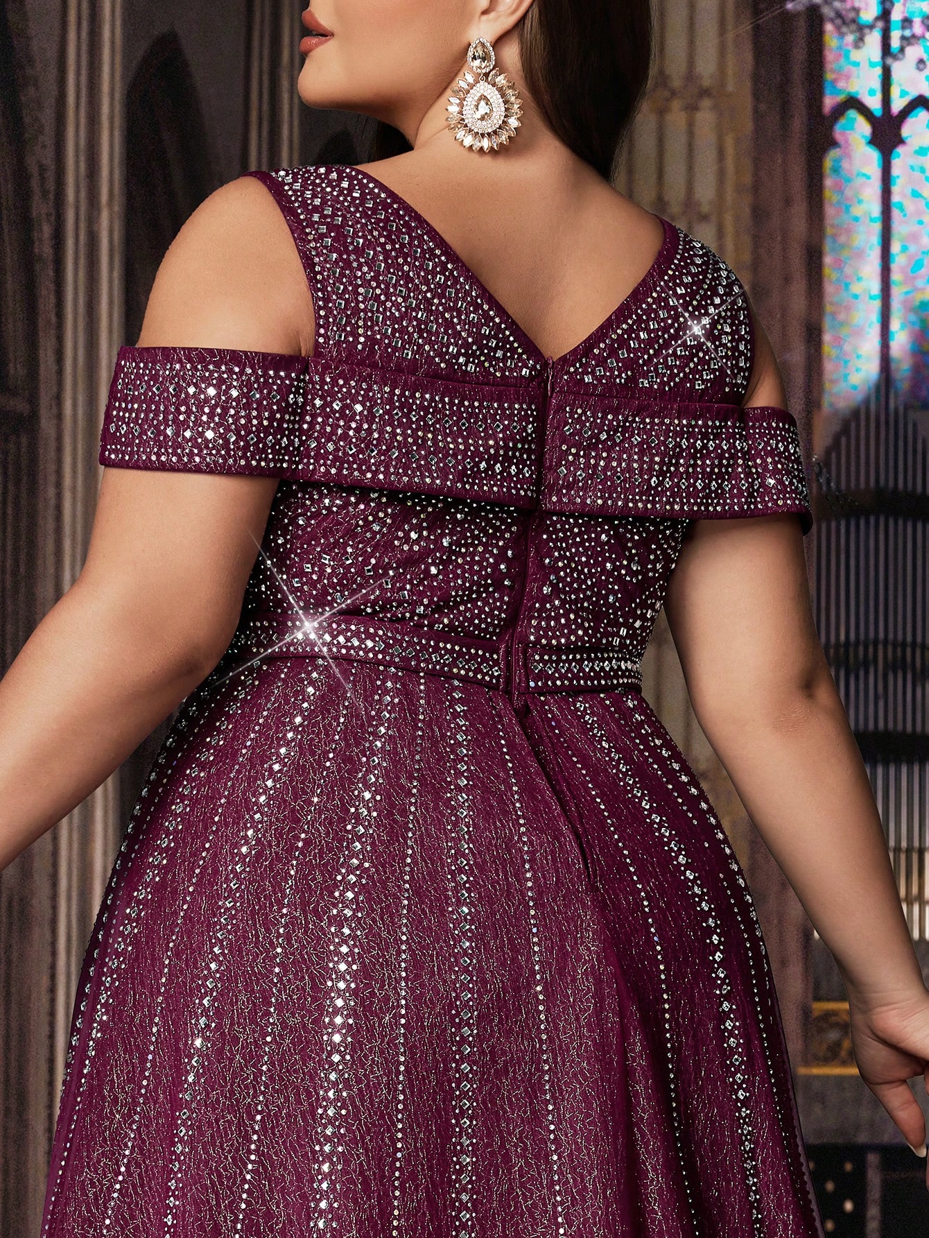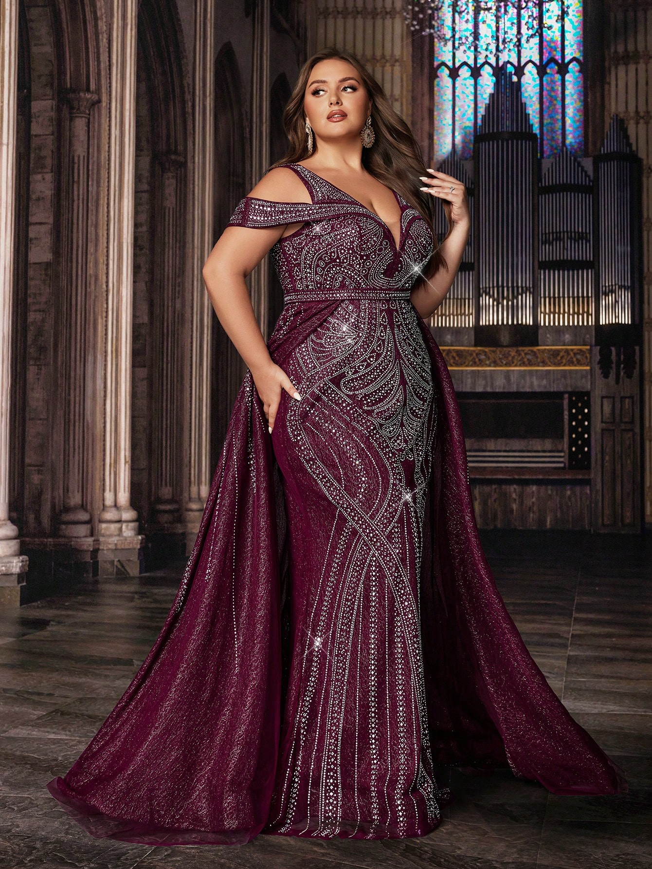 Dignified Elegant Solid Color Plus Size Rhinestone Hot Drill V-Neck Sleeveless Gown Dress (Heavily Embellished)