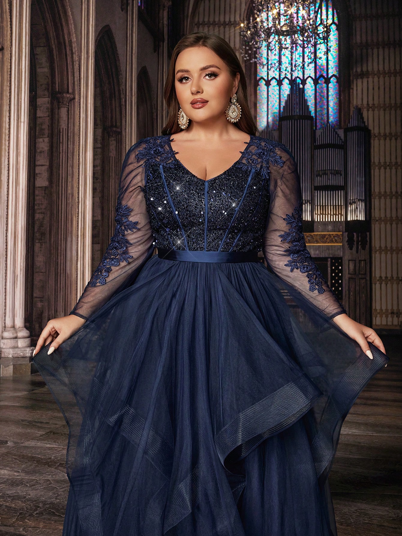 Dignified Temperament Plus Size Women Navy Blue Sequins Splicing Applique V-Neck Mesh Gown Dresses