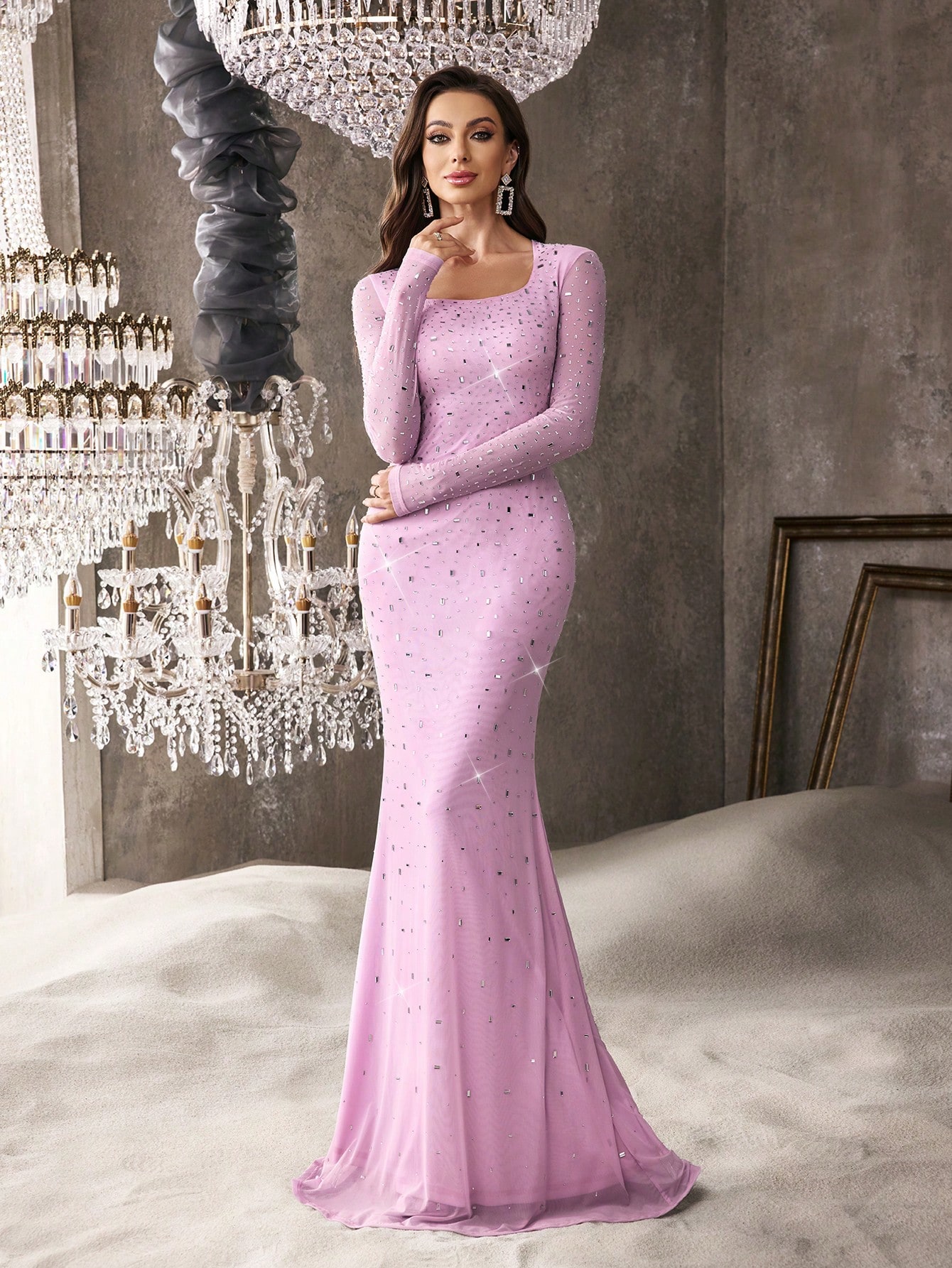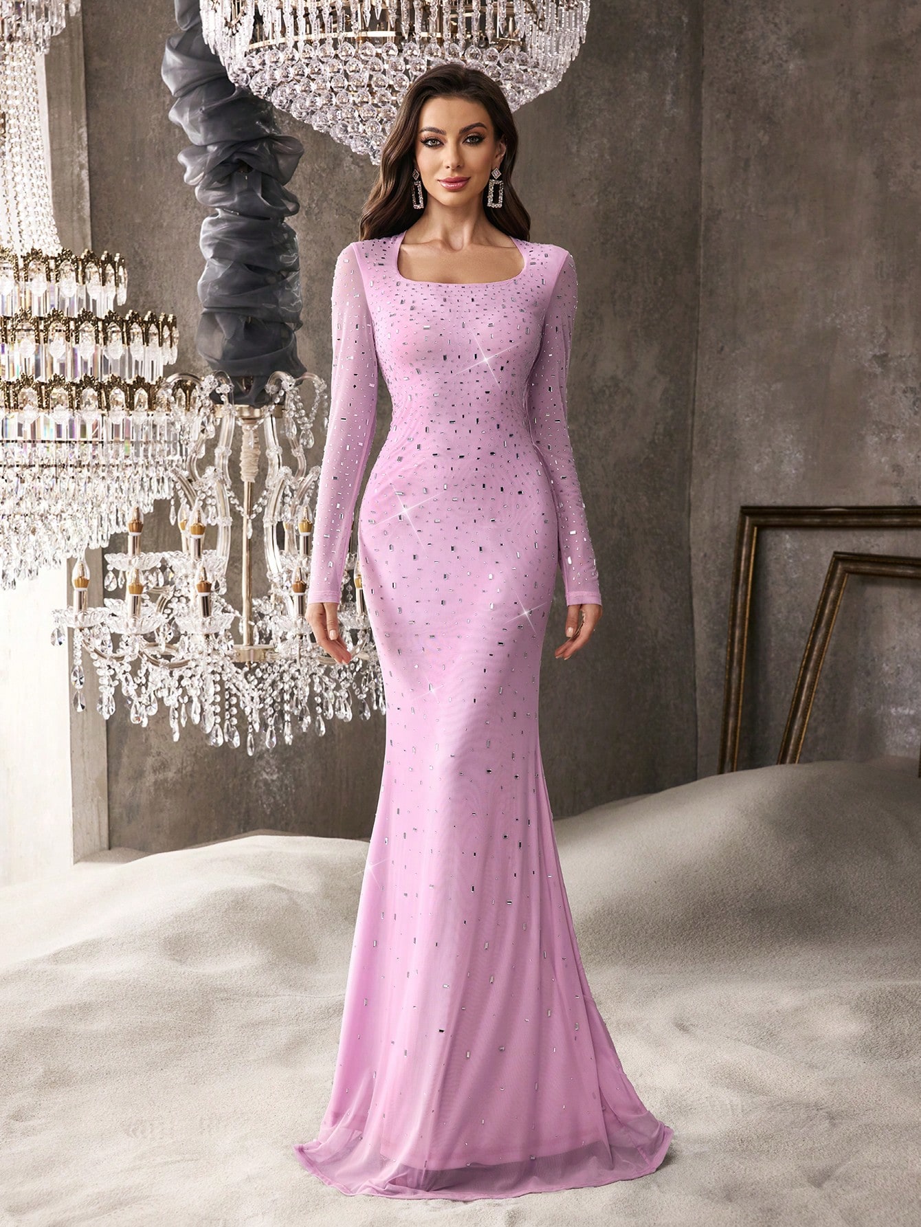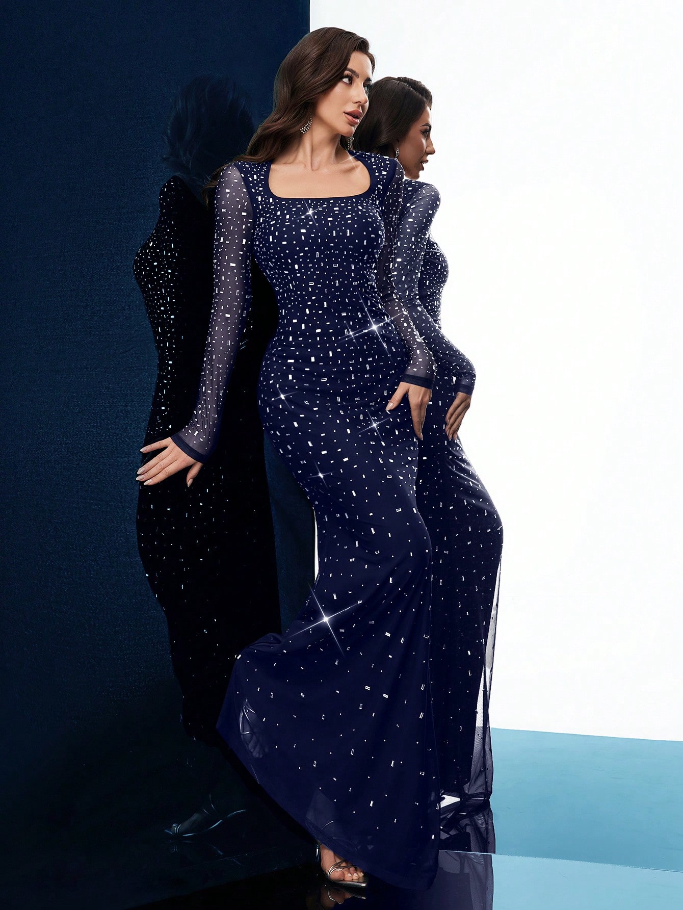 Elegant High-End Rhinestone Embellished Evening Gown, Suitable For Formal Events, Galas, Charity Balls, Carnivals, Black Long Sleeve Mermaid Dress