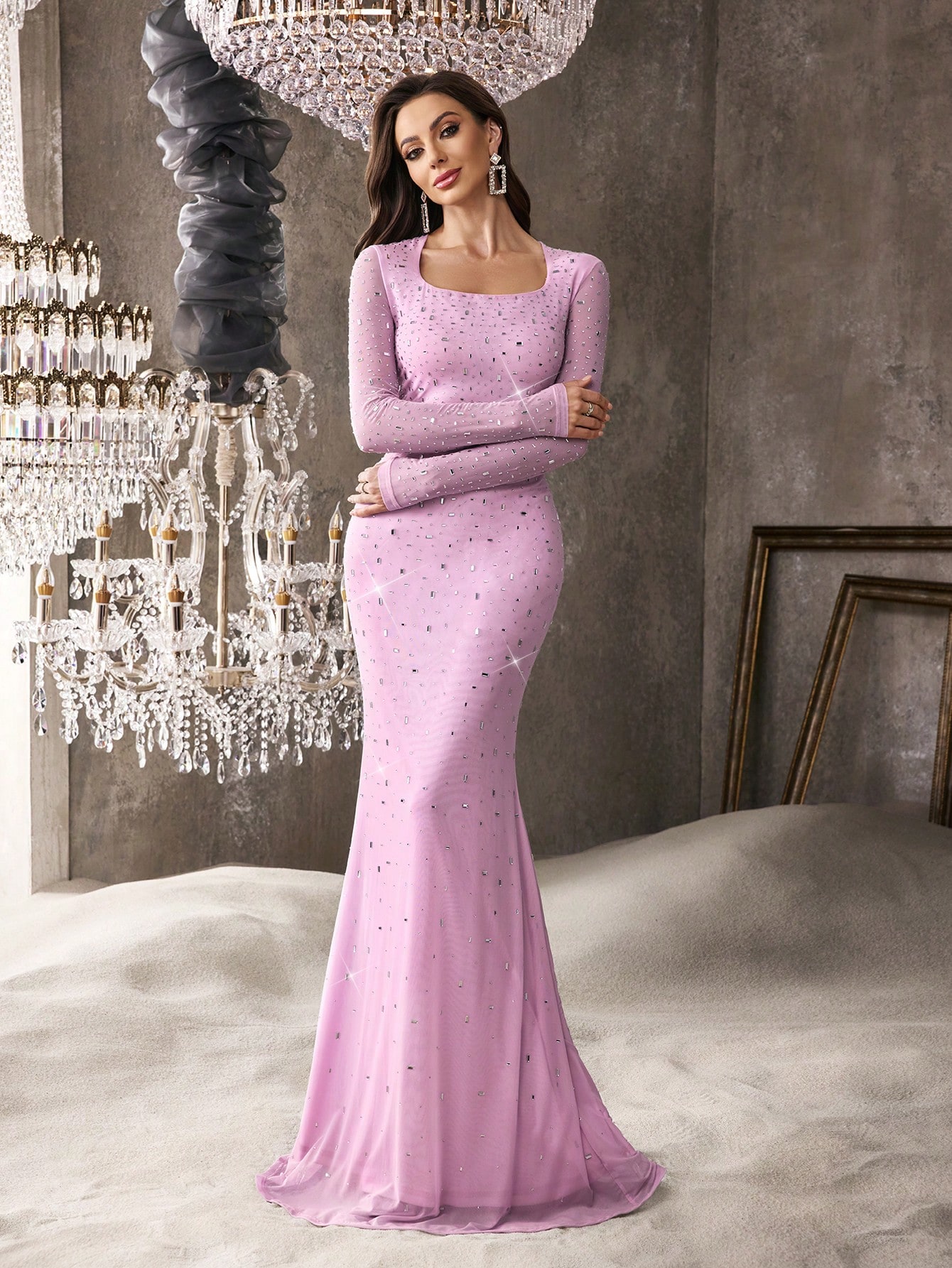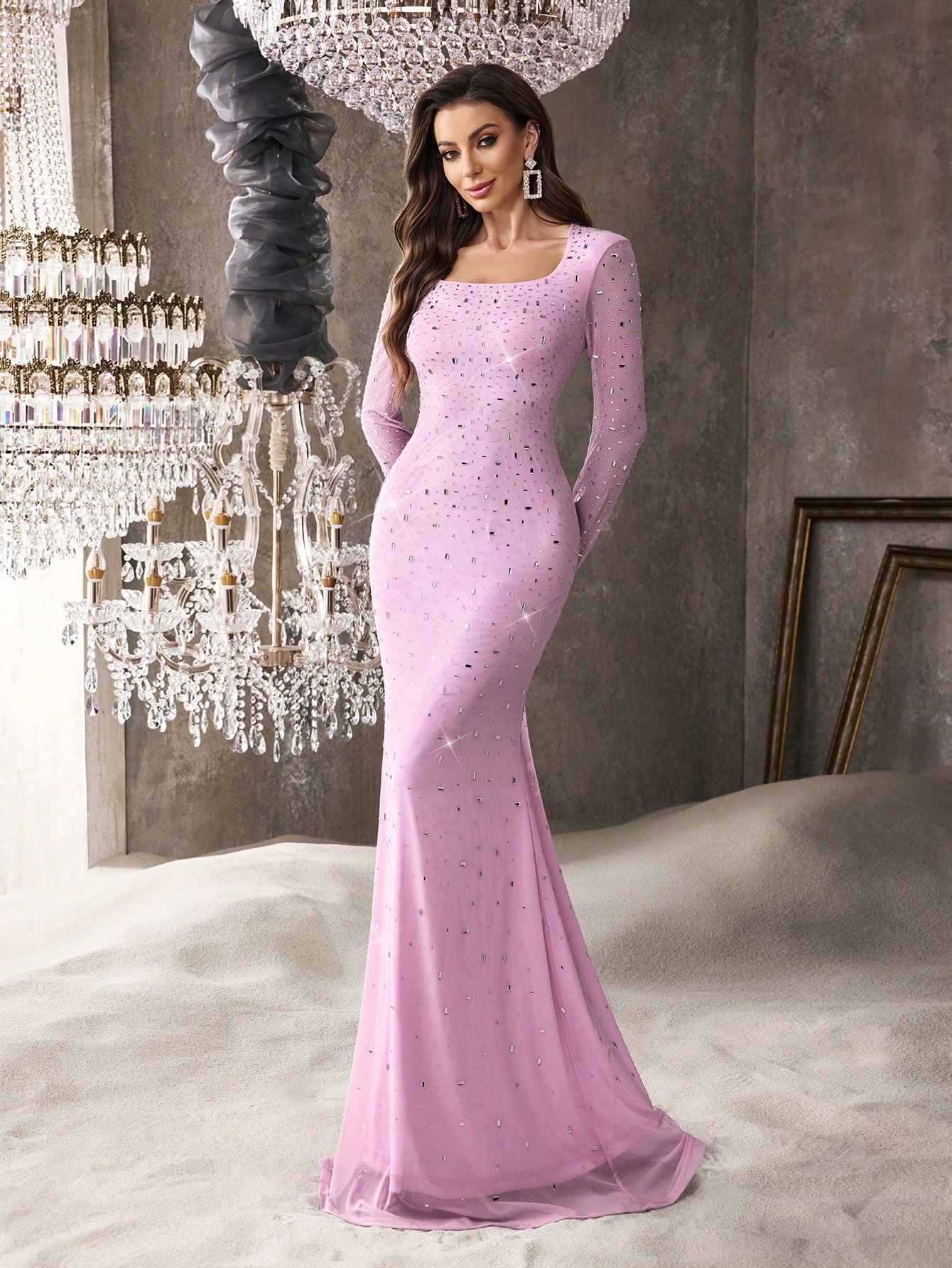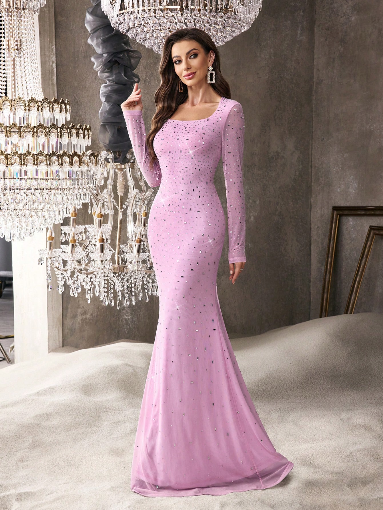 Elegant High-End Rhinestone Embellished Evening Gown, Suitable For Formal Events, Galas, Charity Balls, Carnivals, Black Long Sleeve Mermaid Dress