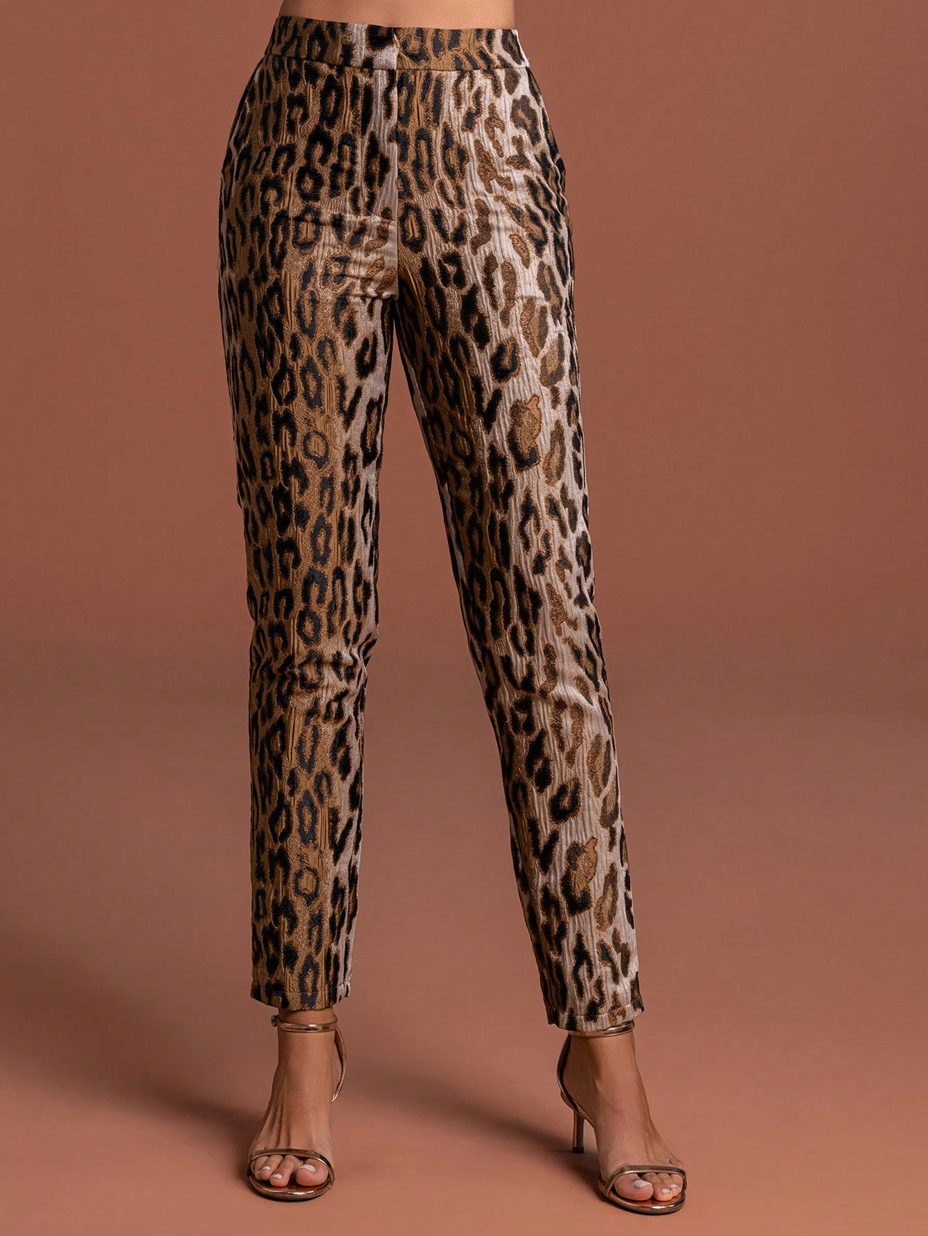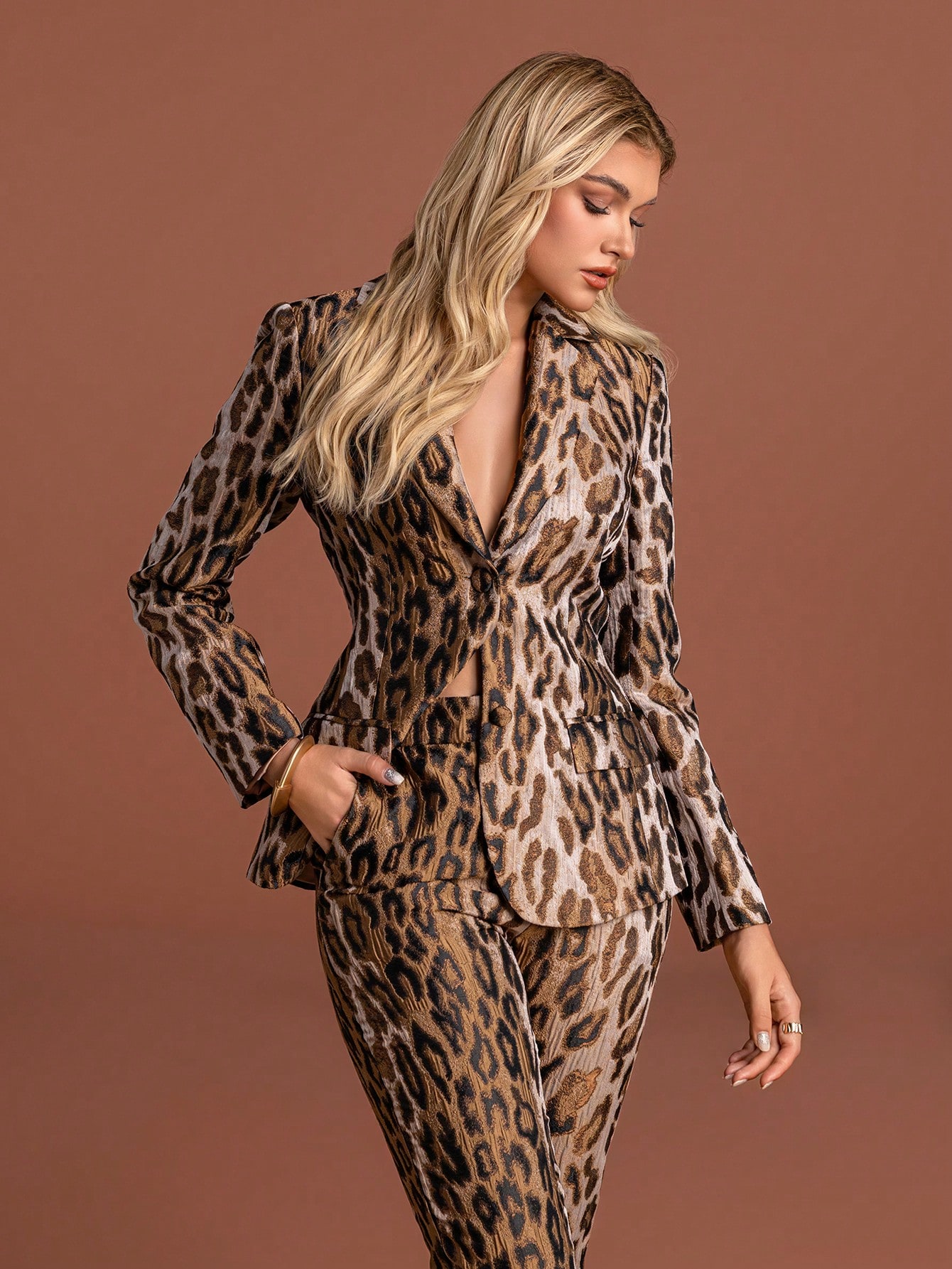 Elegant Leopard Print Women's Suit Set with Collar Buttons Regular Sleeves Non-Stretch Fabric