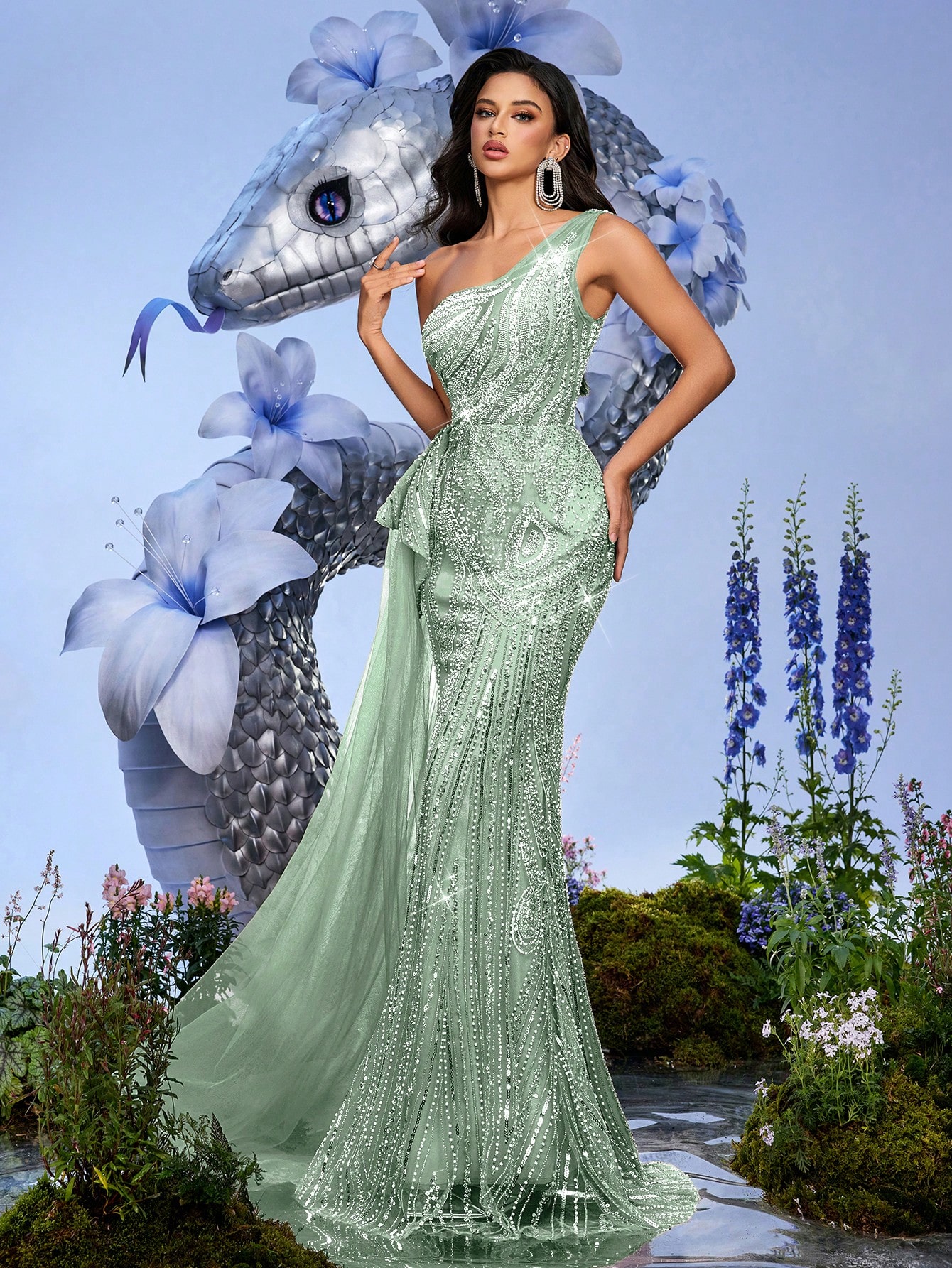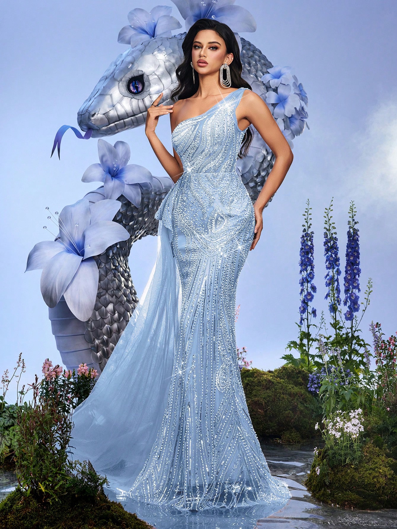 Elegant Sweetheart Pink Beaded One Shoulder Back Tie Women Gown Dress For Dinner Party, Party Night, Cocktail Party (Heavily Embellished)
