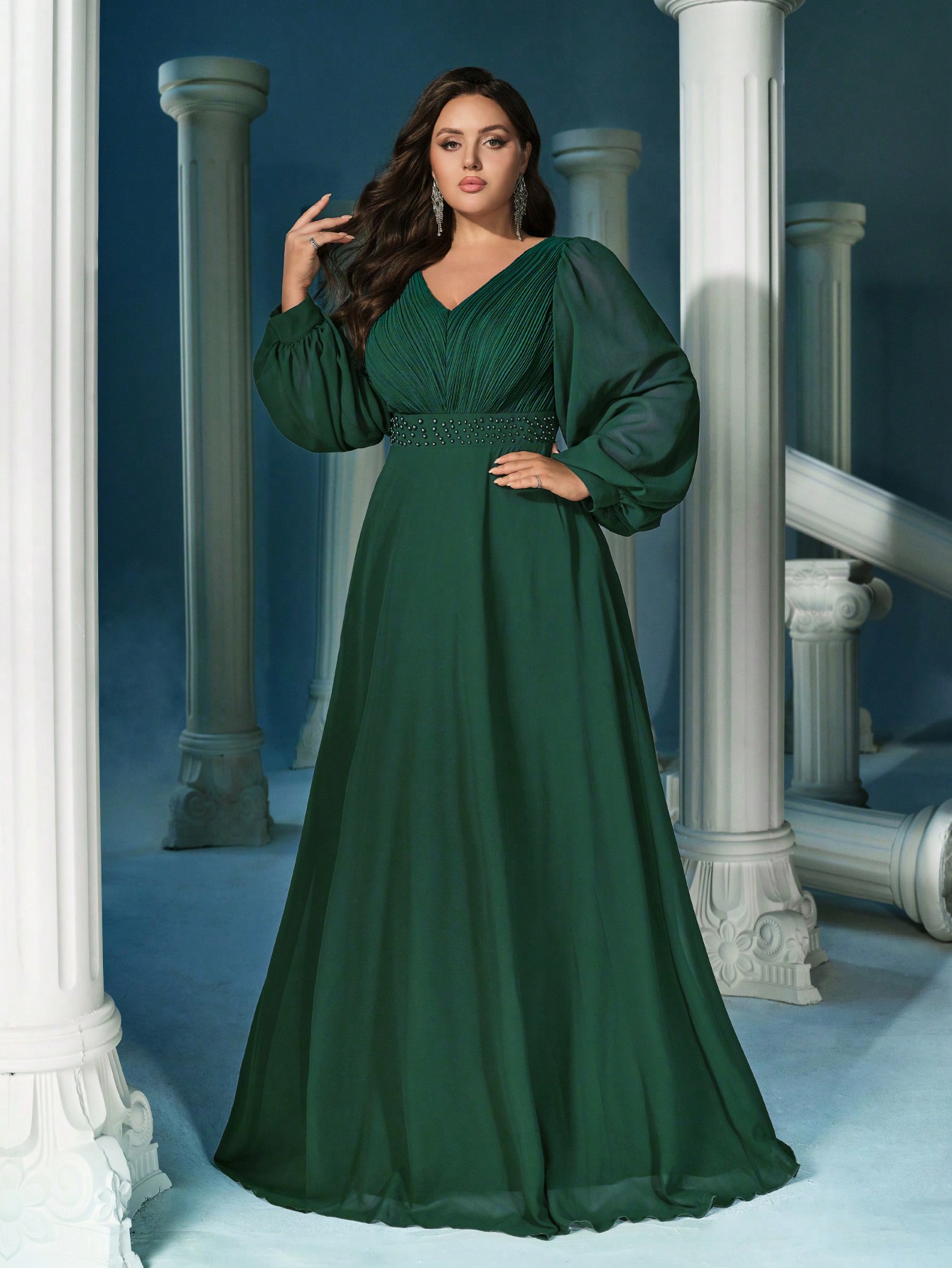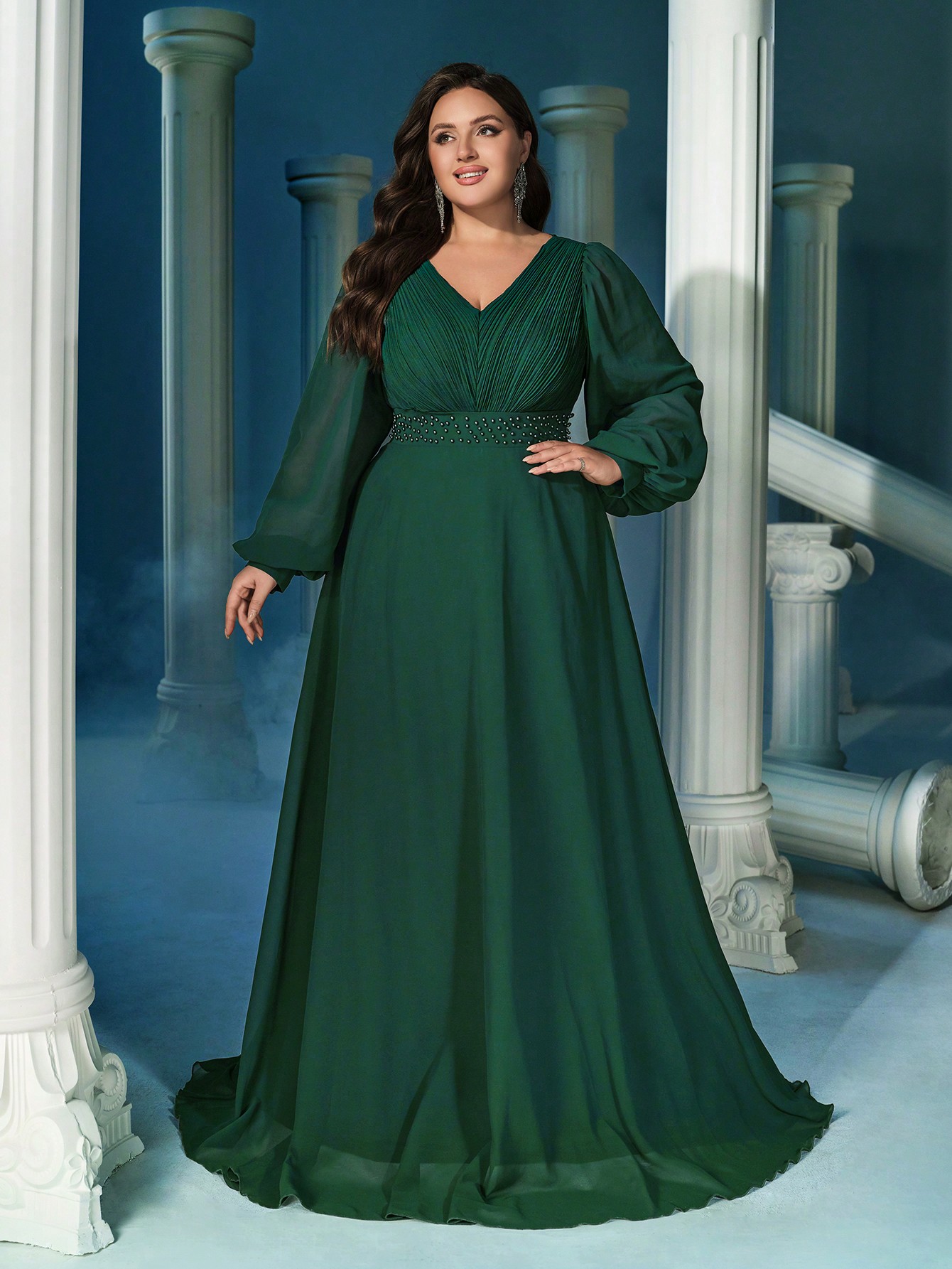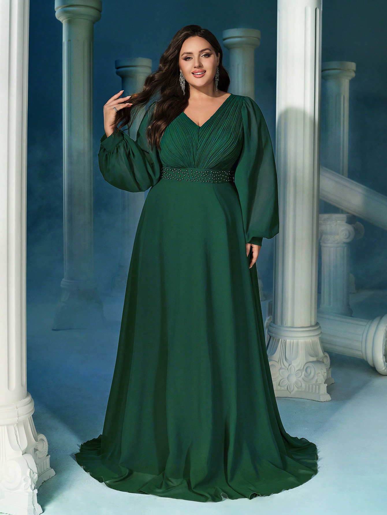 Elegant Temperament Dark Green Plus Size V-Neck Lantern Sleeve Faux Pearl Decoration Waist Gown Dresses