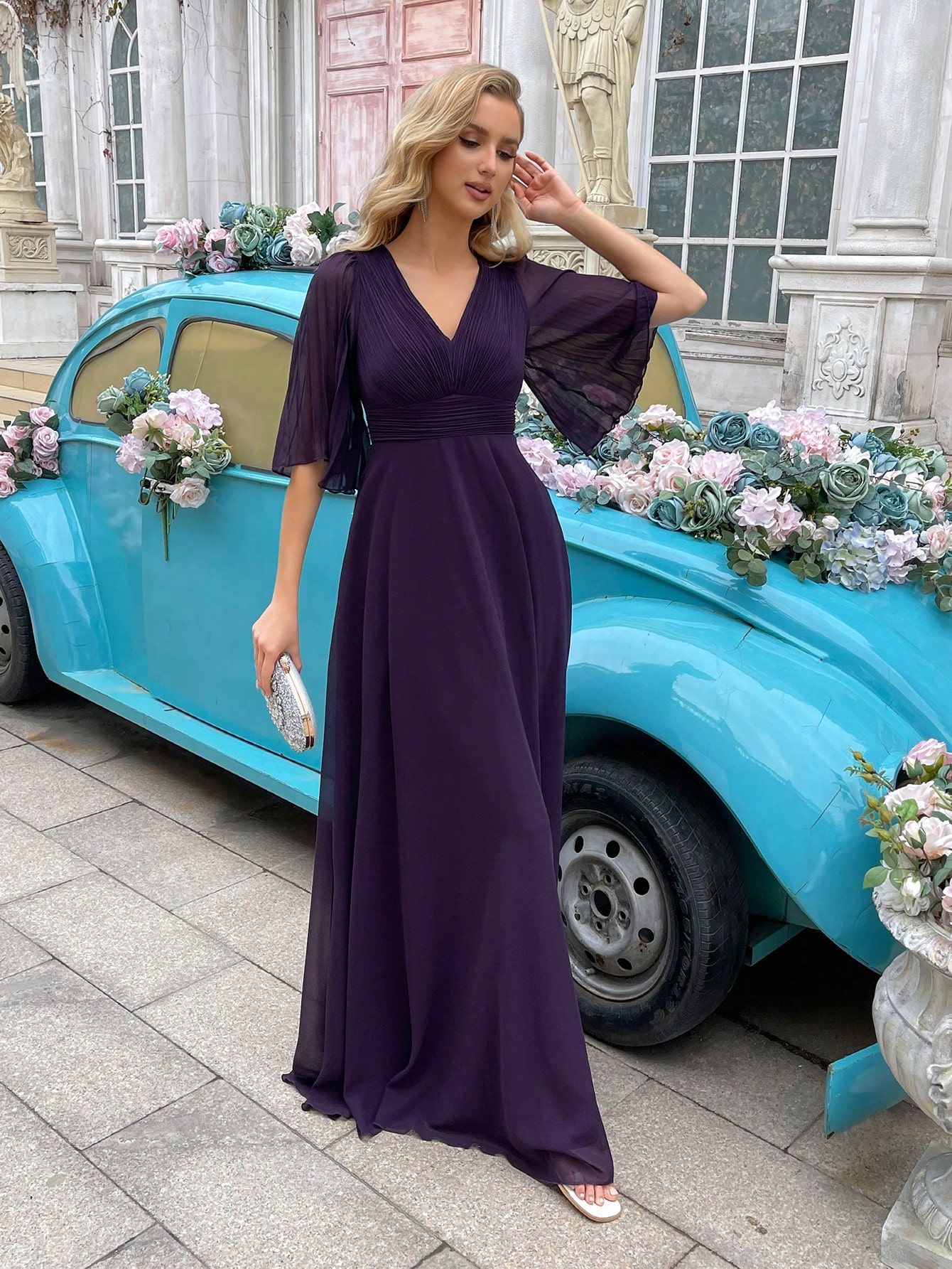 Elegant Temperament Grape Purple V-Neck Ruffle Sleeve Chiffon Bridesmaid Dresses Gown