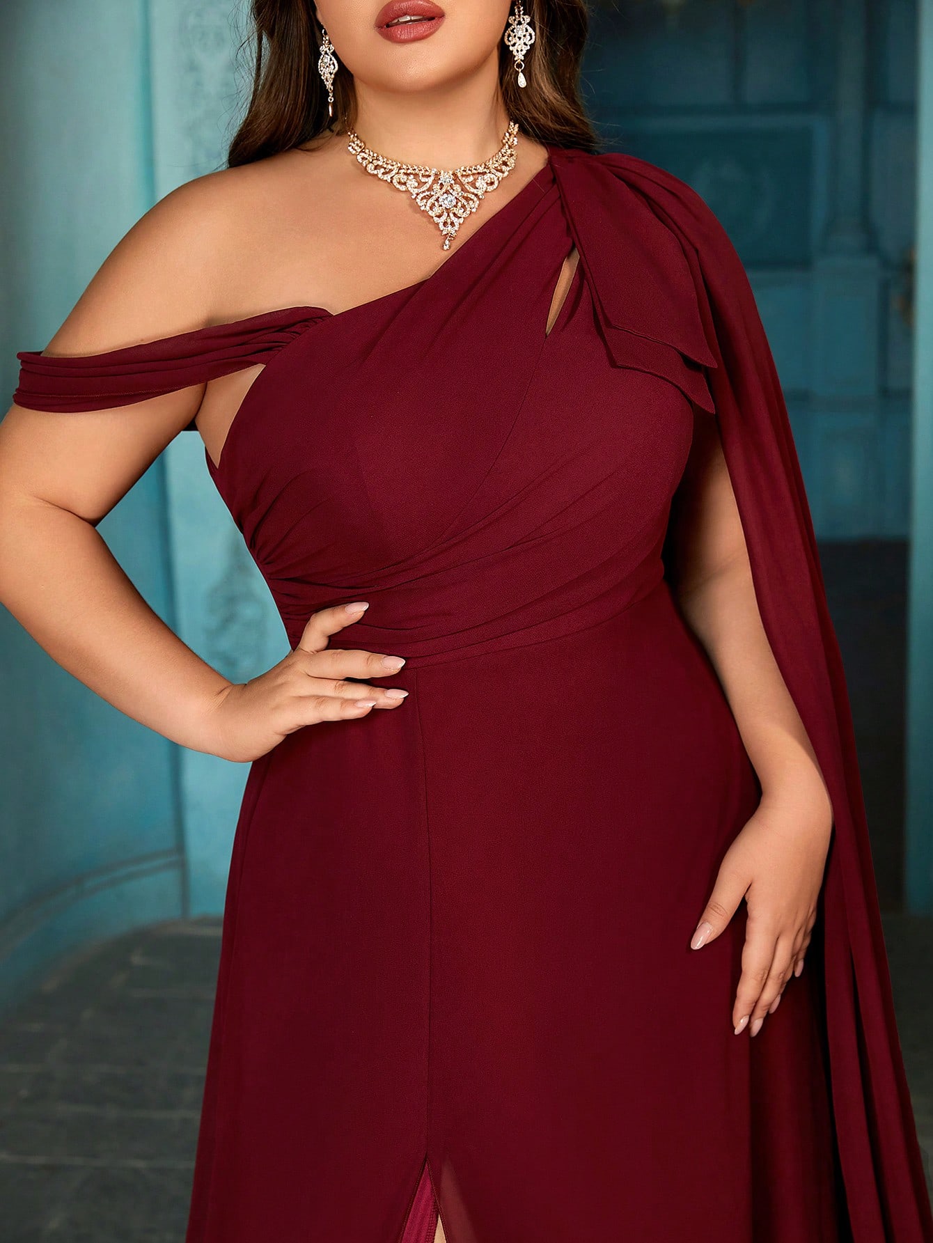 Elegant Temperament Solid Color Plus Size Asymmetric Neckline Slit Bridesmaid Gown Dresses For Wedding, Evening Party