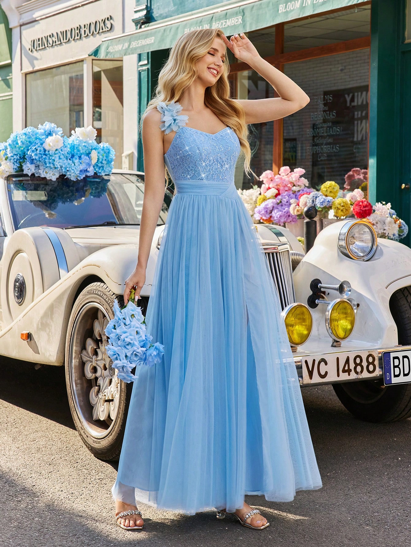 Fairy-like Style Mesh Prom Dresses Lace Wedding Guest Dress Sequin Details Bridesmaid Dress Rose Embellishment Gown For Outdoor Wedding, Party, Cocktail, Birthday Pure Color Women Sleeveless Slit Maxi Formal Dress