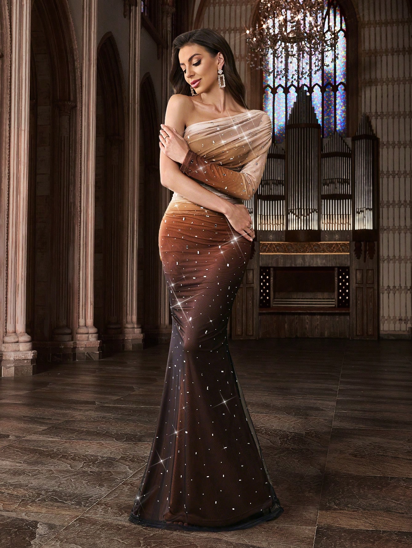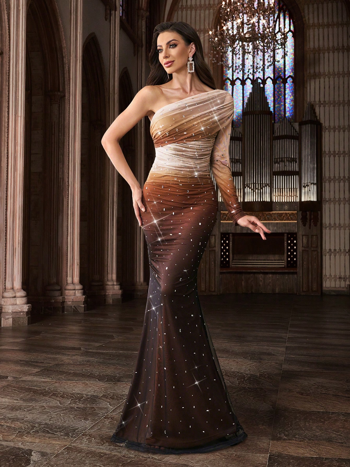 Fashion Design Hot Drill Luxury Party Formal Dress Upscale Rhinestone Women Evening Gown For Charity Prom, Galas, Dinner Party, Award Ceremony, Fiesta, Anniversary Celebration Gradient Color Mesh Fabric Long Sleeve Gowns