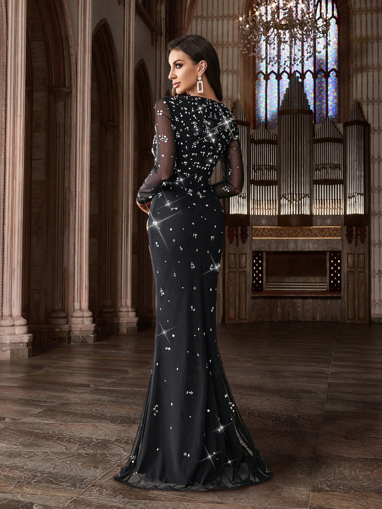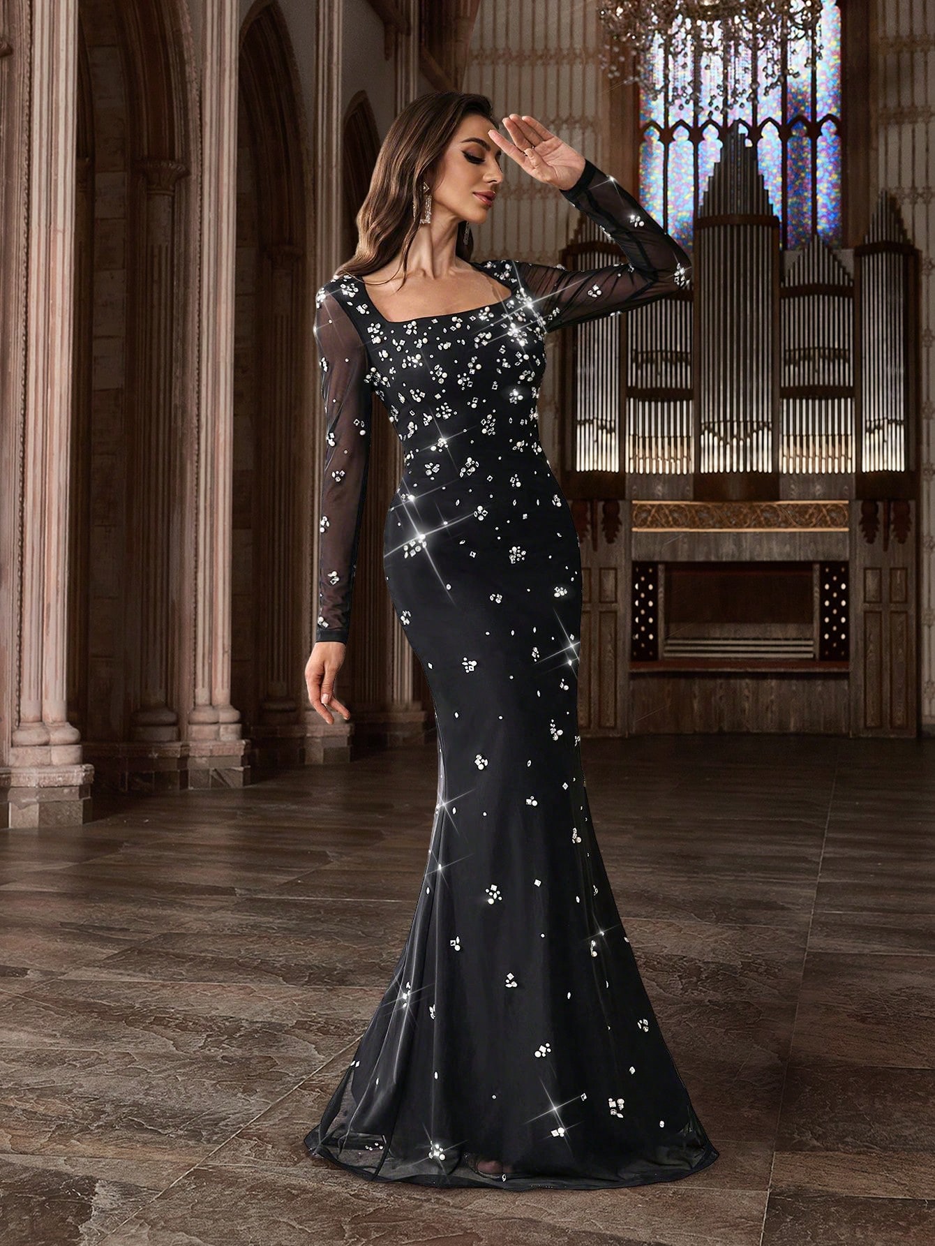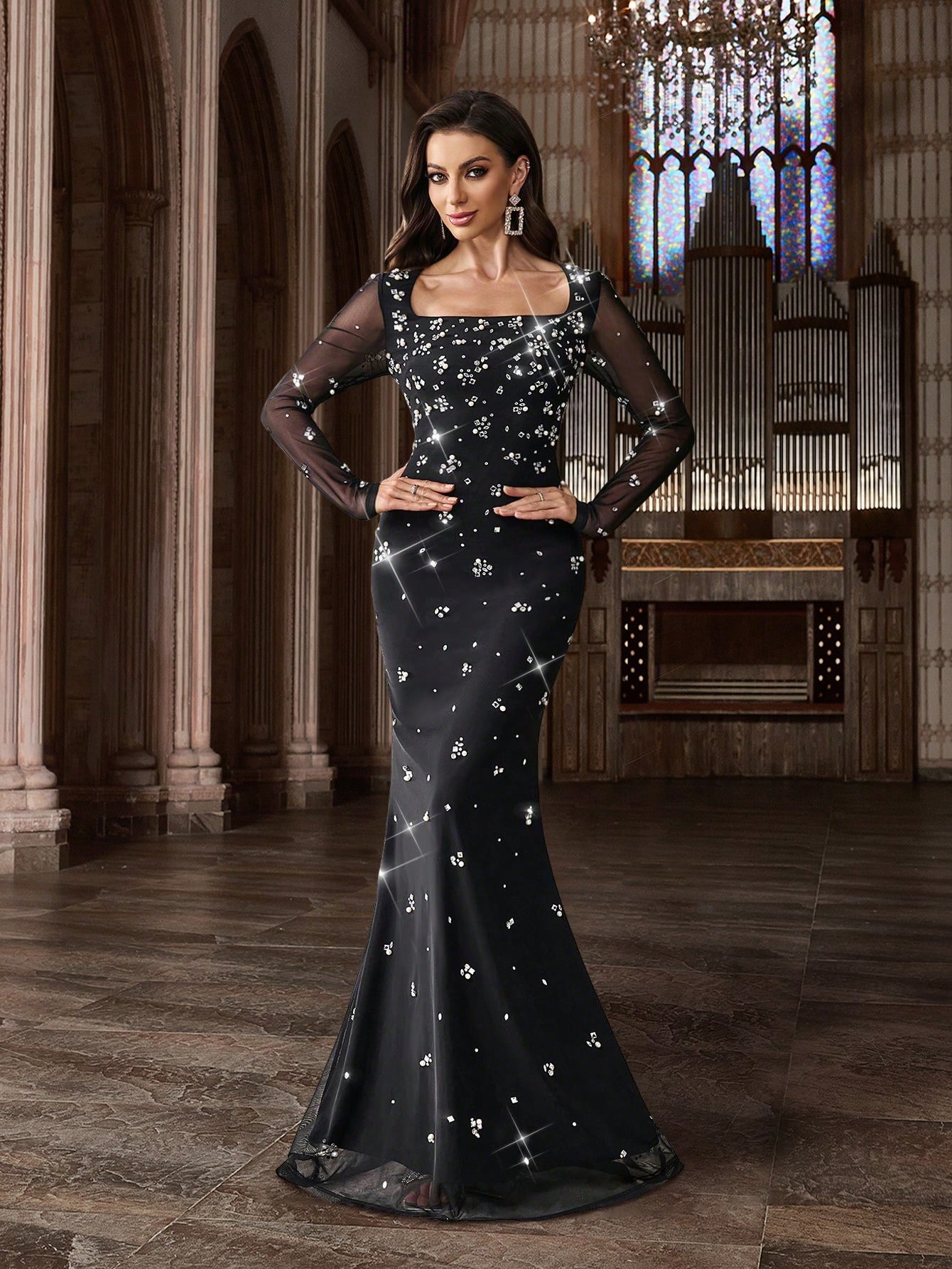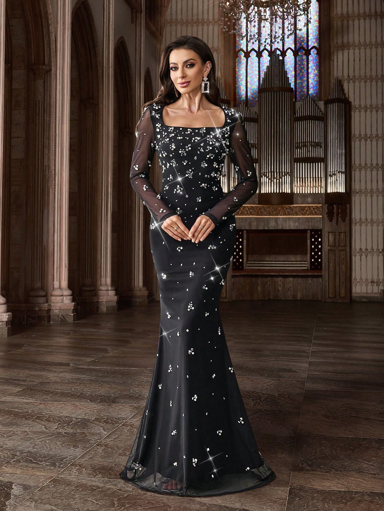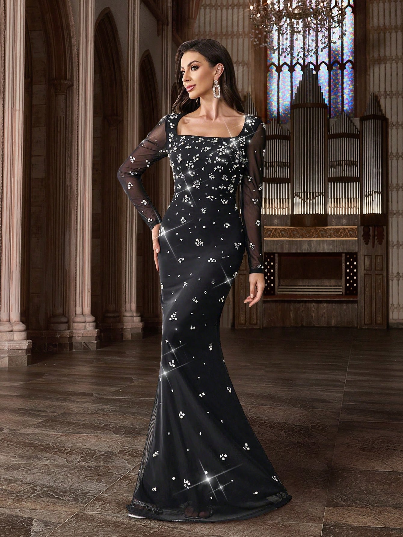 Fashion Design Hot Drill Rhinestone Women Evening Gown Chic Pearl Formal Dress For Cocktail Party, Birthday Party, Galas, Award Ceremony, Fiesta, Dinner Party Black Long Sleeve Slim Square Neck Maxi Long Dresses