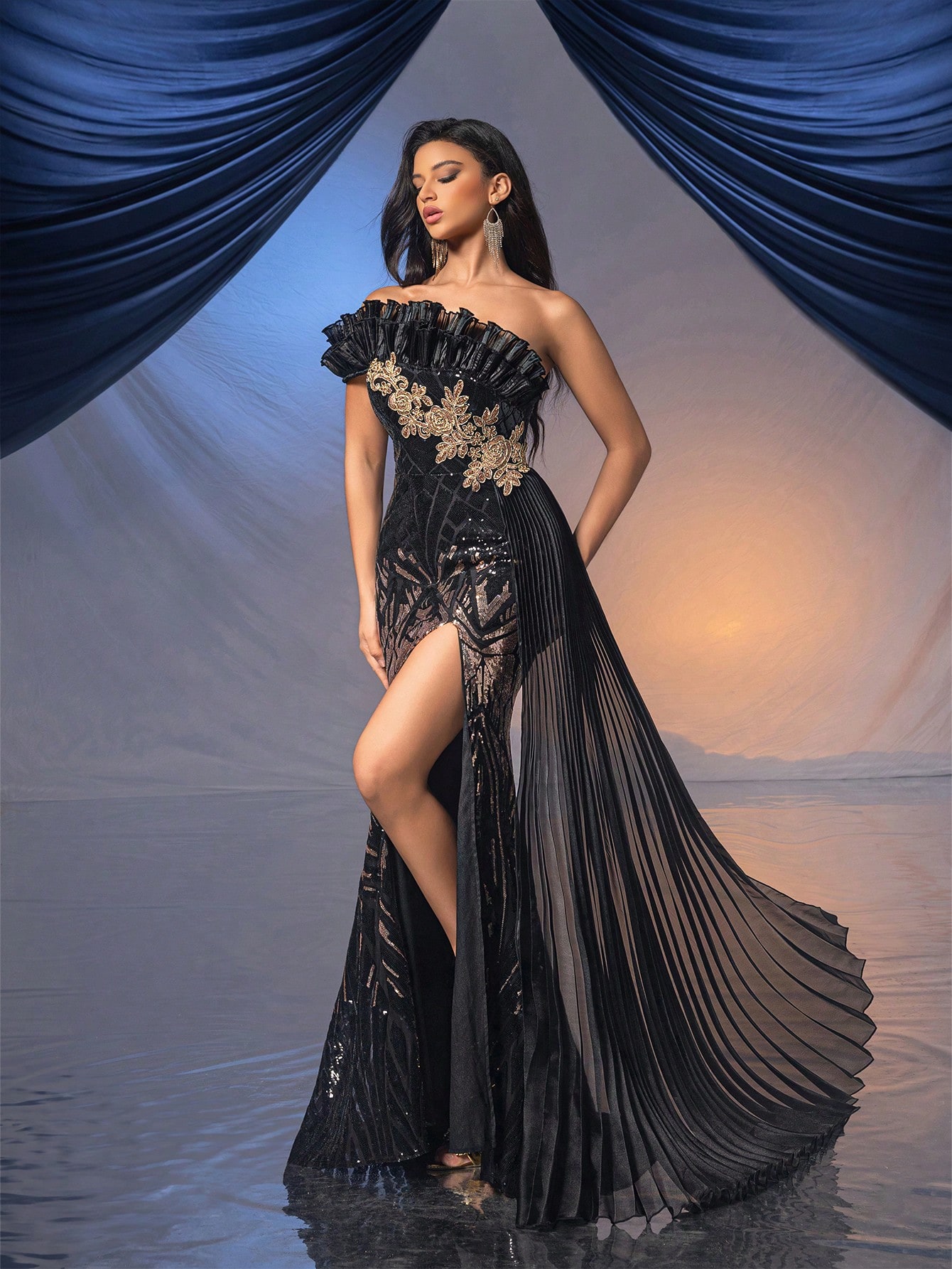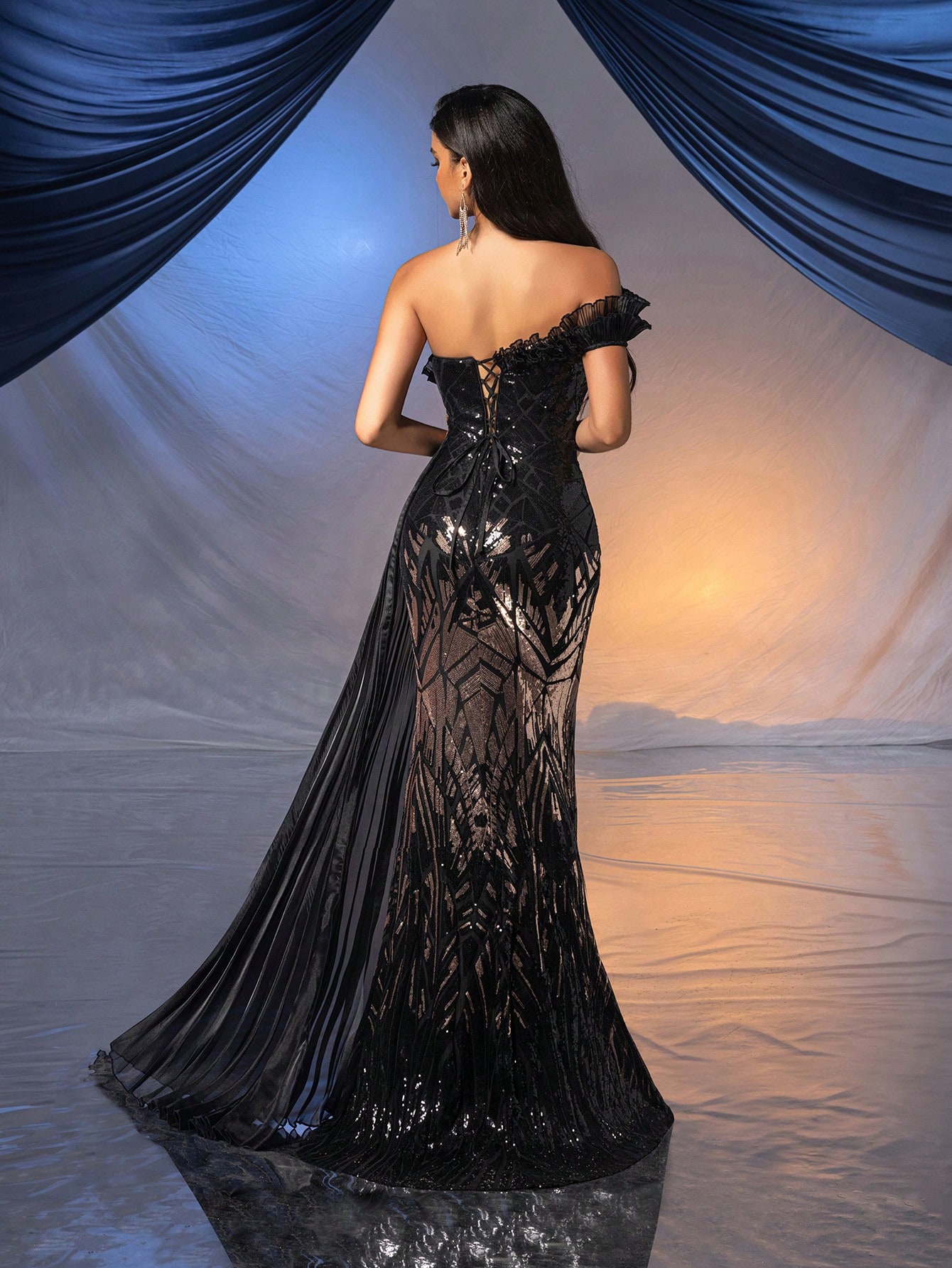Glamorous Upscale Beaded Formal Dress Women Elegant Evening Gown For Dinner Party, Birthday Party, Galas, Fiesta, Charity Prom, Anniversary Celebration Black Mesh Ruffle One Shoulder Fishtail Hem Graduation Dresses
