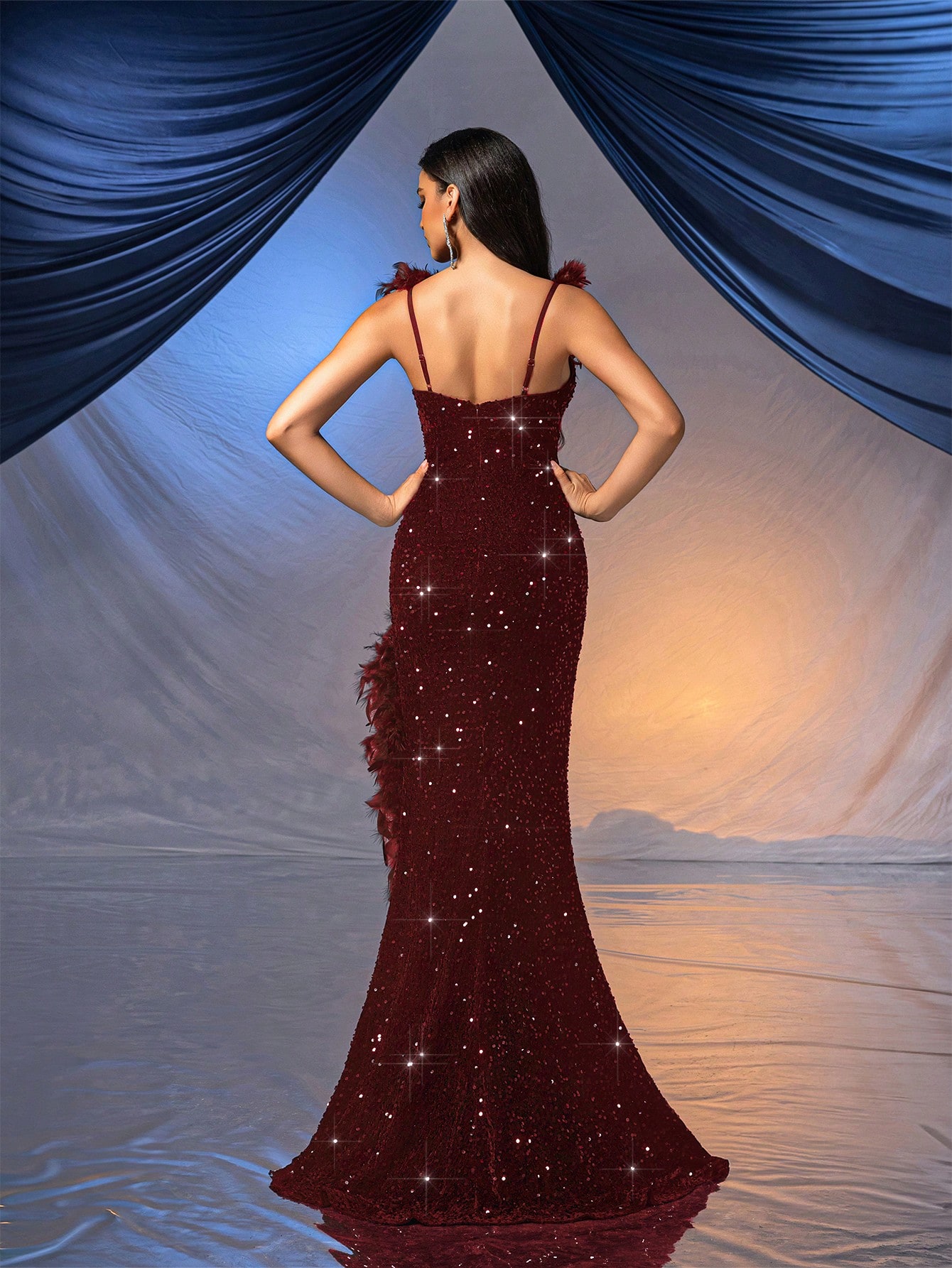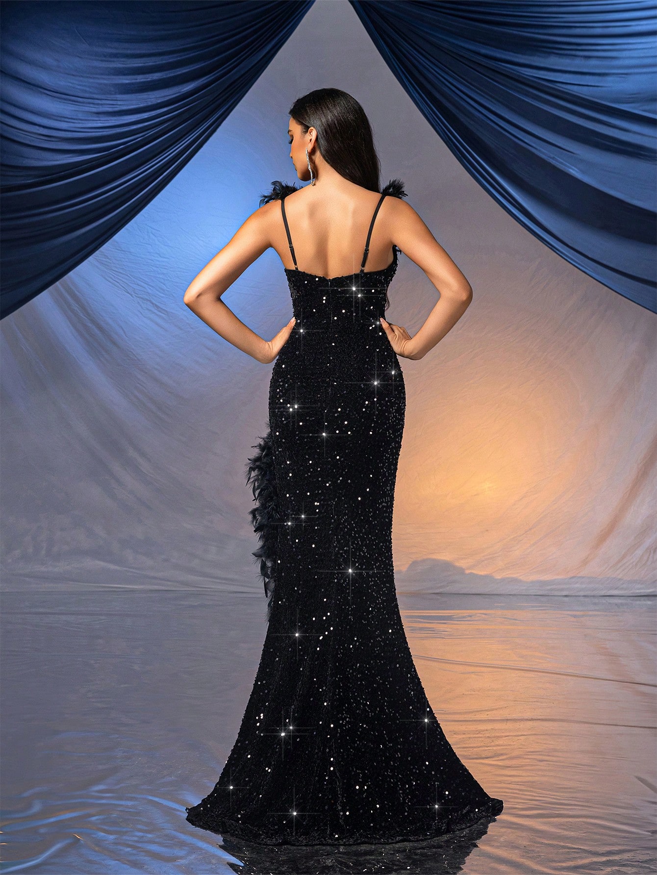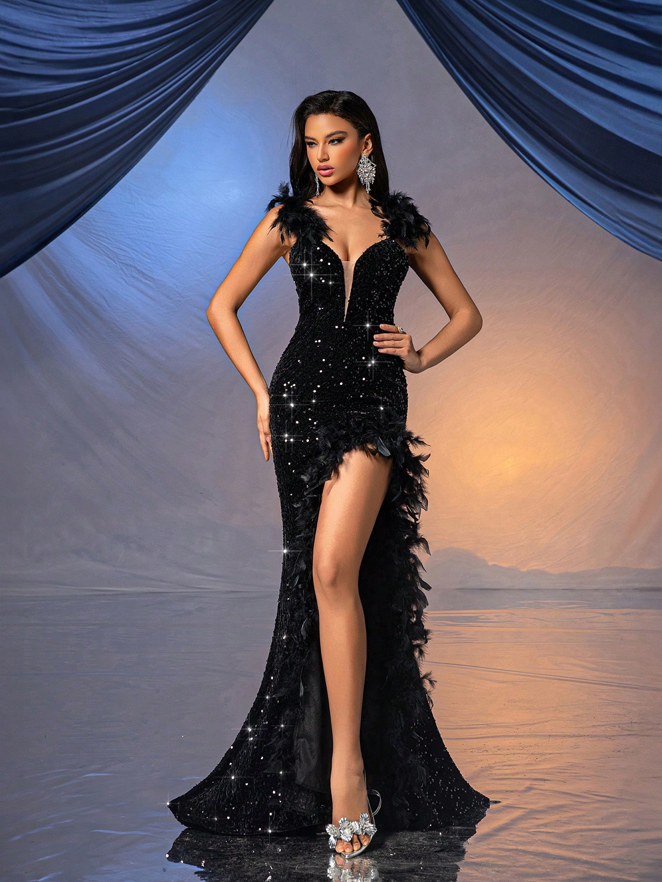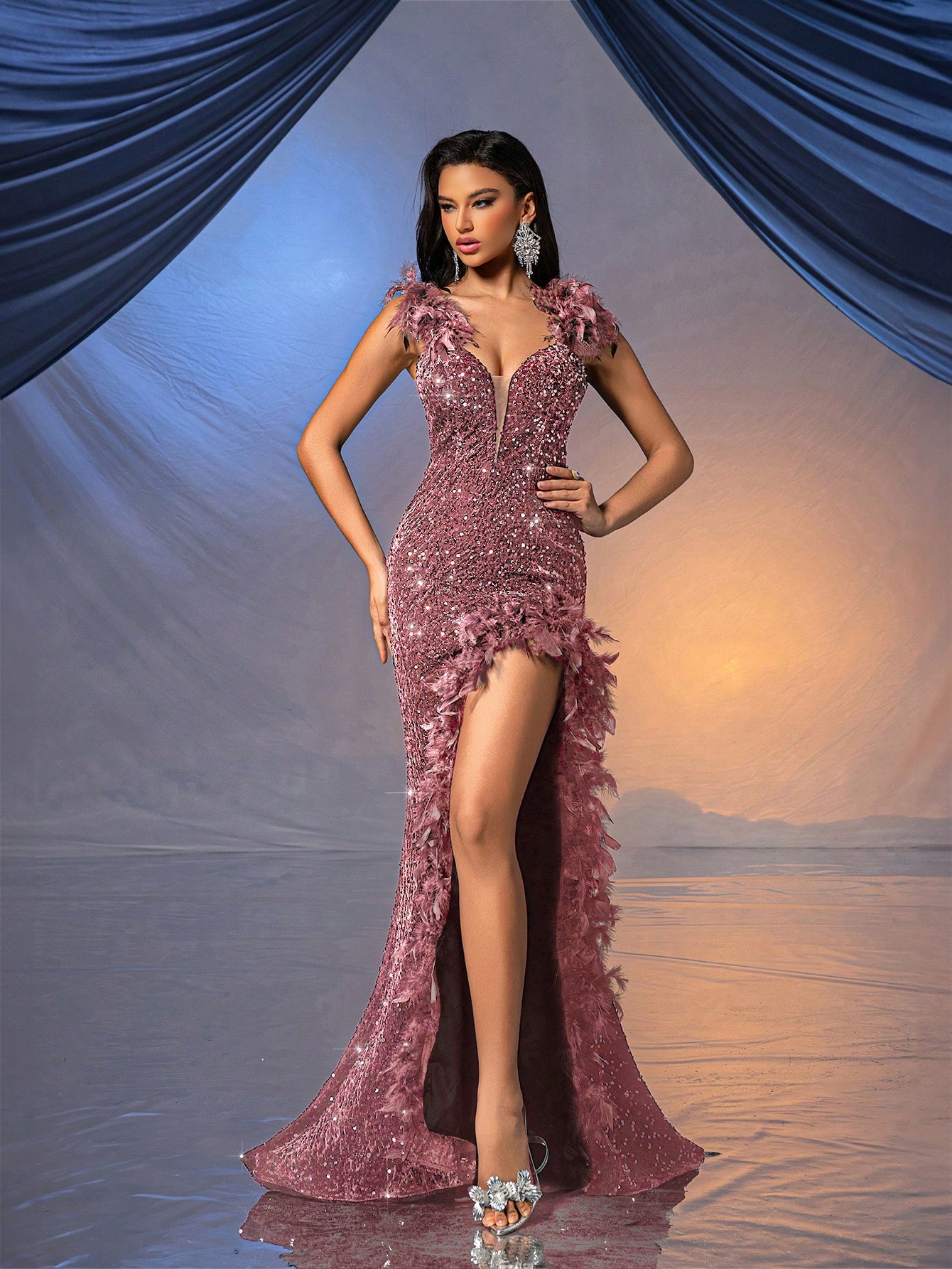 Glamorous Women Sequins Formal Dress Party Evening Gown Summer Long Dresses For Birthday Party, Prom, Cocktail Party, Dinner, Galas, Anniversary Celebration Deep V Neck Slit Gowns Graduation Outfit
